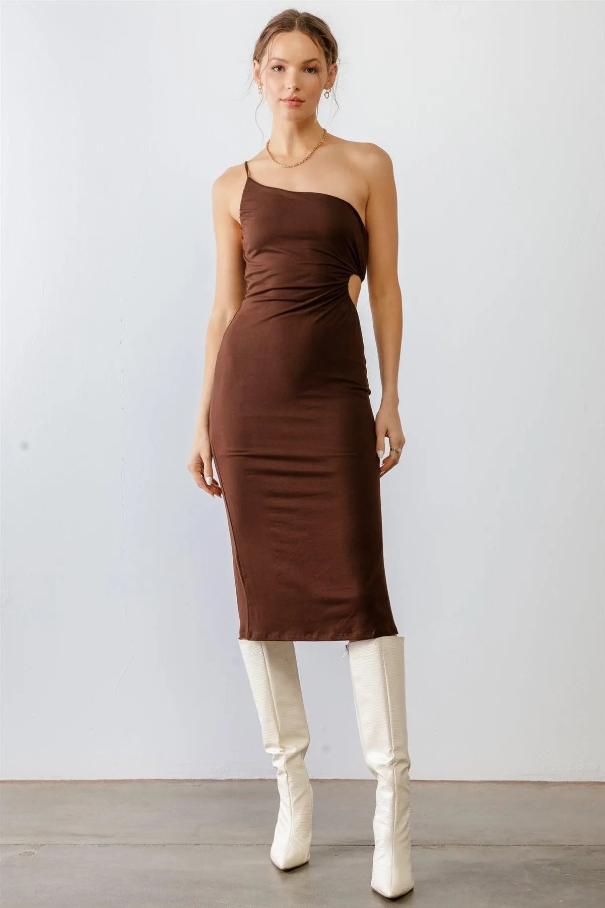 Brown One Shoulder Cut-Out Side Midi Dress /3-2-1