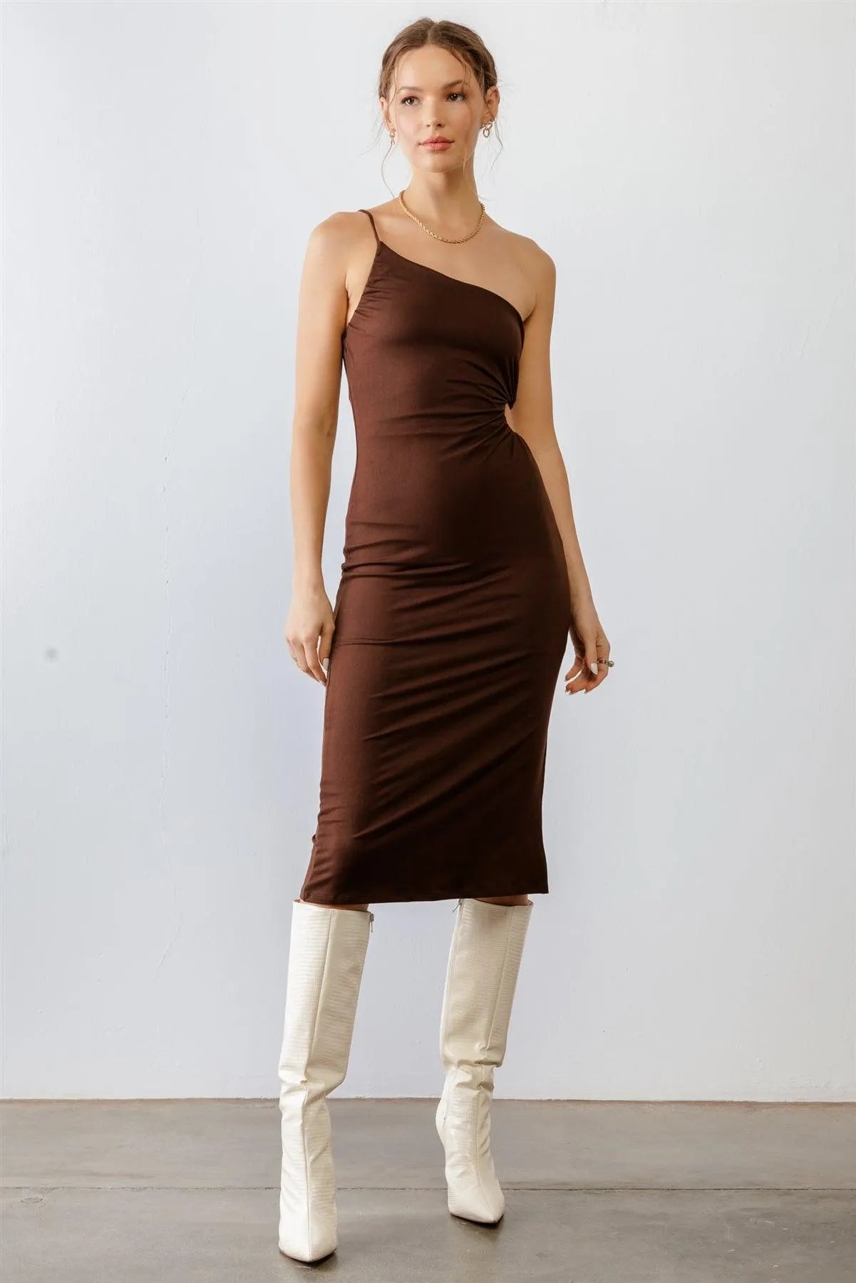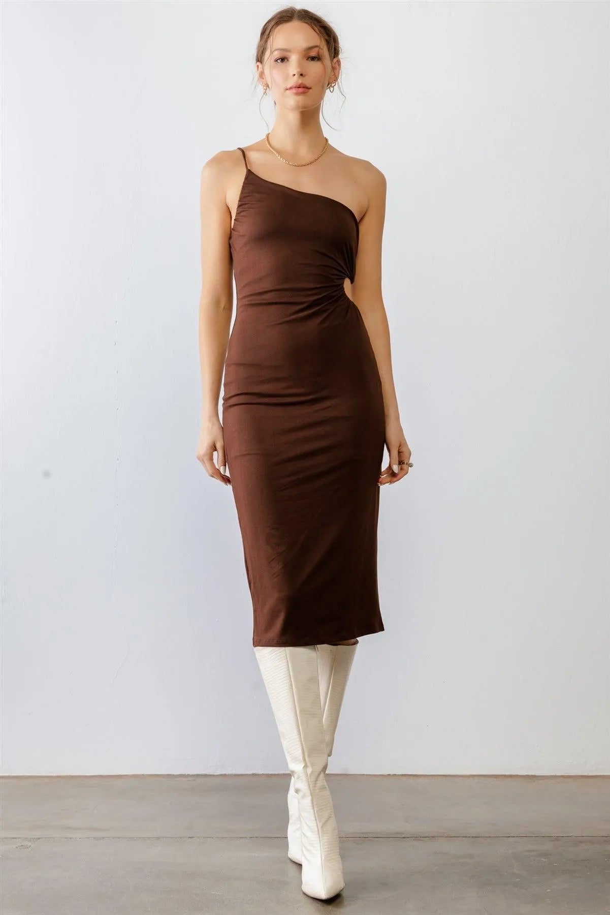 Brown One Shoulder Cut-Out Side Midi Dress /4-3