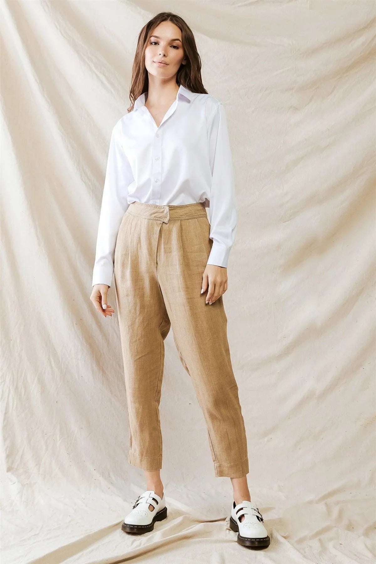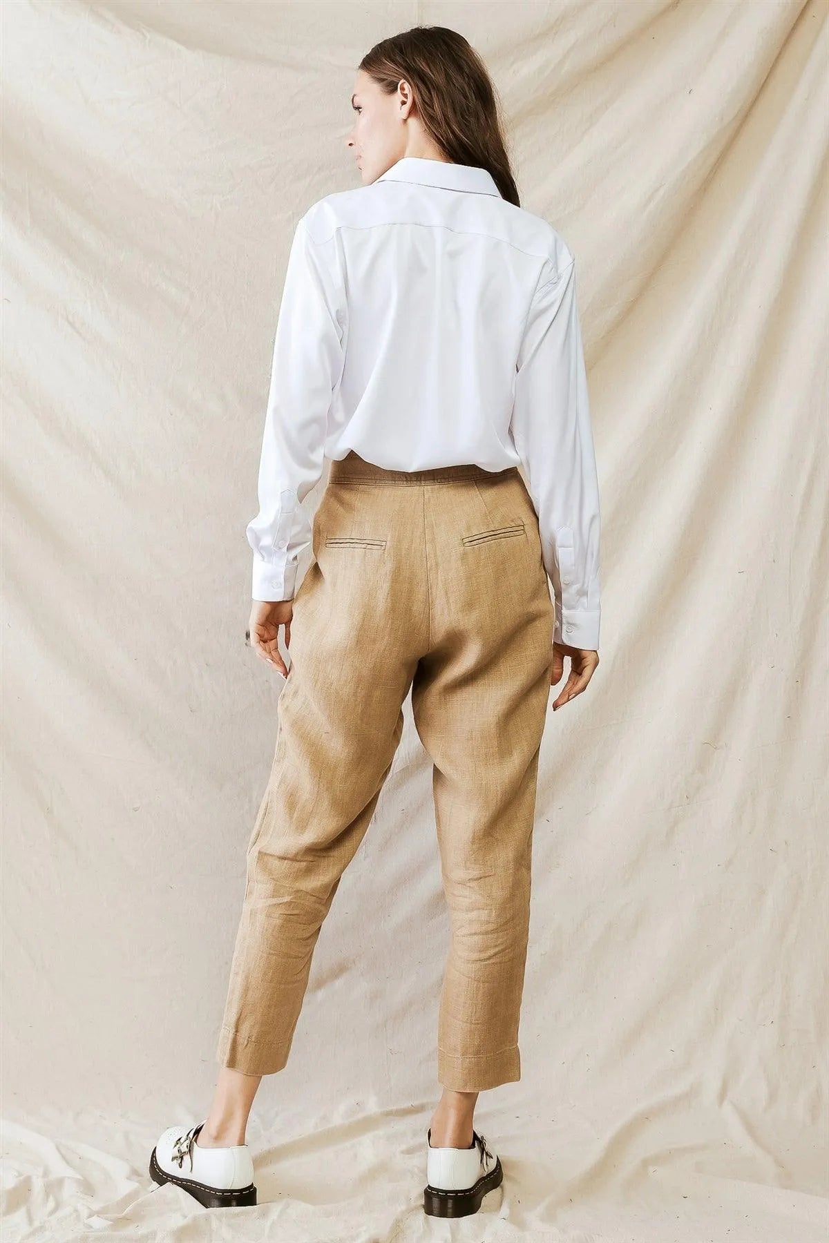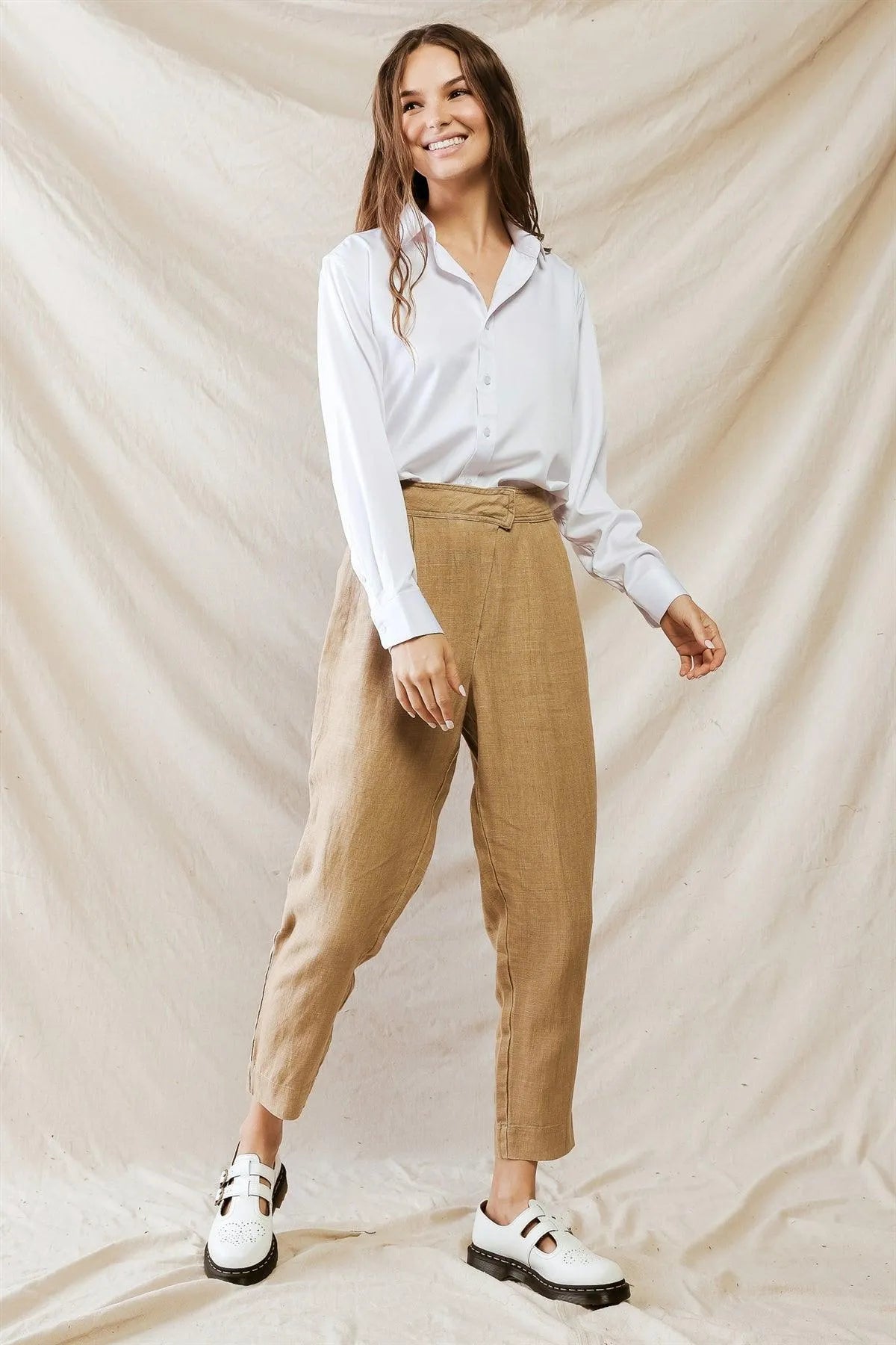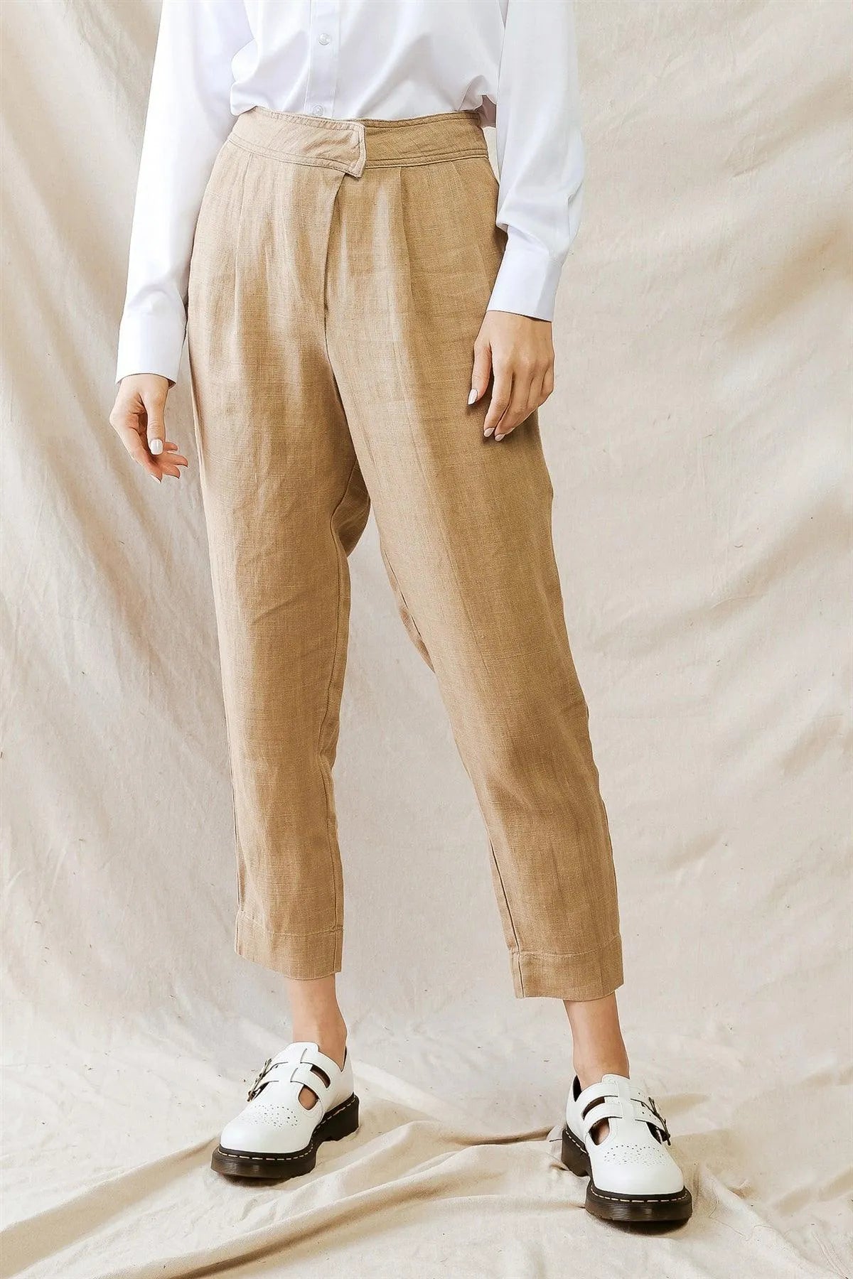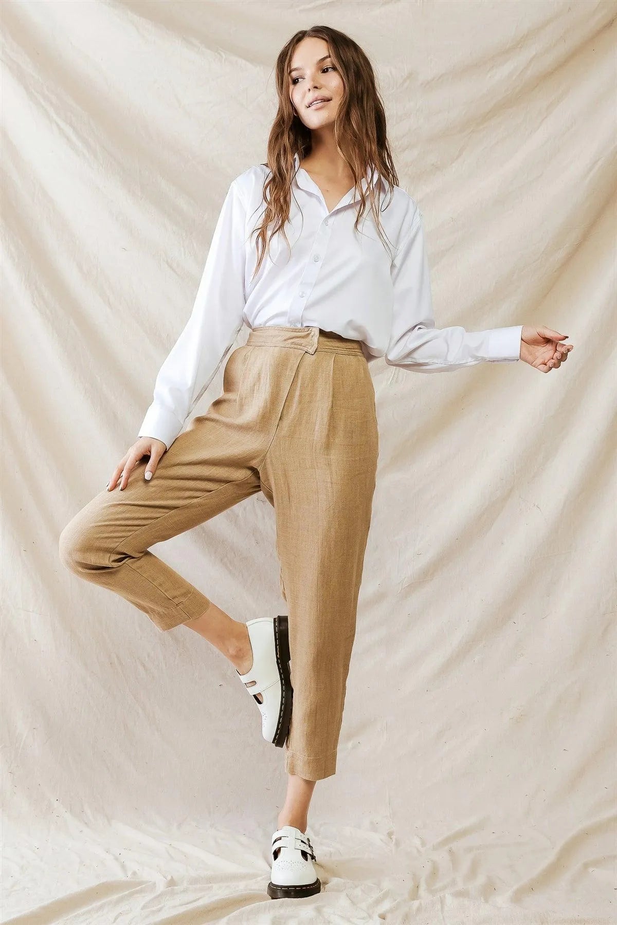 🖤 Item Features: Brown, pleated, high wrap waist with hidden zip-up & button closure, back two fake pockets, non-stretchy, non-sheer, unlined, stylish, casual, wardrobe must have