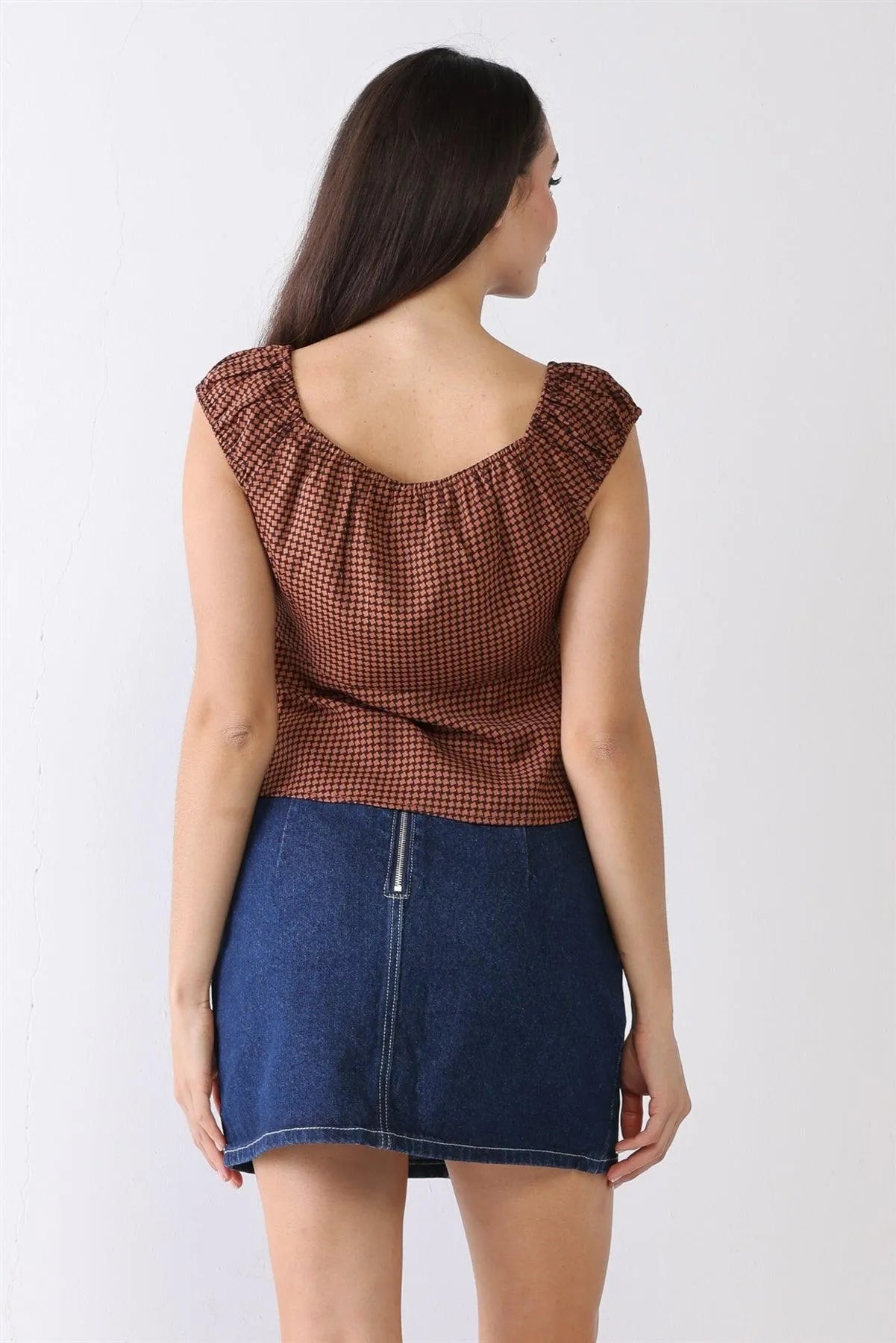 Brown & Tan Geometrical Print Self-Tie Neck Cut-Out Detail Sleeveless Top /1-3-2