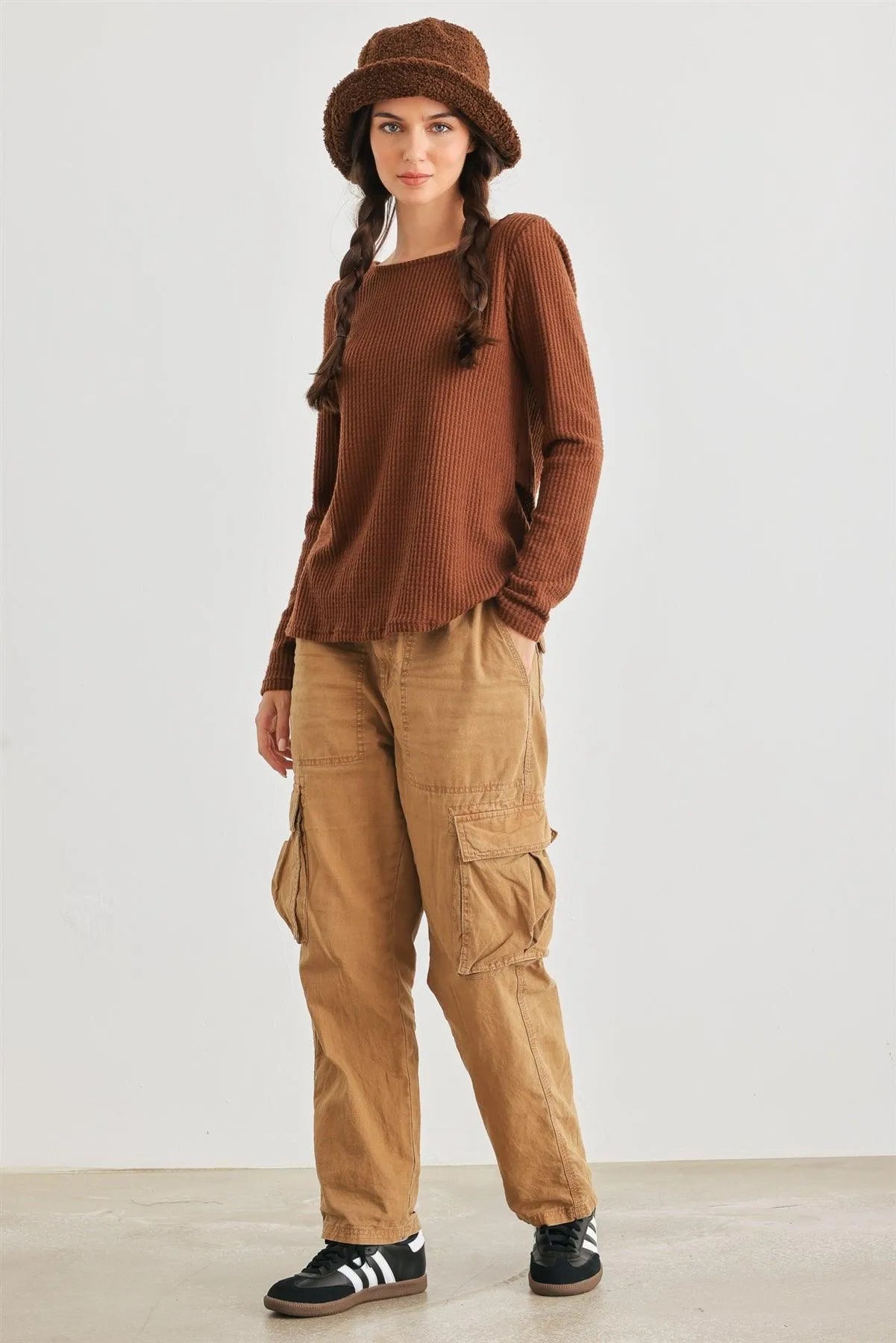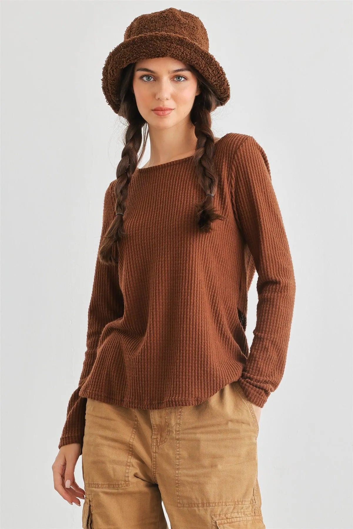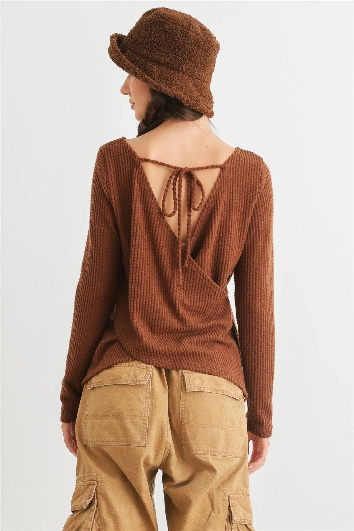 🖤 Item Features: Brown, waffle knit material, round neckline, long sleeves, wrap & self-tie back, semi-stretchy, not see through, unlined, casual, cute, warm, cozy, girlish, fall winter.