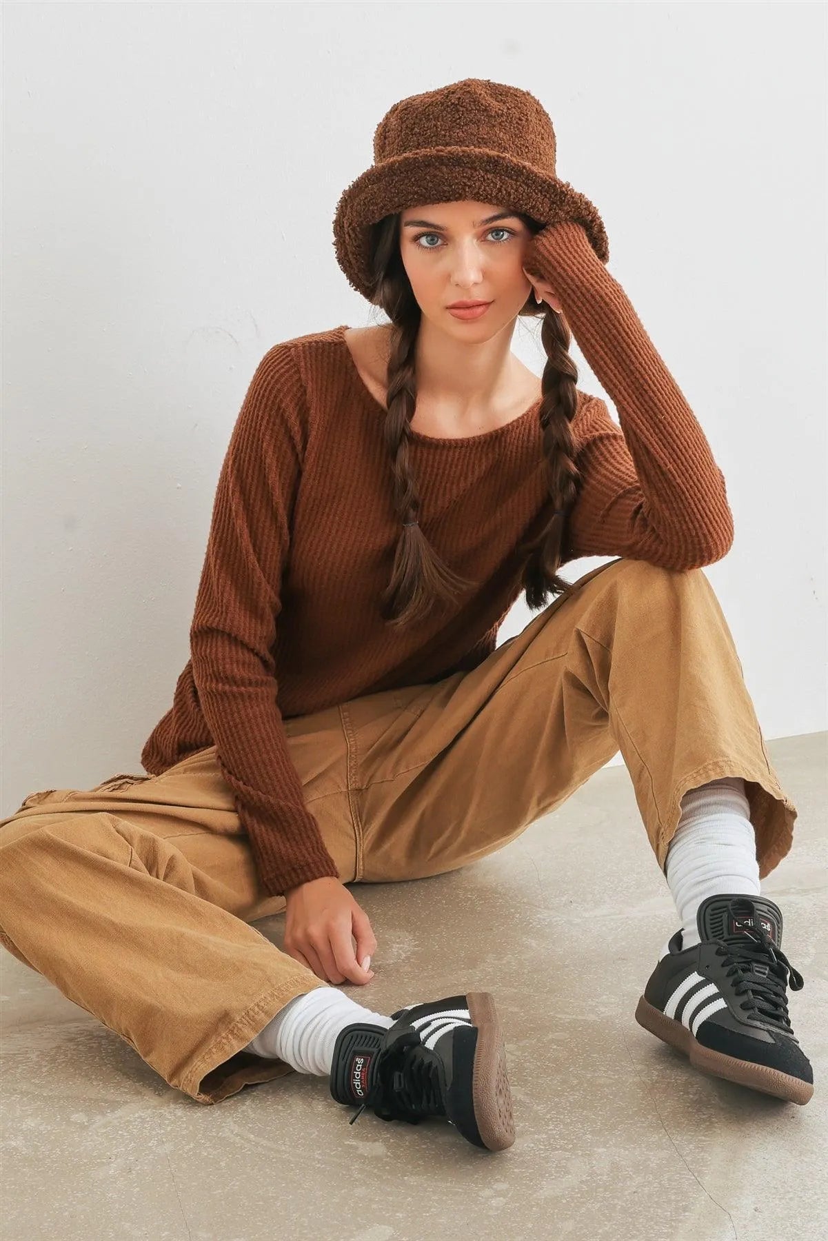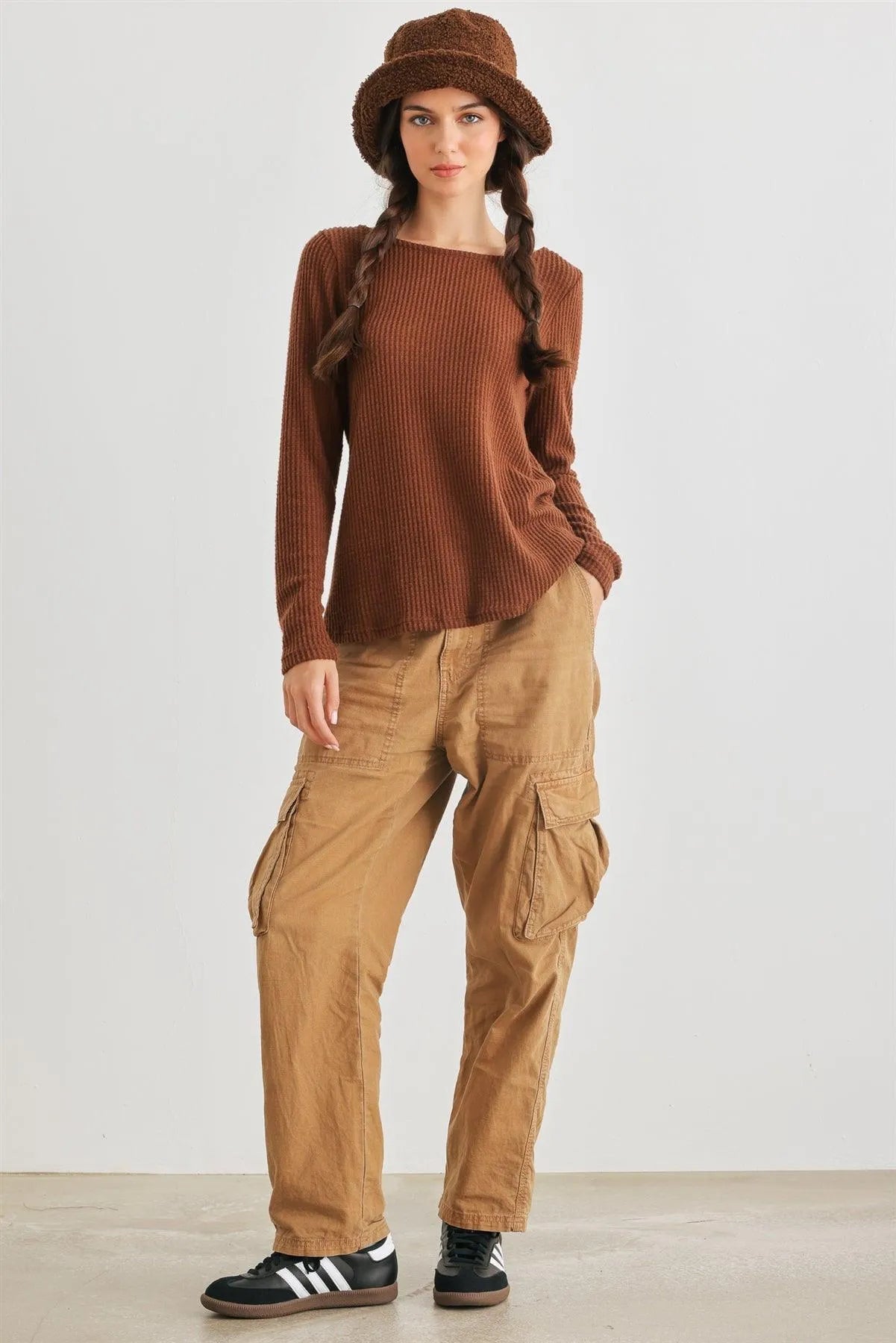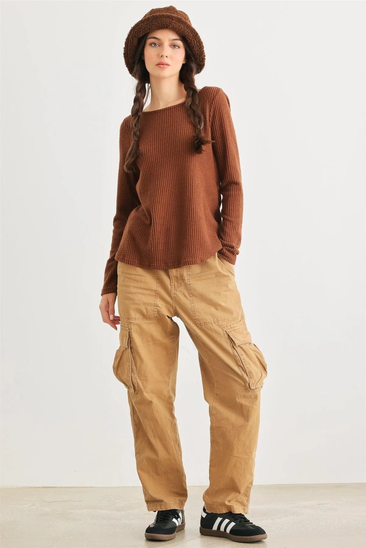 🖤 Item Features: Brown, waffle knit material, round neckline, long sleeves, wrap & self-tie back, semi-stretchy, not see through, unlined, casual, cute, warm, cozy, girlish, fall winter.