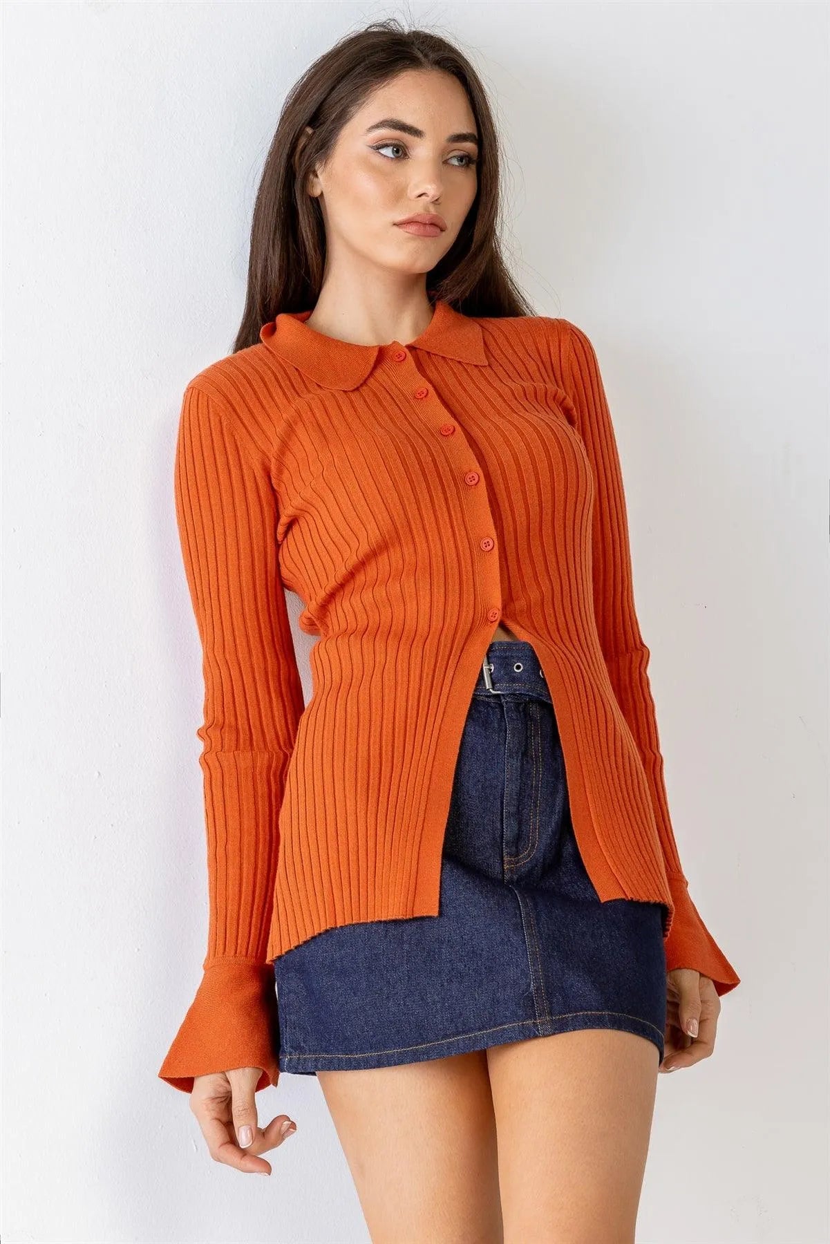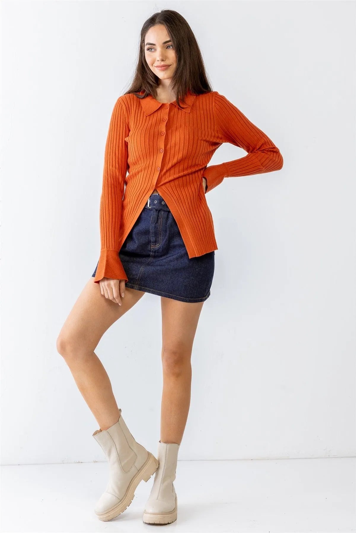 Burnt Orange Ribbed Button-Up Collared Neck Long Sleeve Top /1-2-2-1