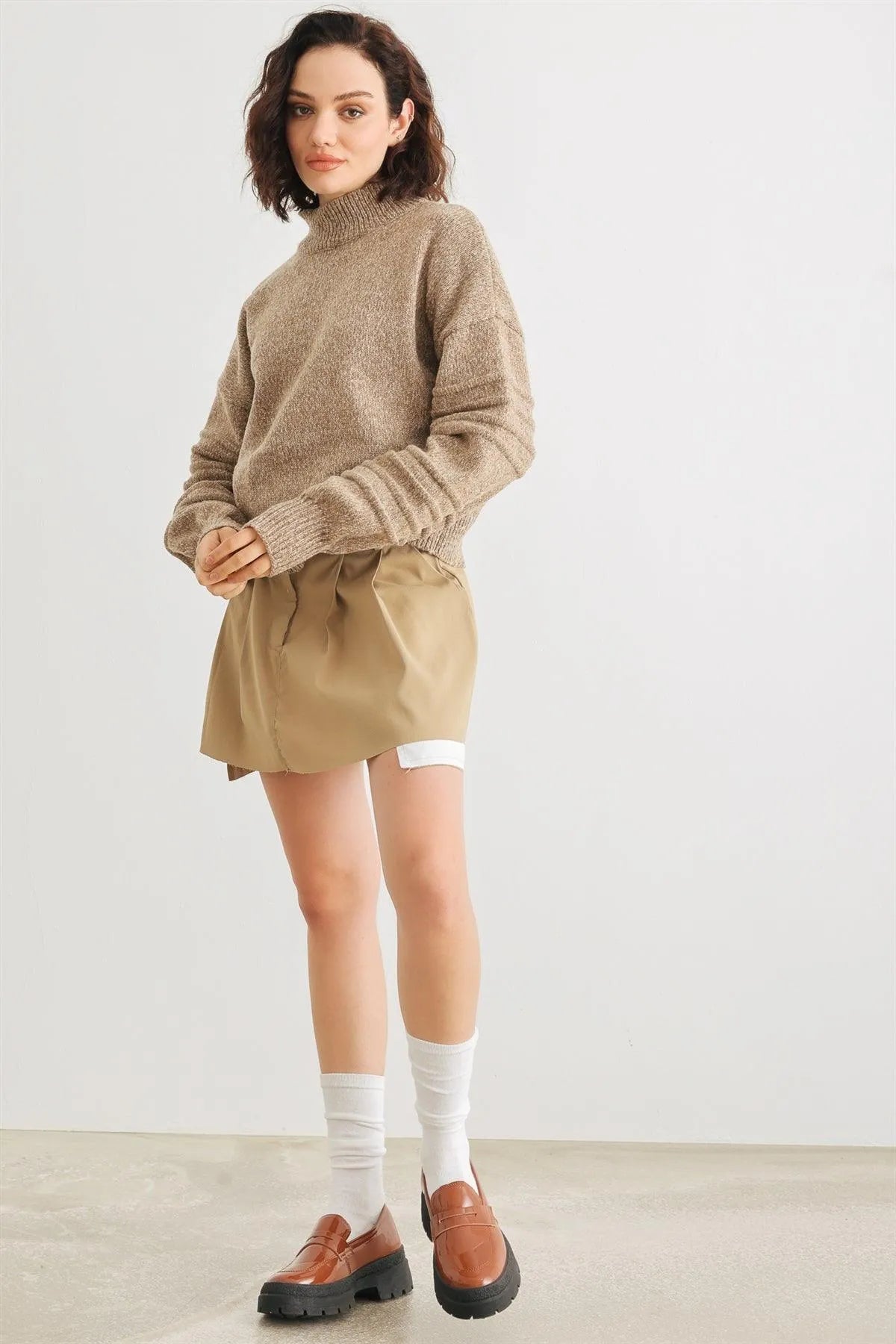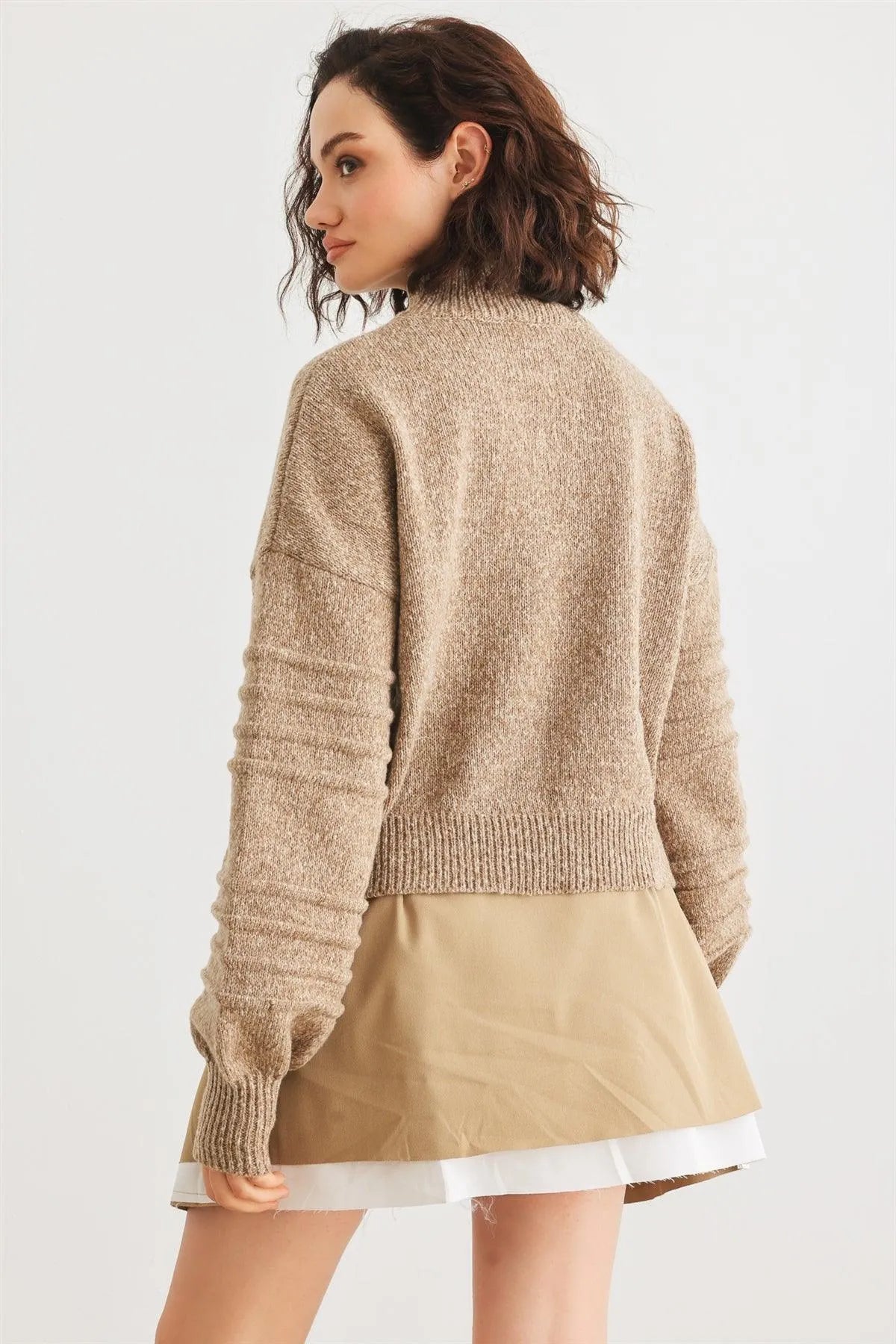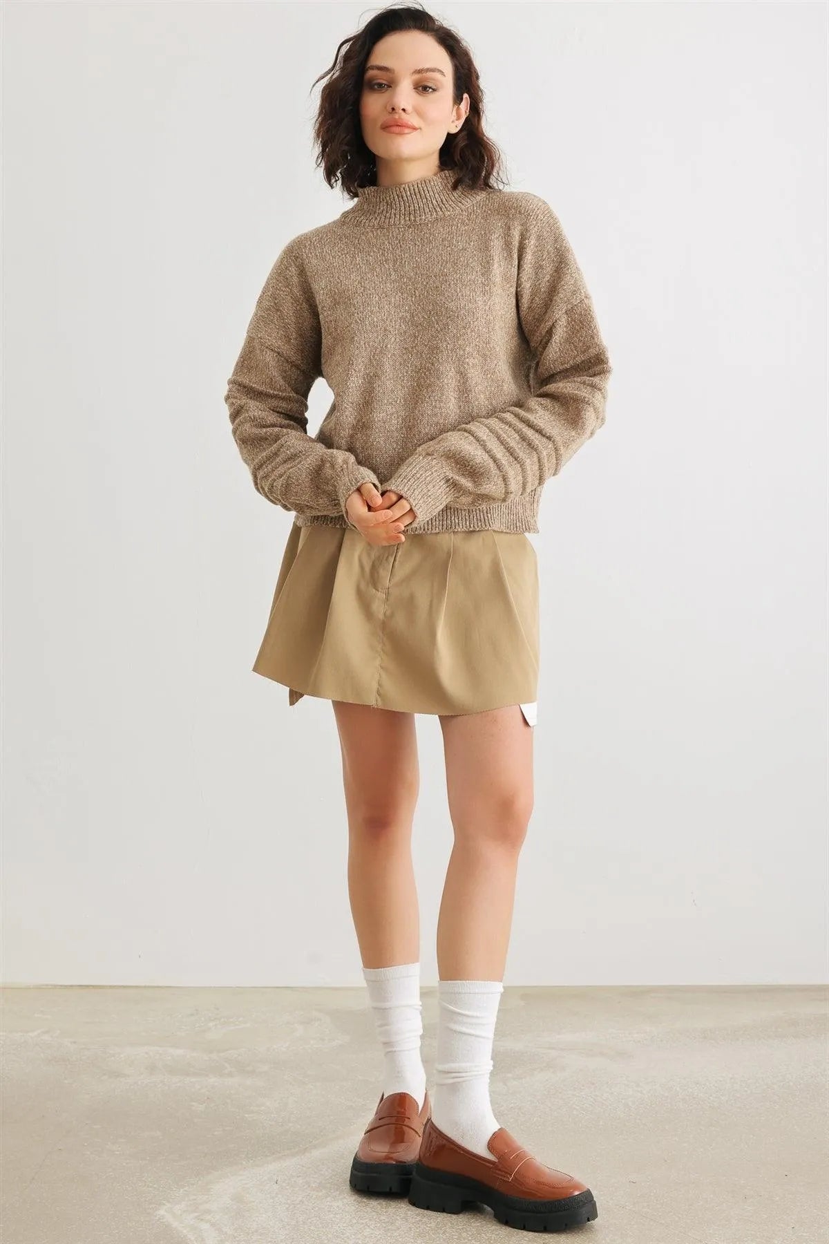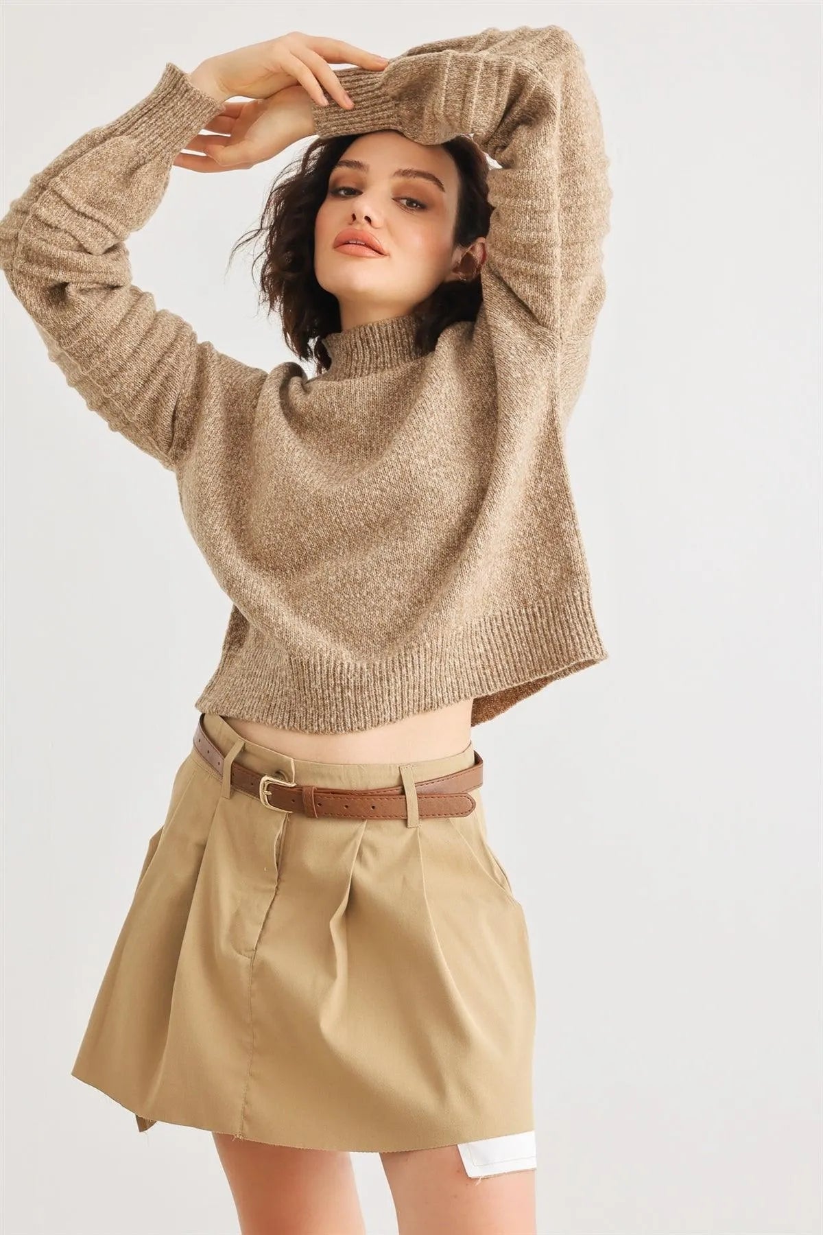 Camel Knit Mock Neck Lantern Sleeve Sweater /2-2-1