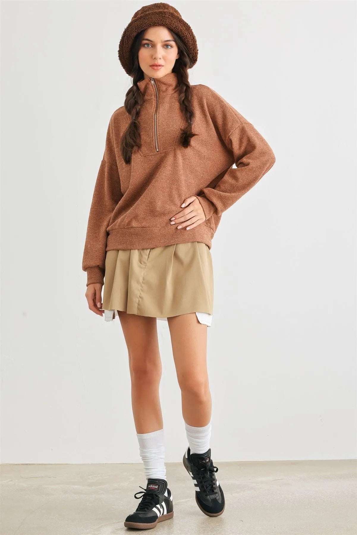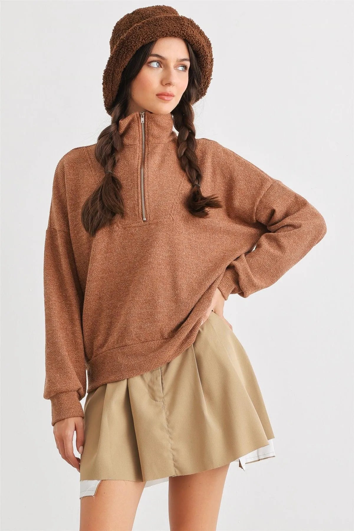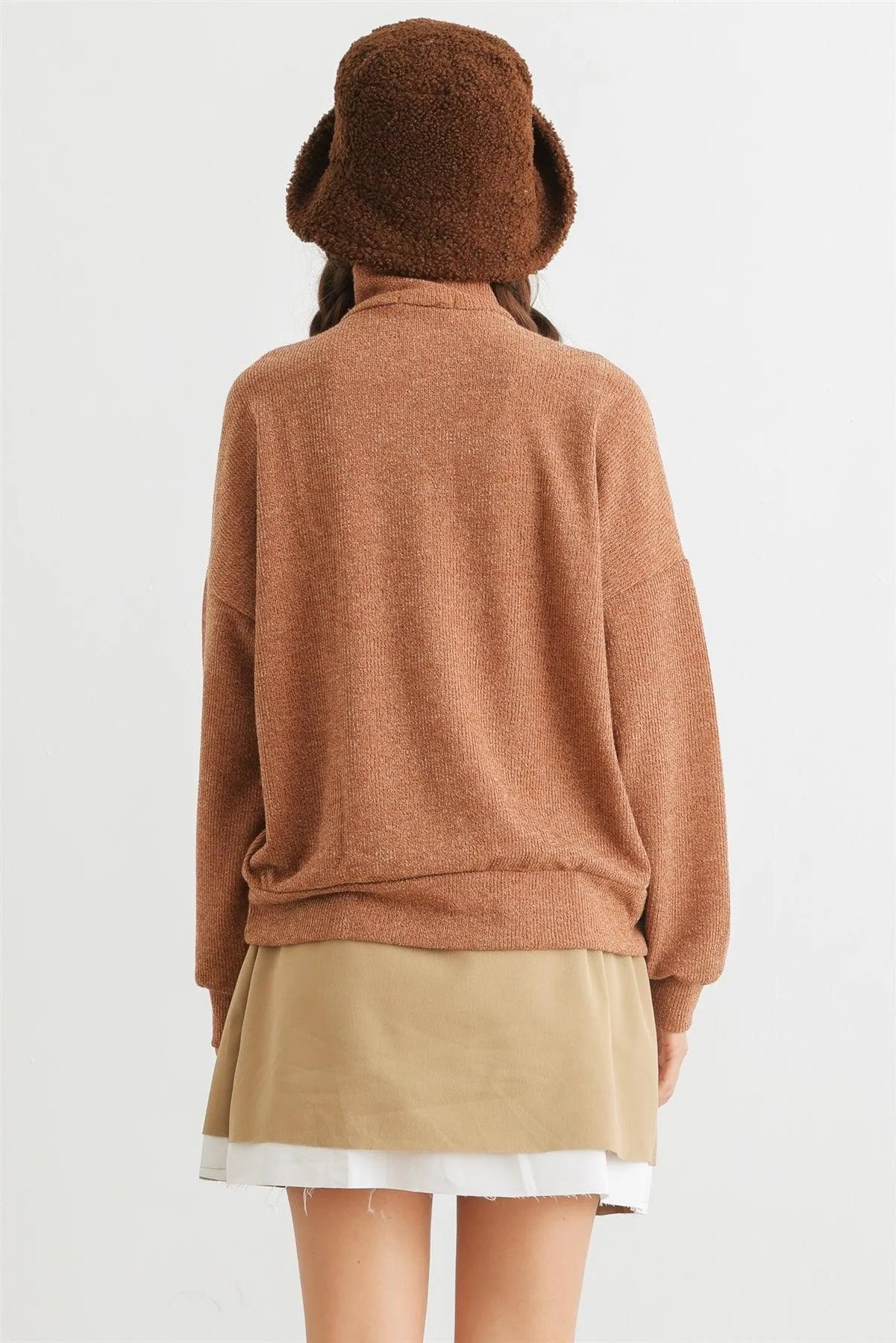🖤 Item Features: Camel, knit material, zip-up neckline, cuffed long sleeves, semi-stretchy, not see through, unlined, casual, cute, warm, cozy, fall winter