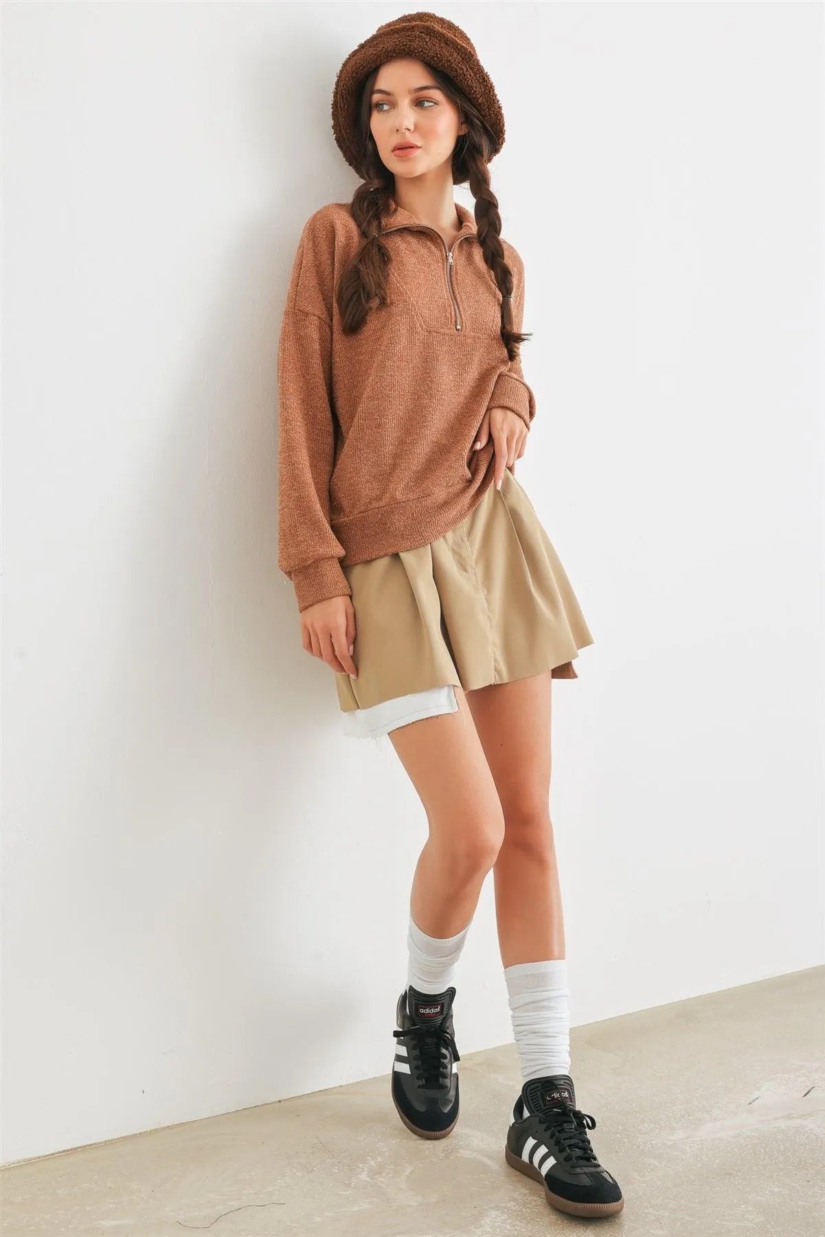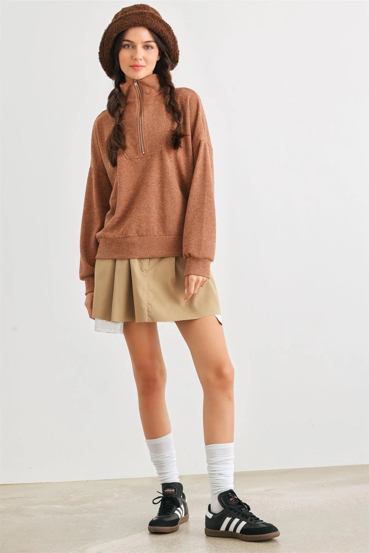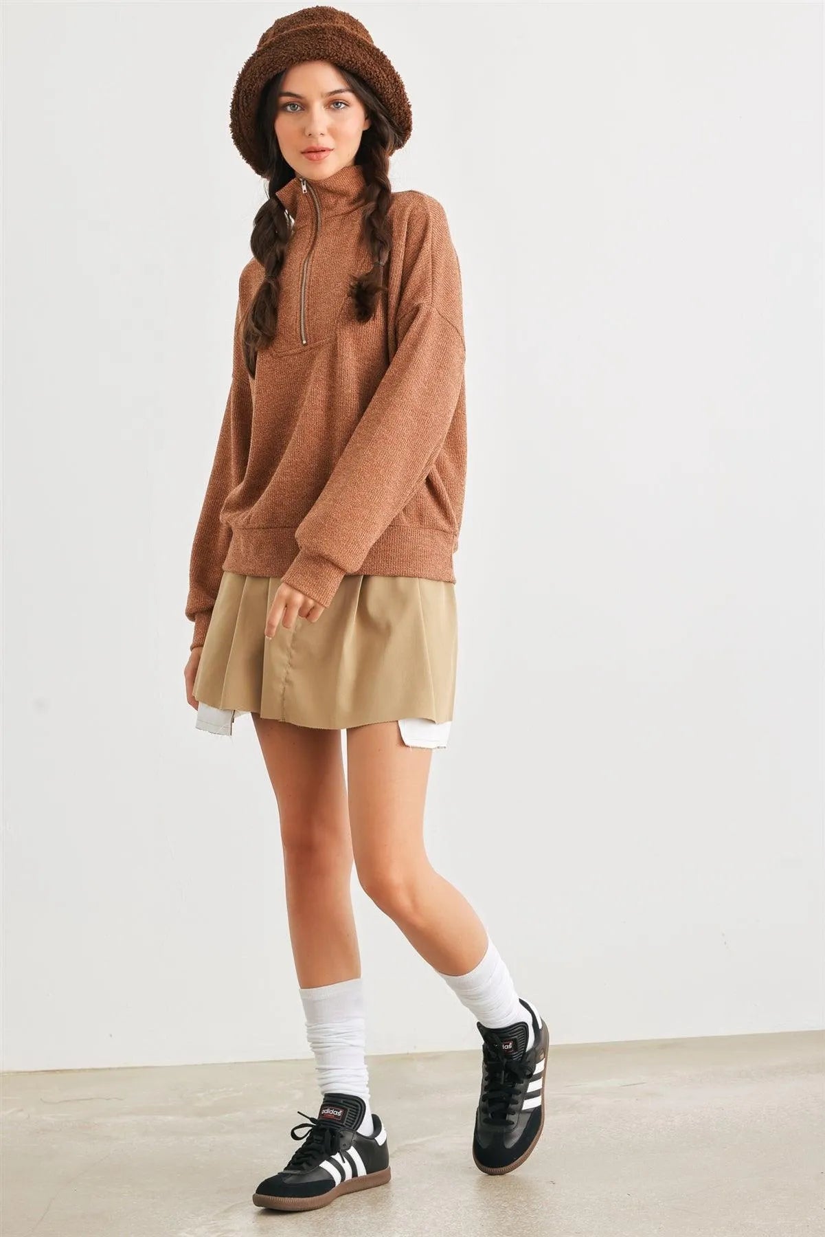🖤 Item Features: Camel, knit material, zip-up neckline, cuffed long sleeves, semi-stretchy, not see through, unlined, casual, cute, warm, cozy, fall winter