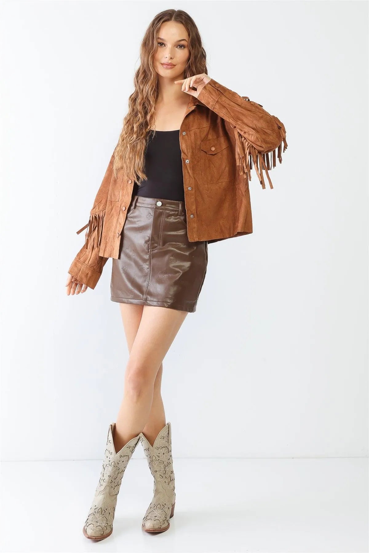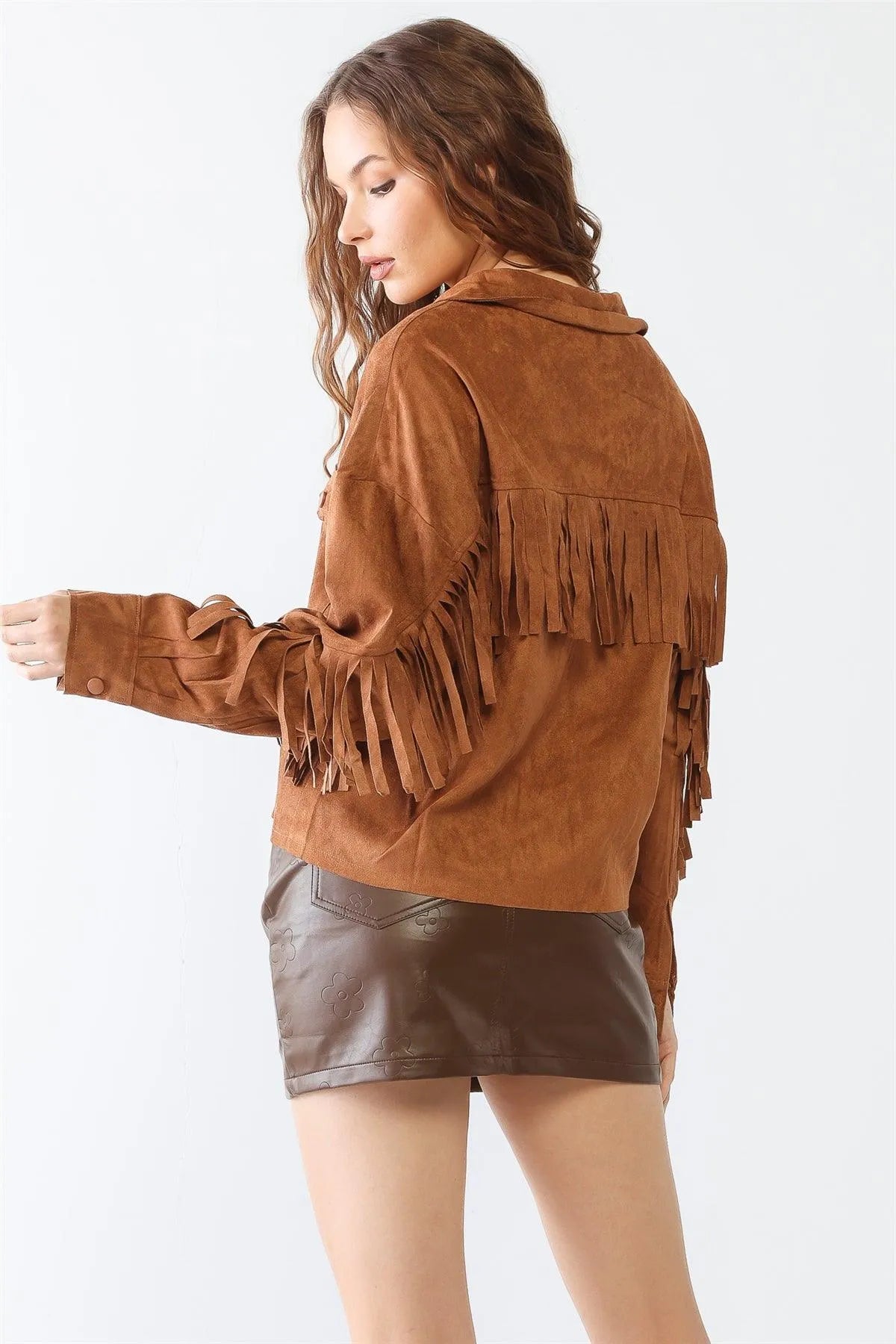 🖤 Item Features: Camel, suede leather, solid color, fringe, collared neckline, button-up, two pockets, long sleeves, non-stretchy, unlined, non-sheer, casual, cute, cozy, cowboy vibe