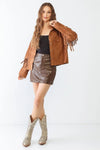 Camel Suede Leather Fringe Collared Neck Two Pocket Long Sleeve Jacket /2-2-2