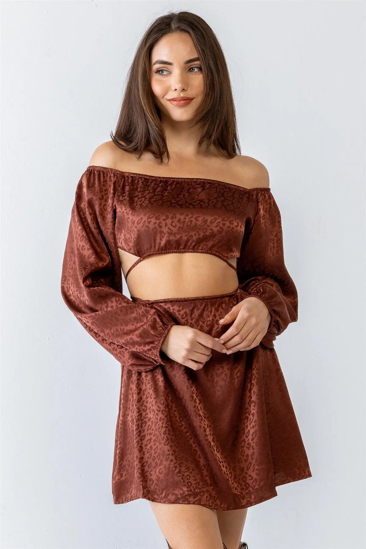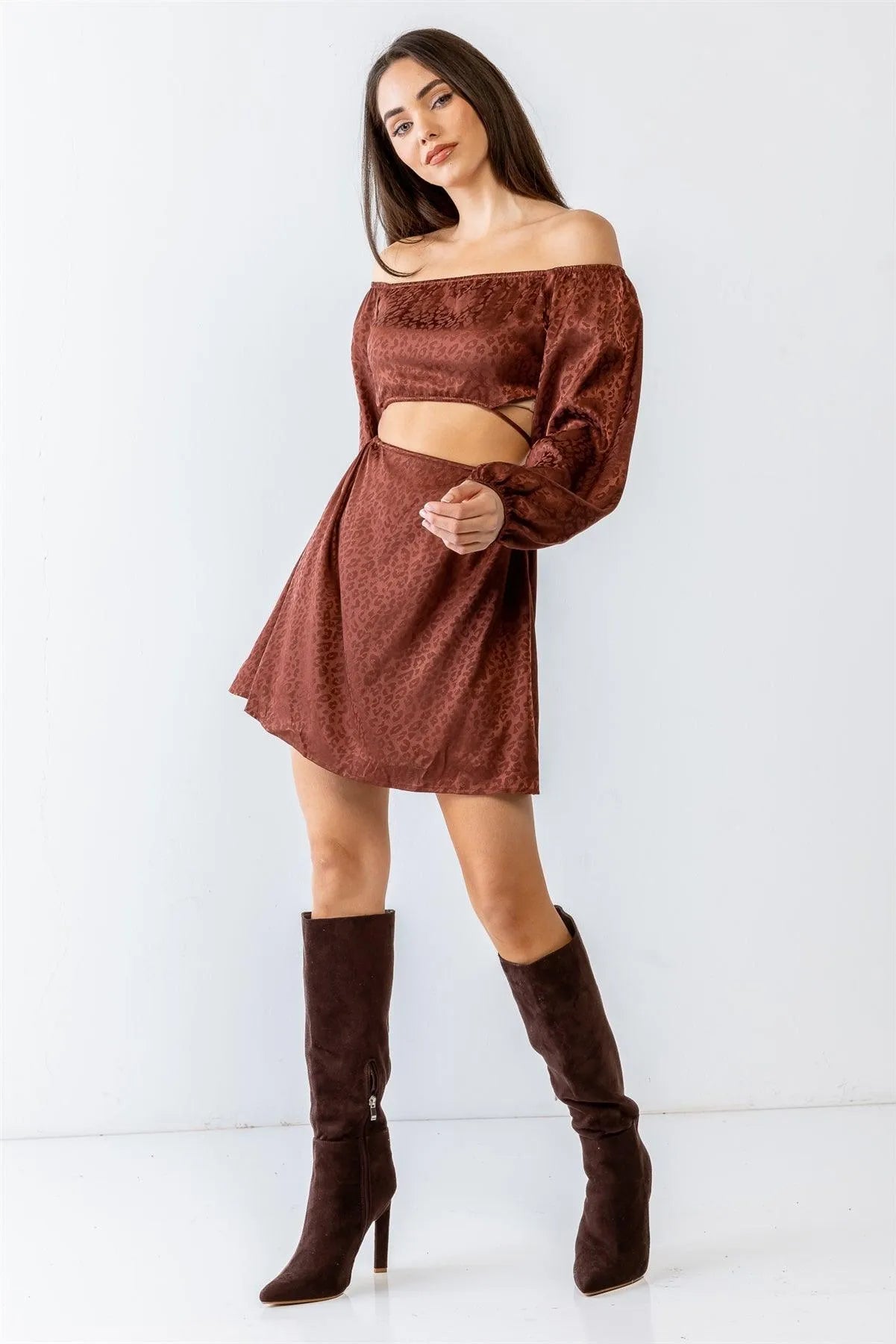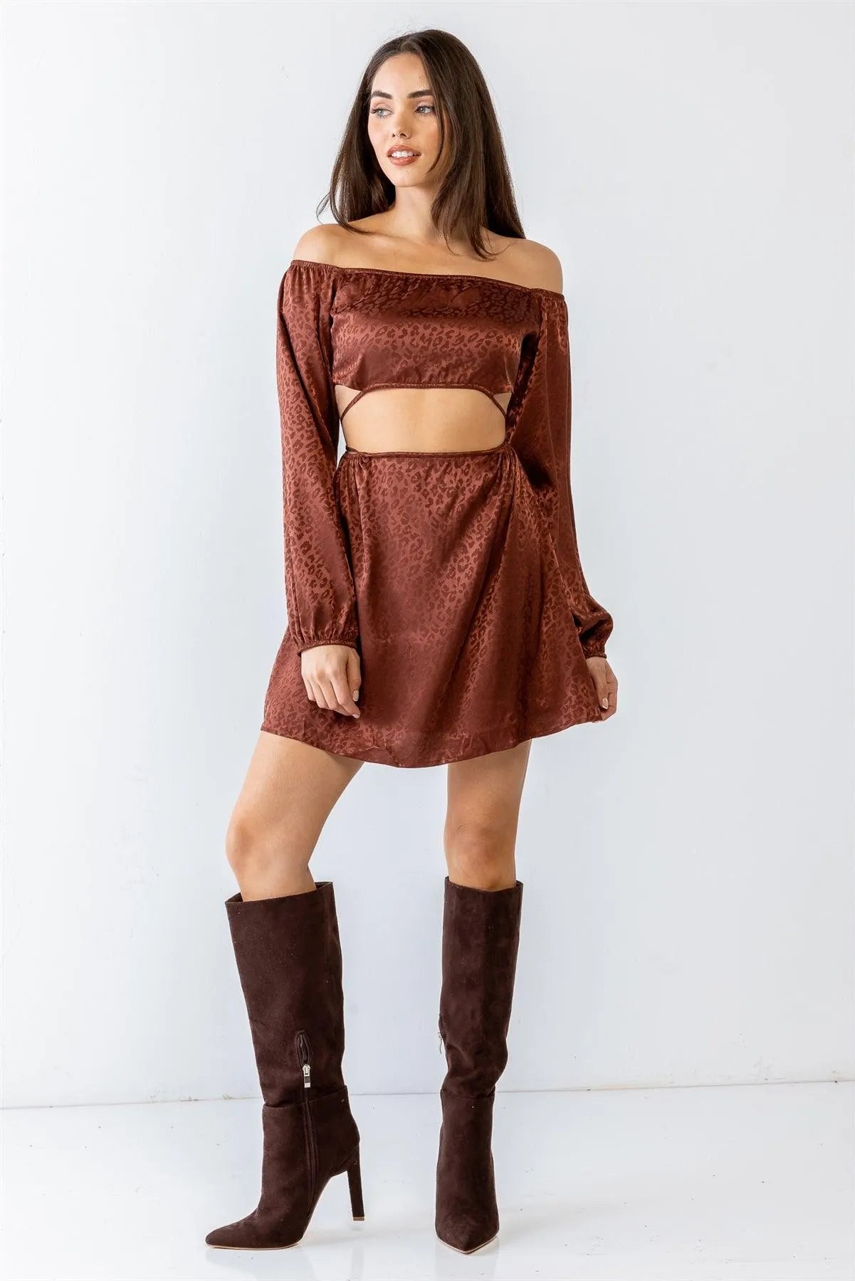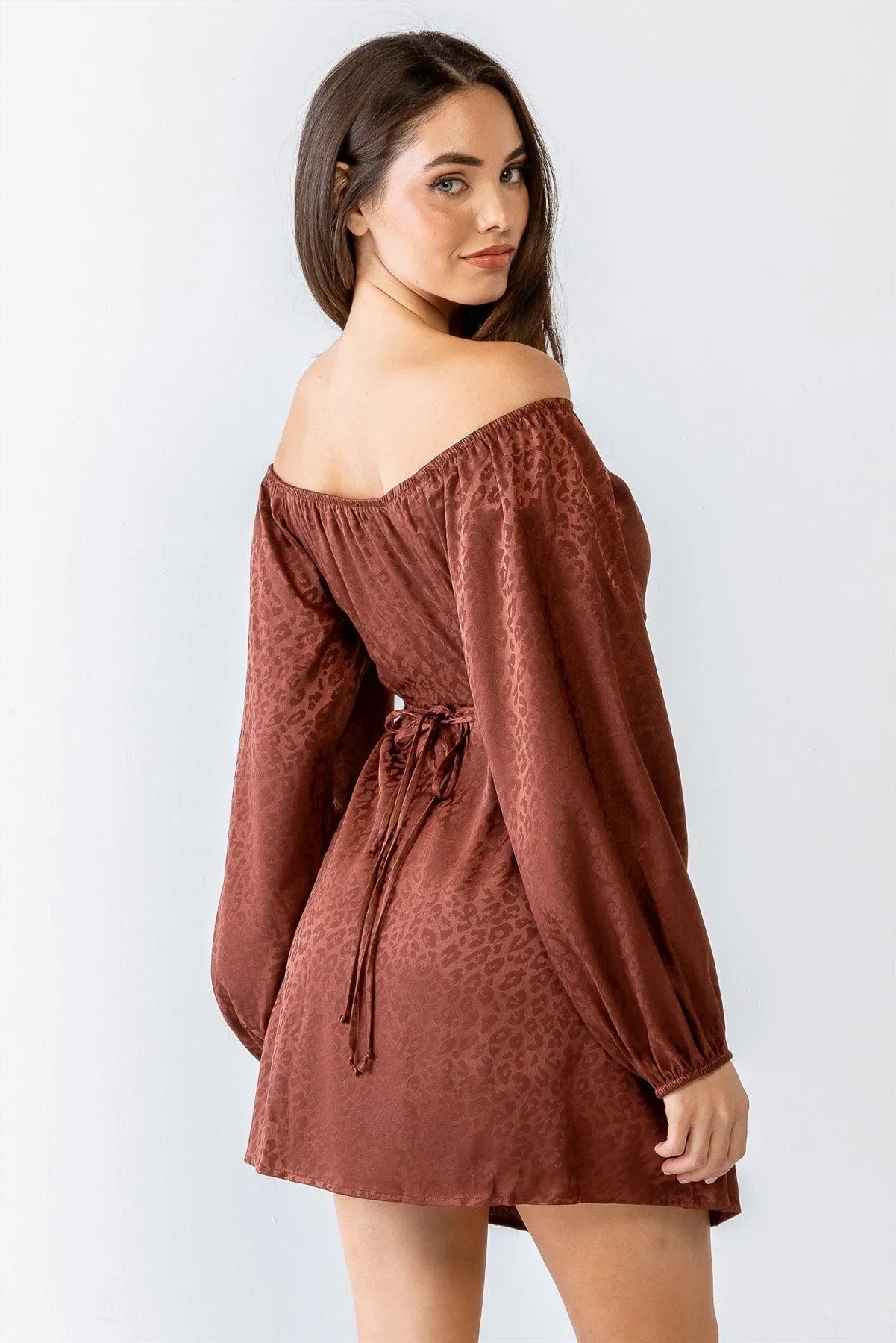 Chocolate Leopard Print Satin Off-The-Shoulder Open Front Mini Dress /1-1-1-1