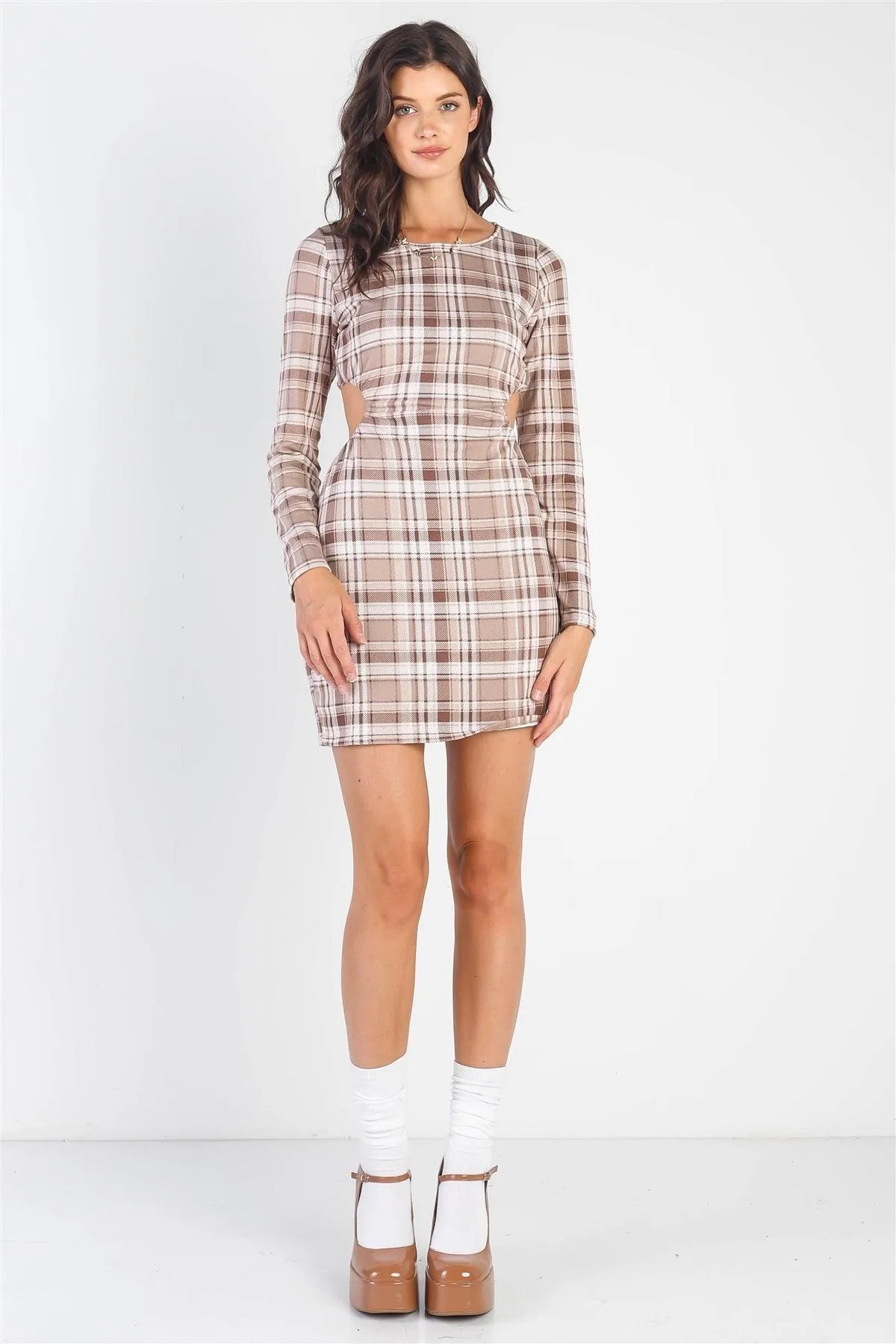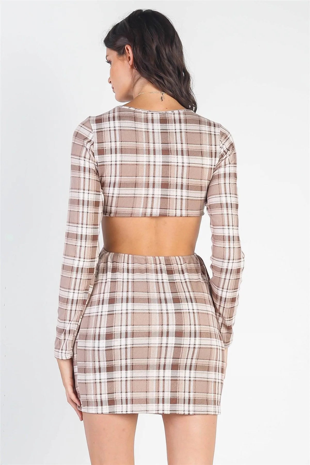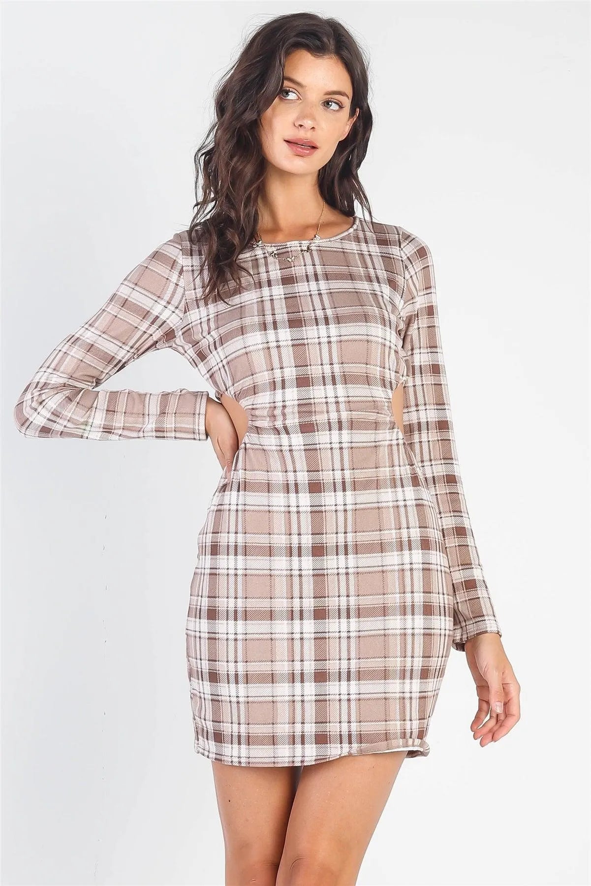 Brown &White Plaid Print Cut-Out Long Sleeve Dress /3-2-1