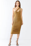 Cognac Ribbed Ruched Cut-Out Neck One-Shoulder Midi Dress /2-2-1
