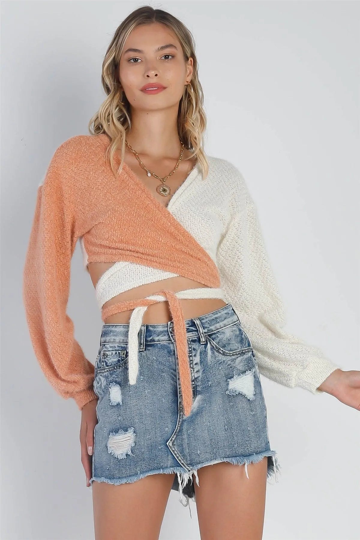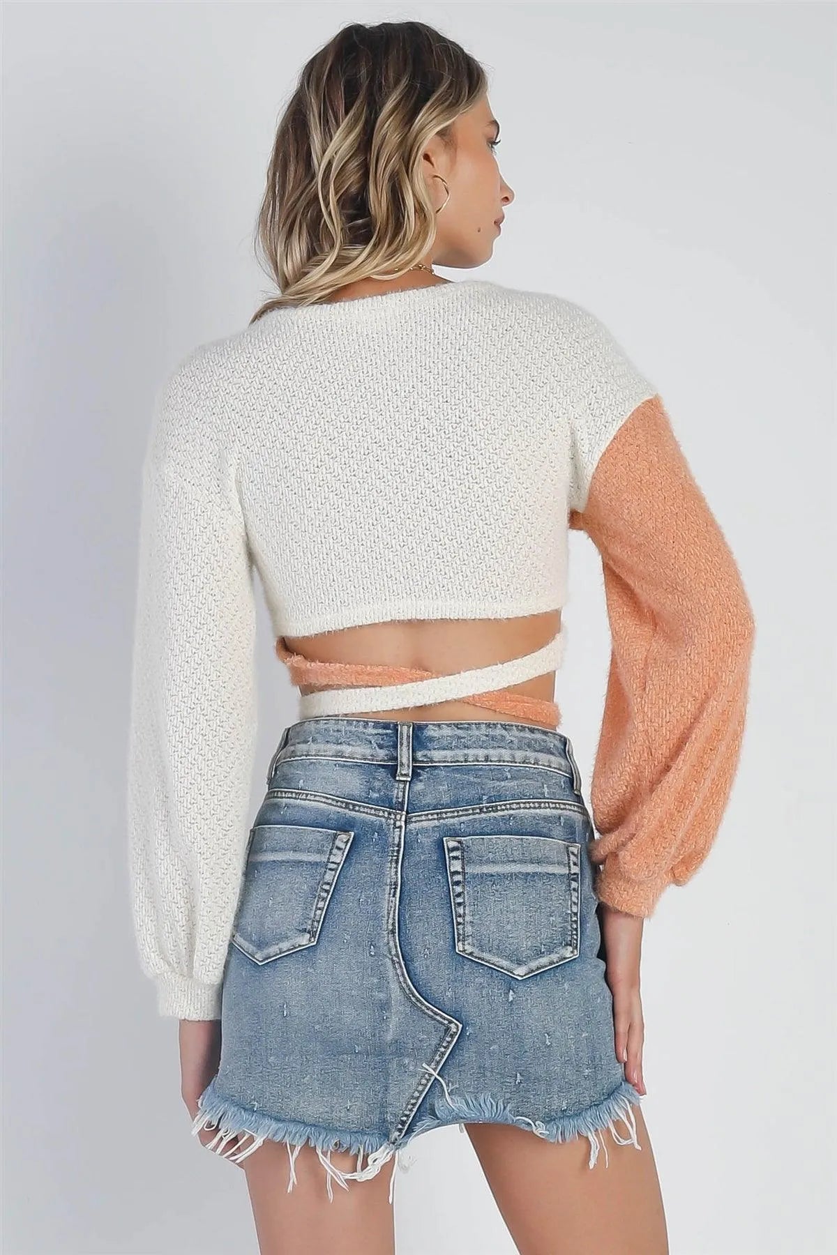 Cream & Apricot Knit Fuzzy Wrap Around Self-Tie Crop Top /3-2-1