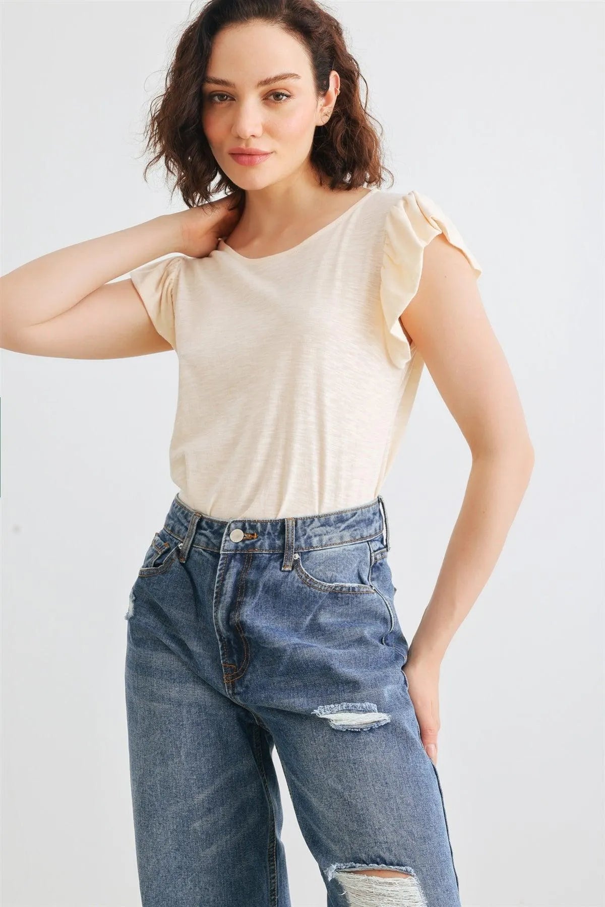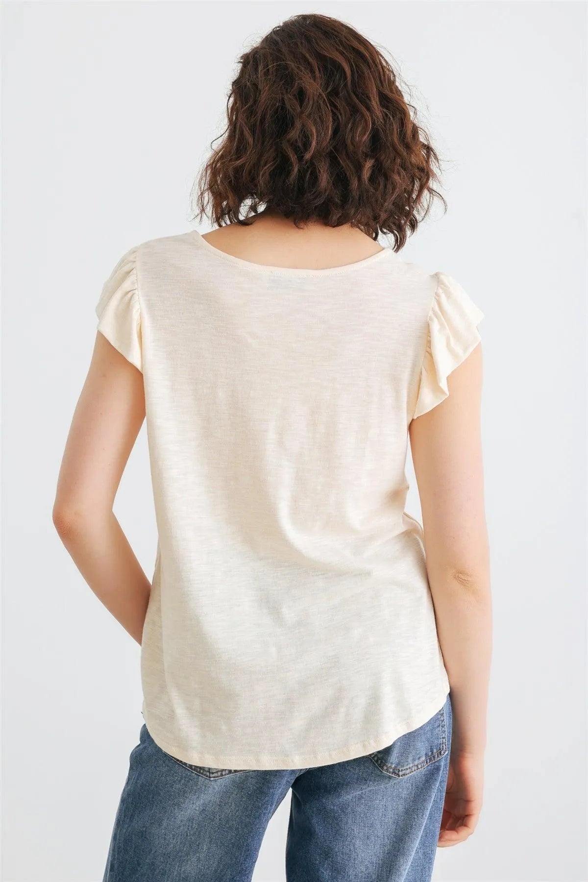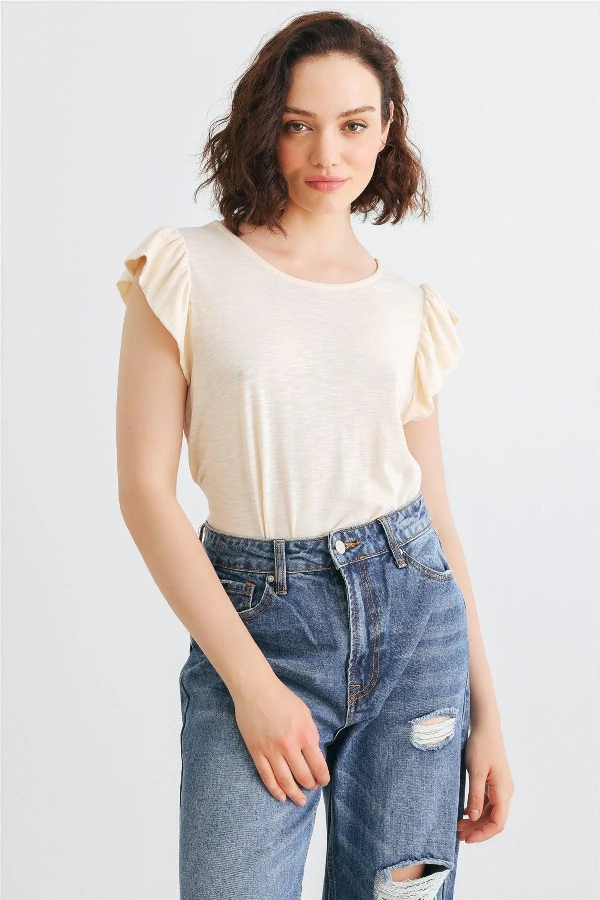 Cream Cotton Blend Ruffled Sleeve Round Neck Top