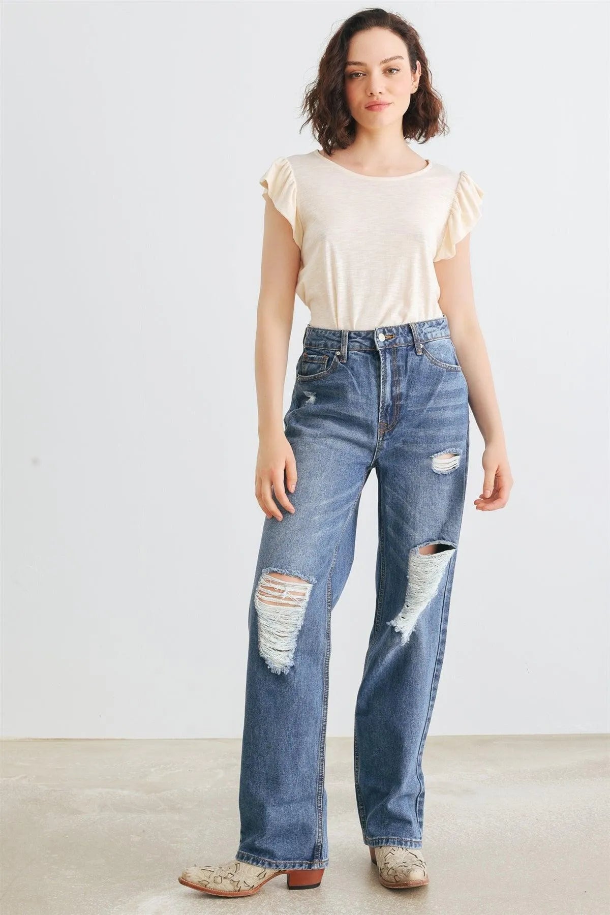 🖤 Add a fun twist to your casual wardrobe with our Cream Cotton Blend Ruffled Sleeve Round Neck Top! The cotton blend fabric offers a relaxed fit and a semi-stretchy feel for all-day comfort. The ruffled sleeves and round neckline add a cute touch to this unlined top, perfect for any casual occasion.