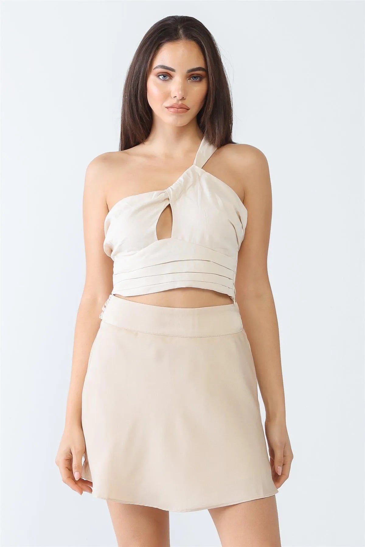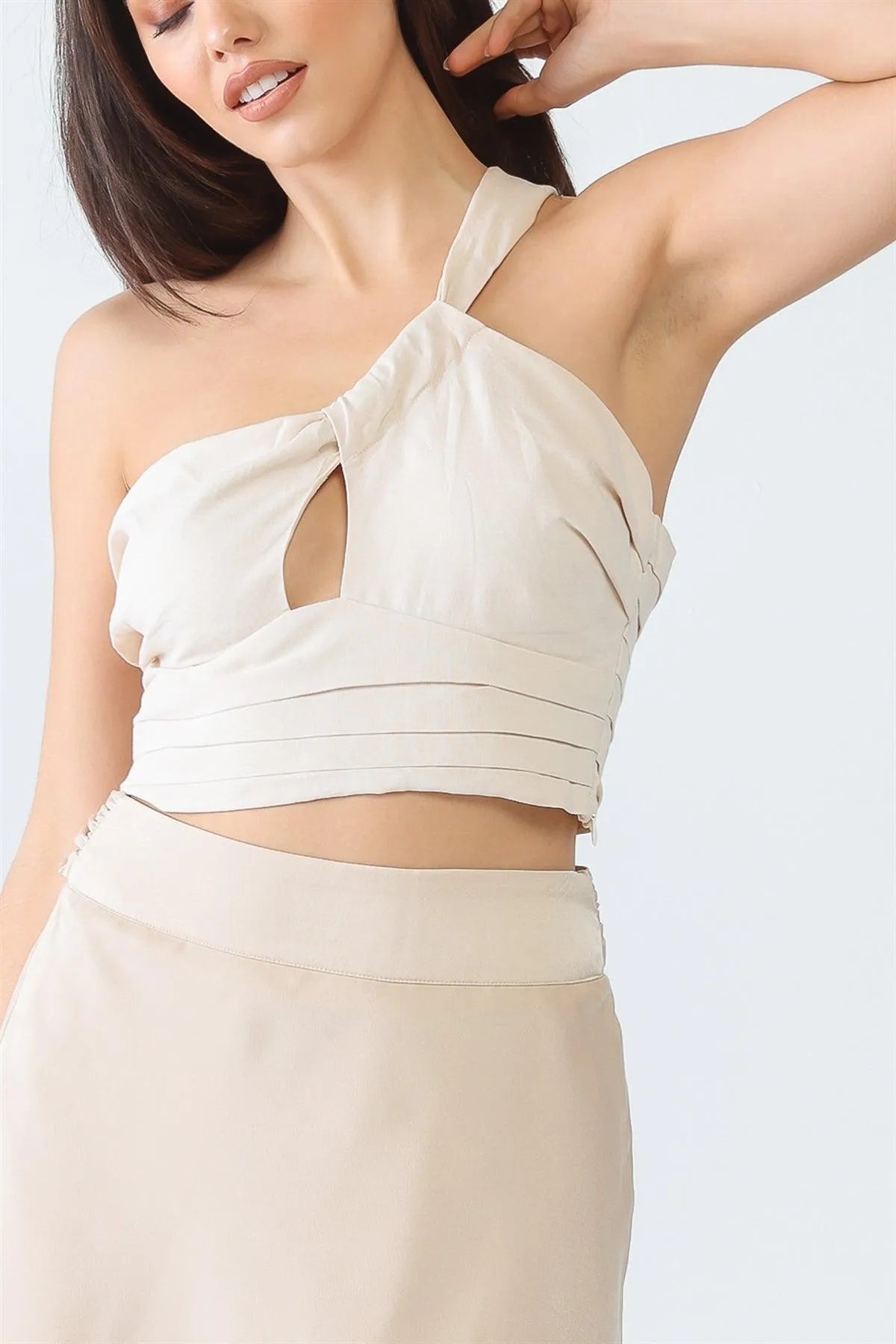 Cream Cotton Pleated One Shoulder Cut-Out Crop Top /3-2-1