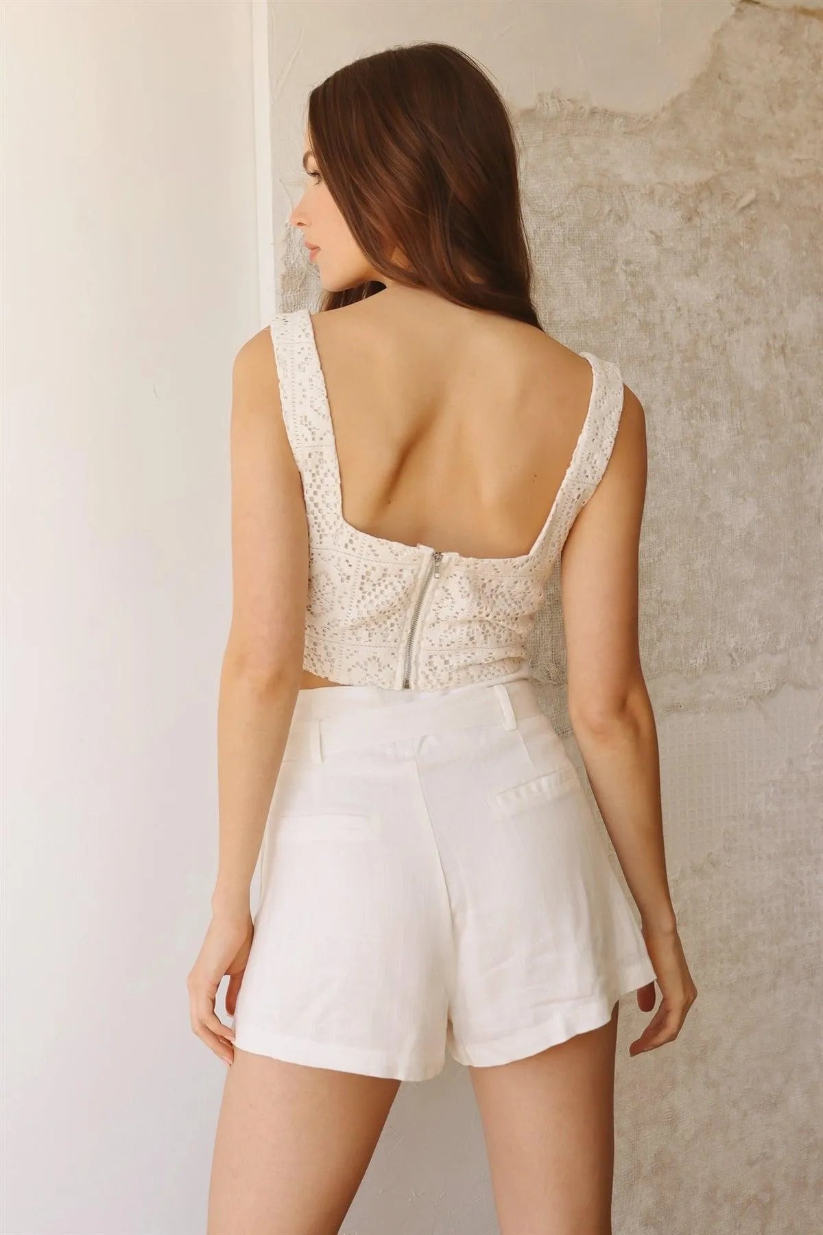 Cream Lace Crochet Embroidery Cotton Square Neck Sleeveless Crop Top /3-2-1