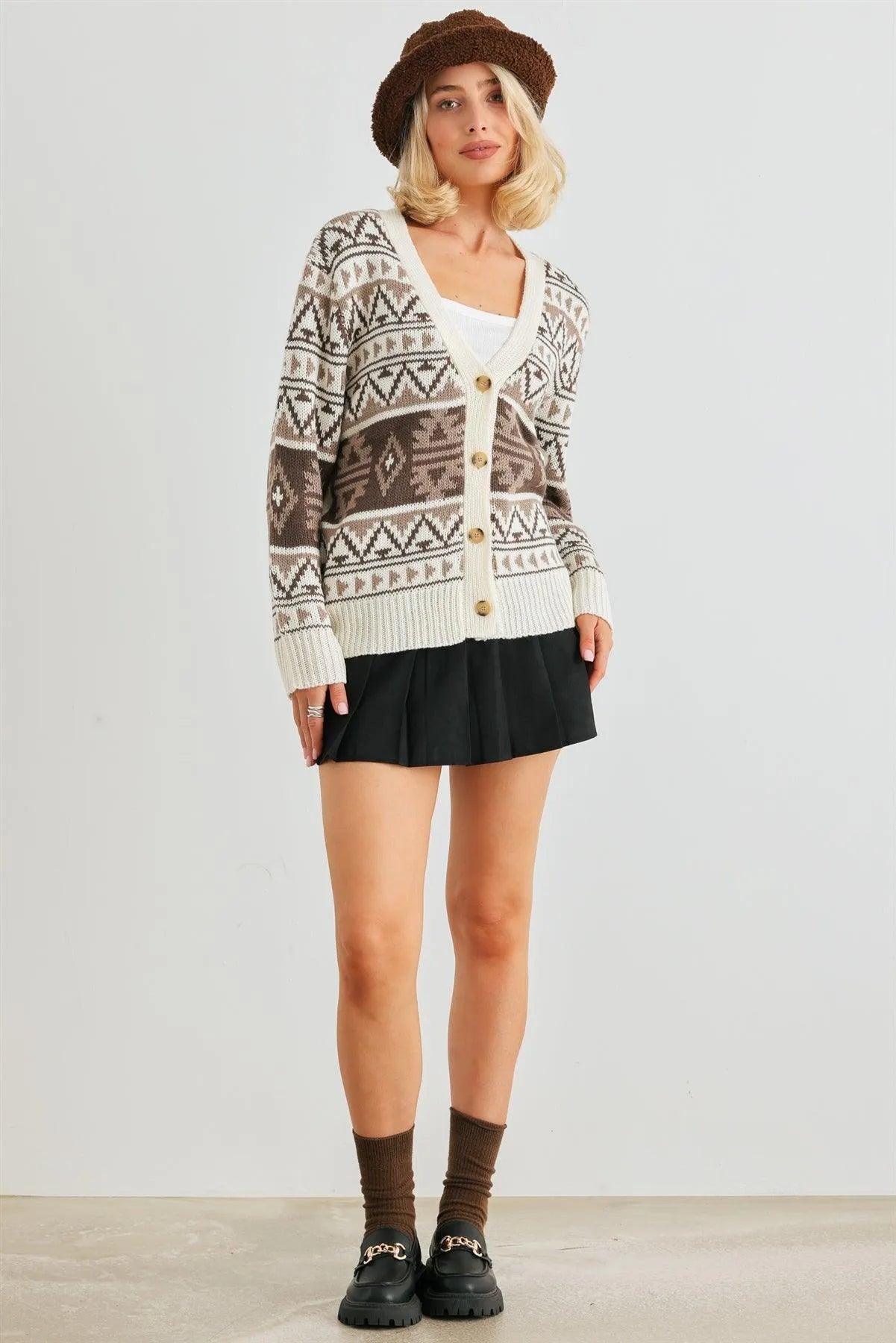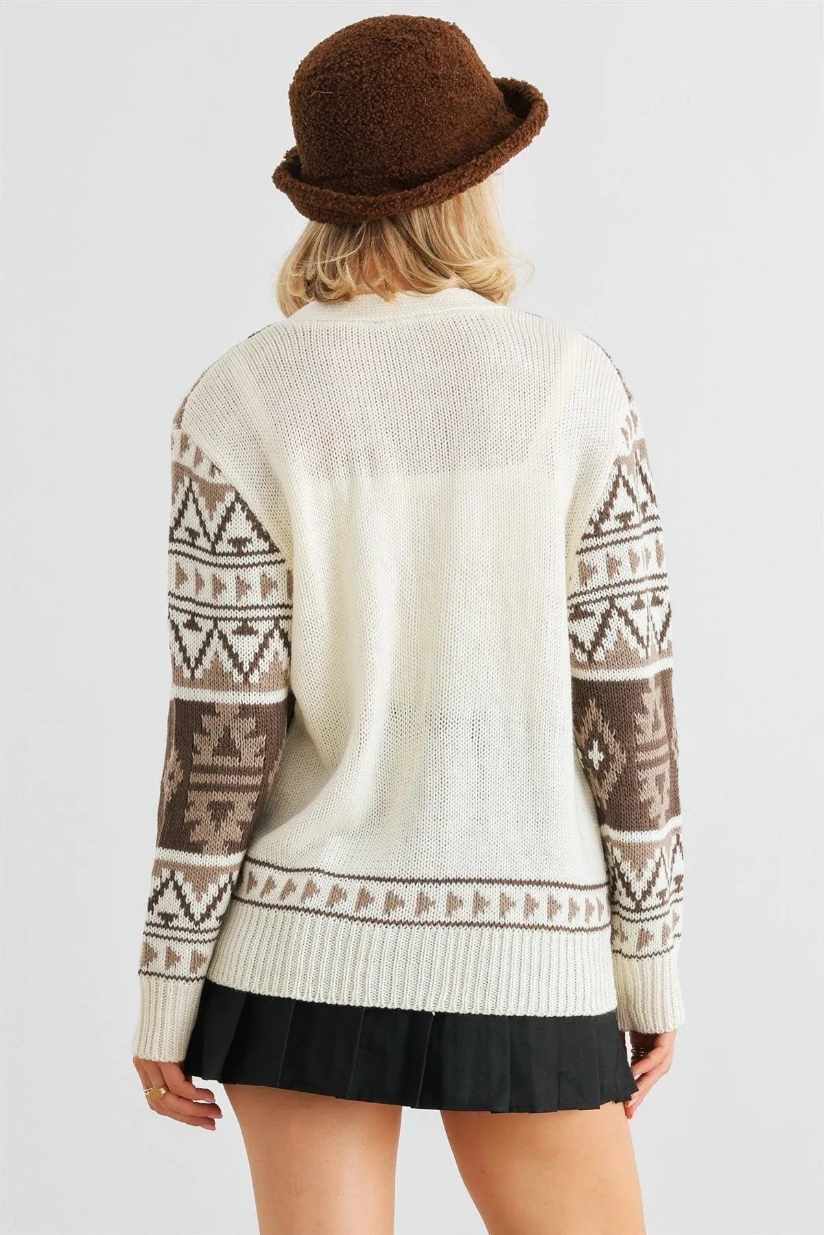 Cream Fair Isle Knit Button-Up Long Sleeve Cardigan Sweater /2-2