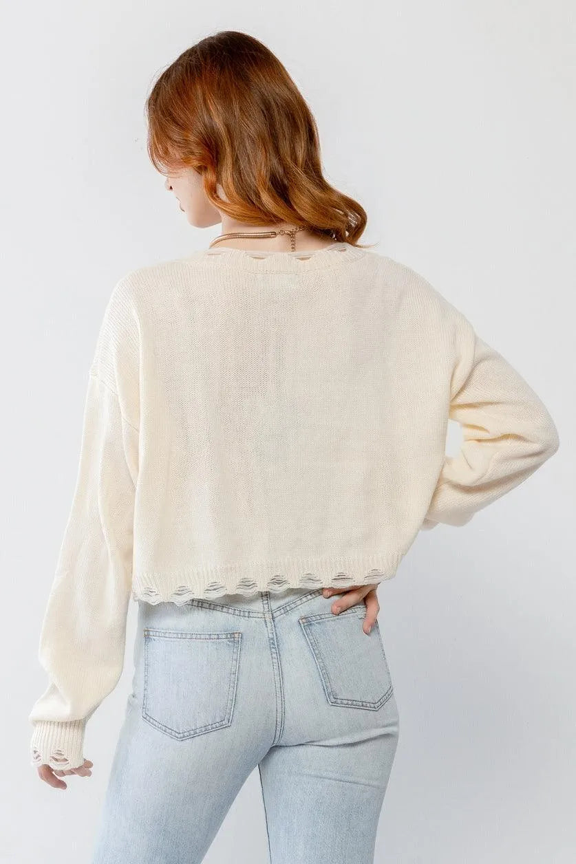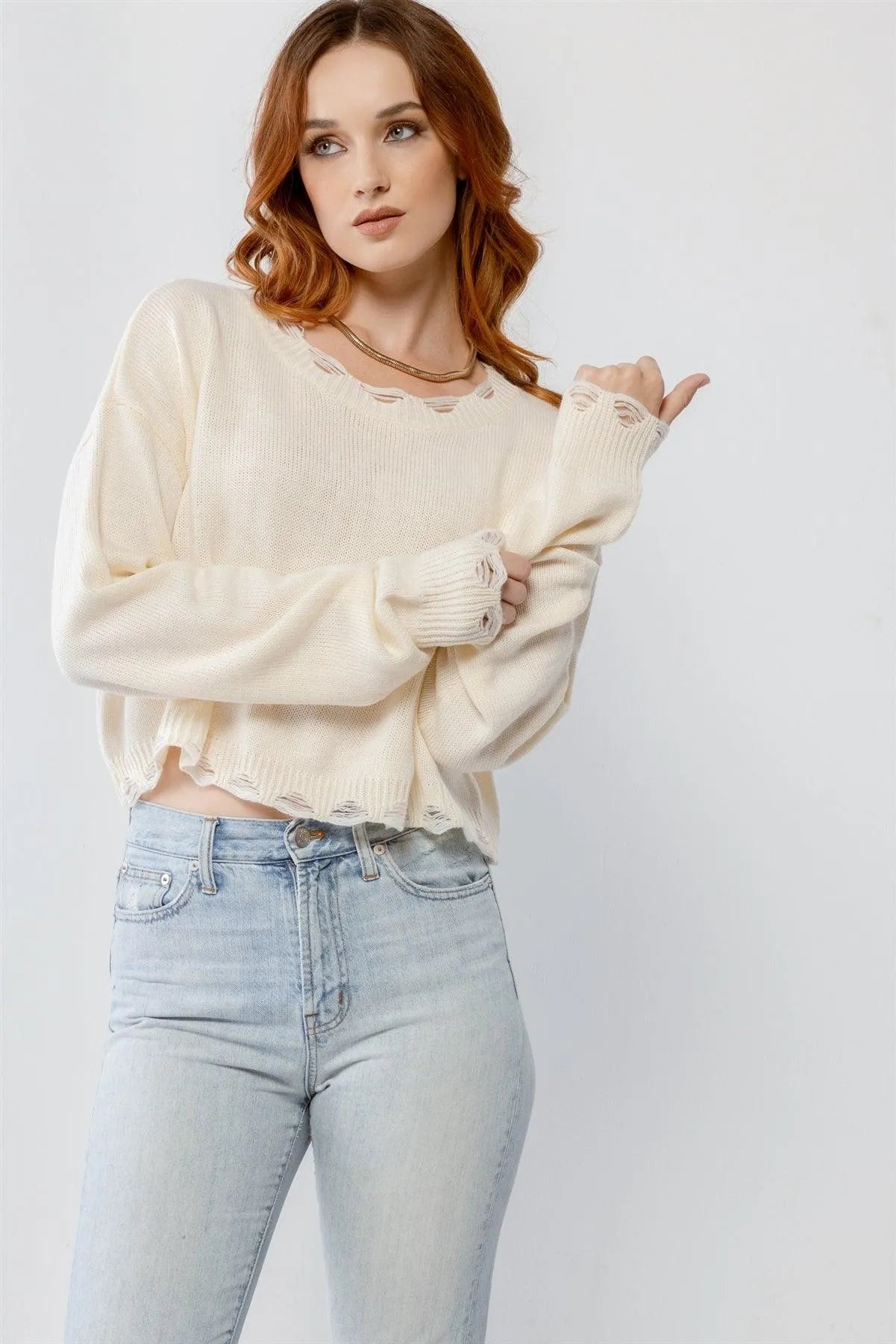 Cream Knit Distressed Detail Long Sleeve Crop Sweater /3-2-1