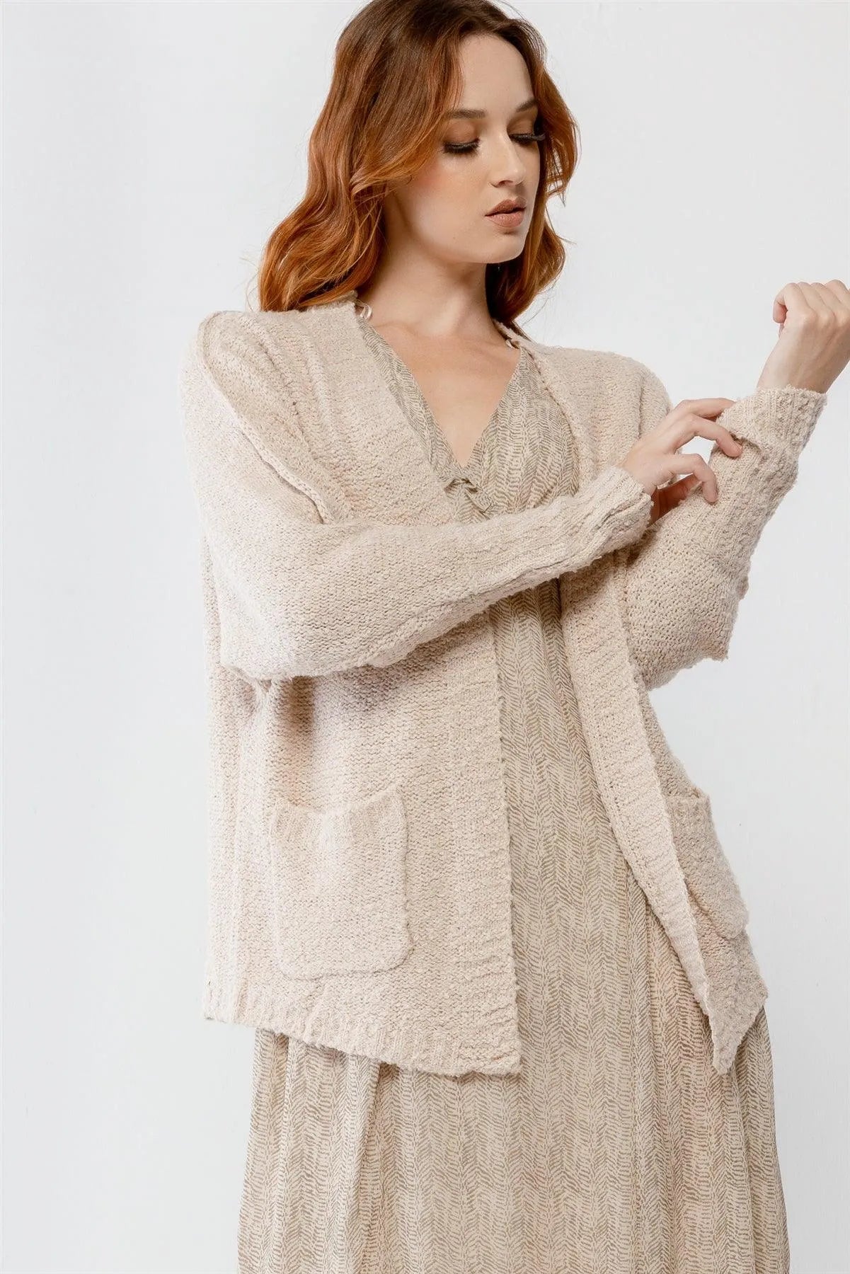 Cream Knit Textured Two Pocket Open Front Cardigan /3-2