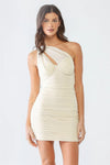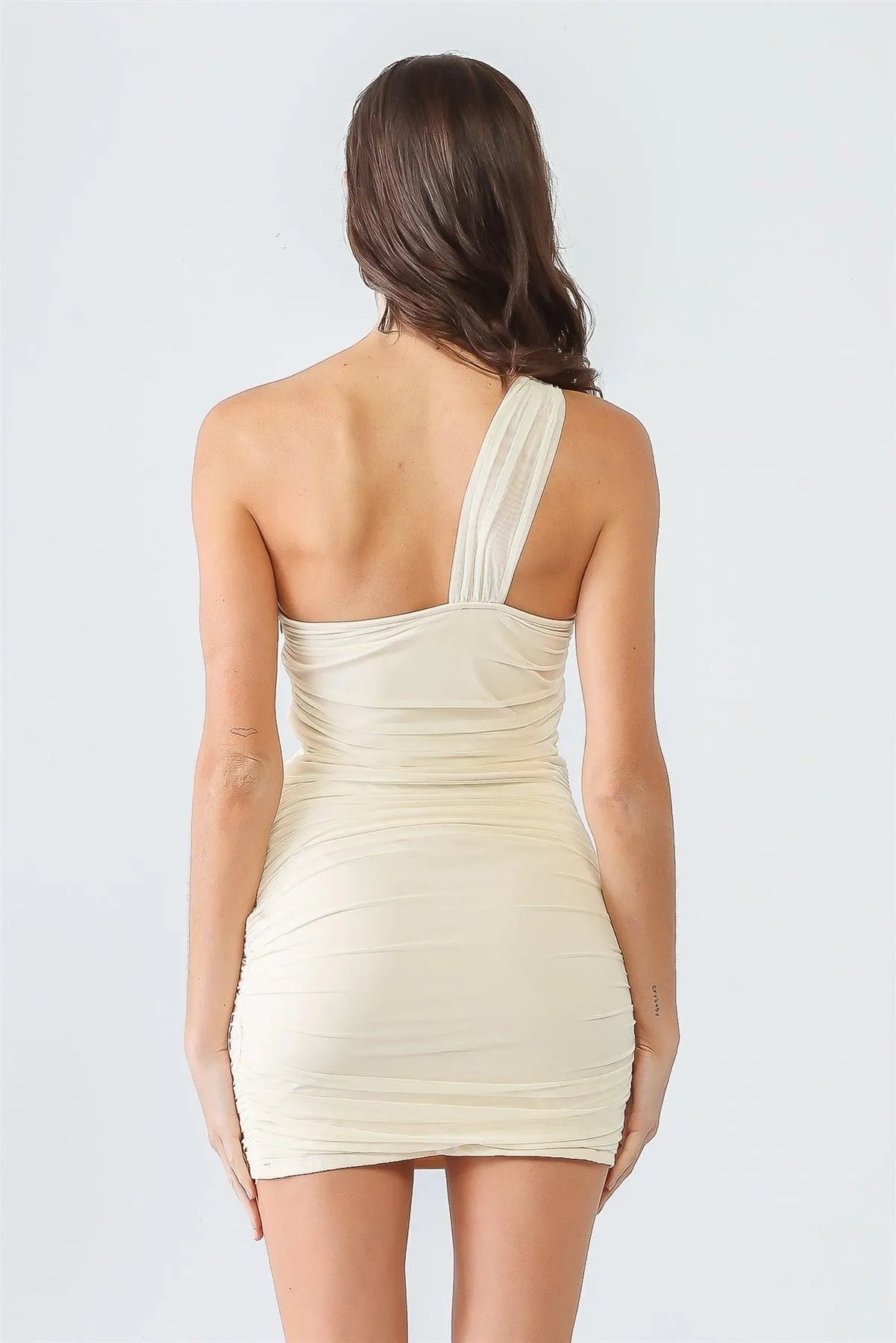Cream Mesh Ruched Asymmetrical One-Shoulder Mini Dress /3-2-1