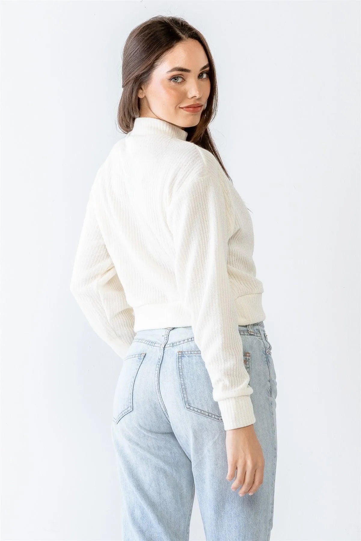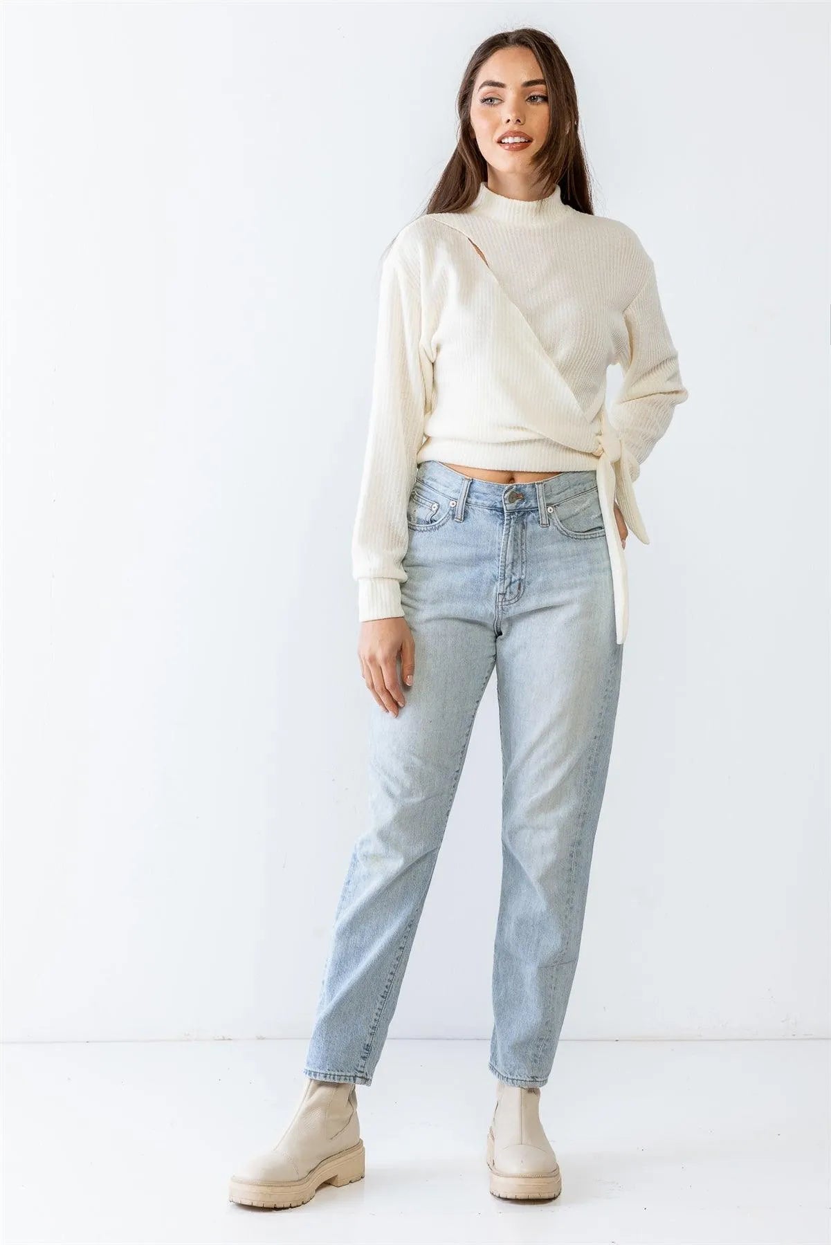 Cream Ribbed Knit Mock Neck Wrap Cut-Out Detail Self-Tie Hem Long Sleeve Top /1-2-2-1