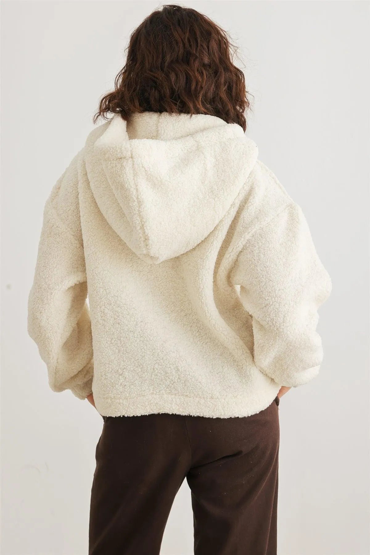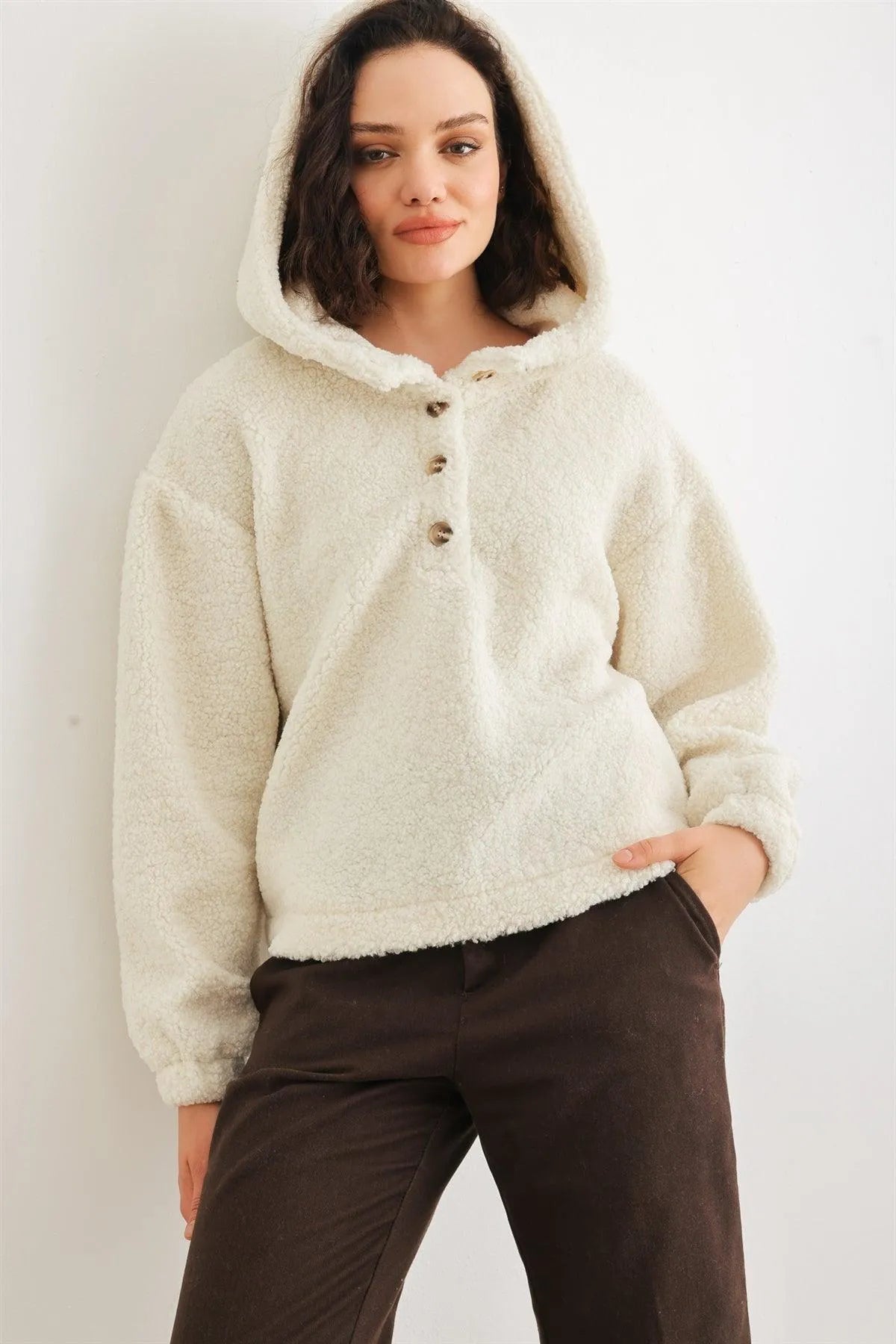 🖤 Item Features: Cream, solid color, teddy knit, long sleeves, dropped shoulders, contrast button-up neckline, hooded, two pockets, relaxed fit, cropped length, semi-stretchy, unlined, casual, cute, warm, cozy