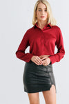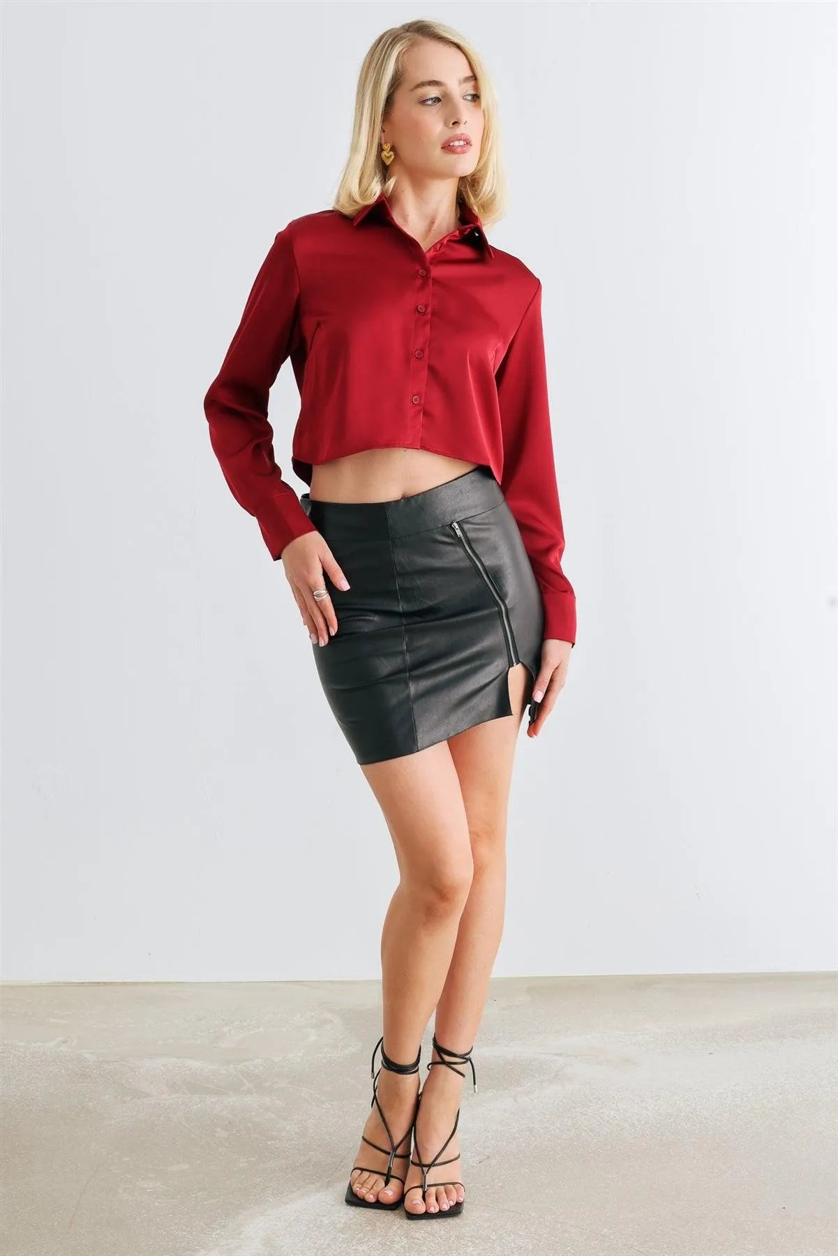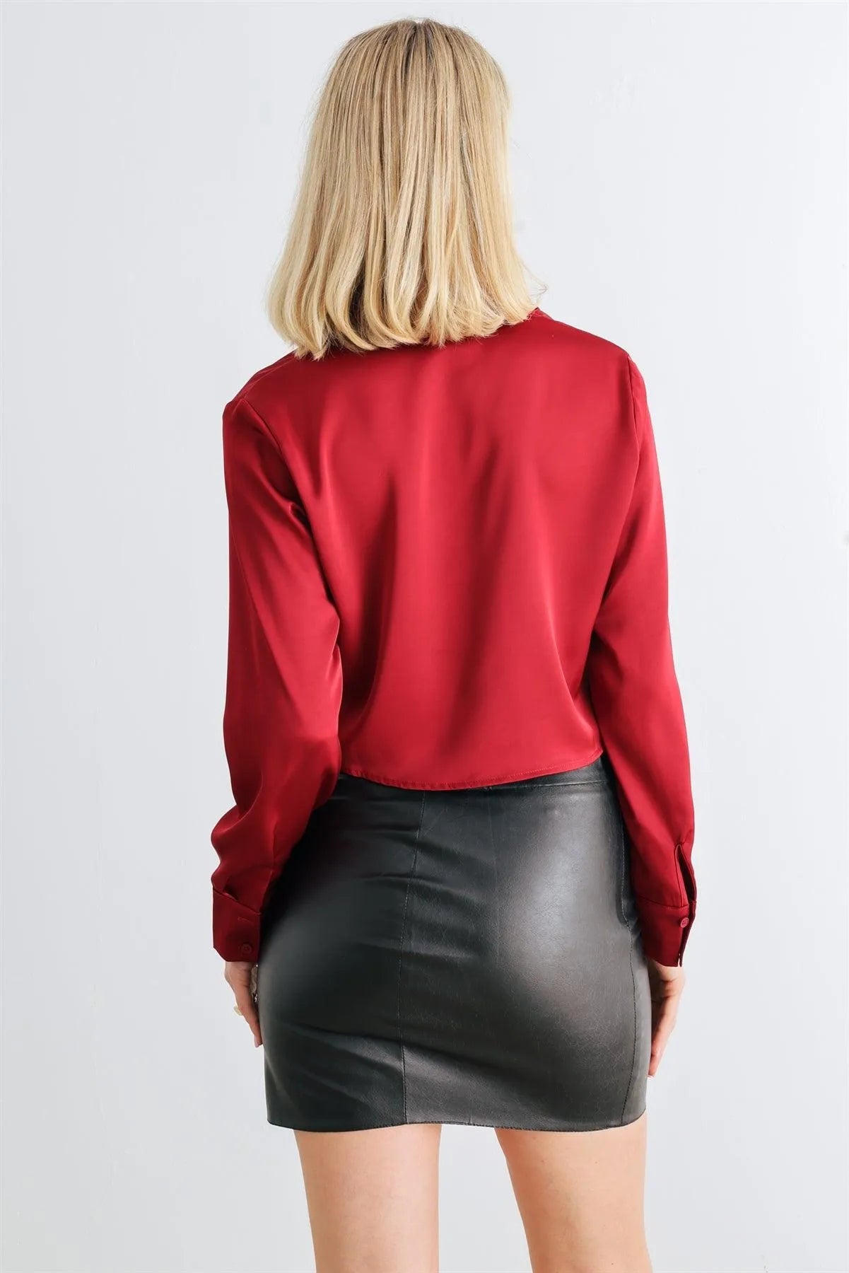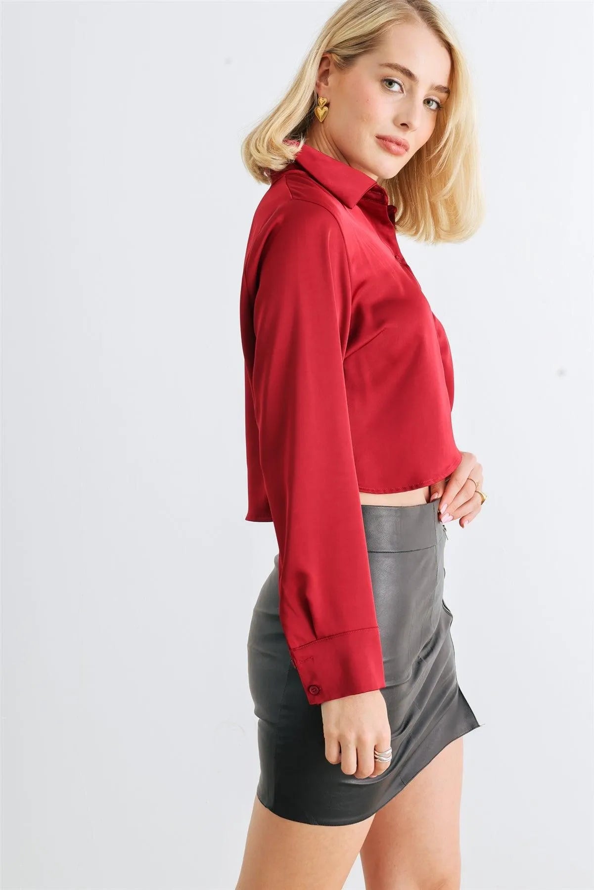 Crimson Satin Button-Up Collared Neck Long Sleeve Crop Top /1-2-2-1