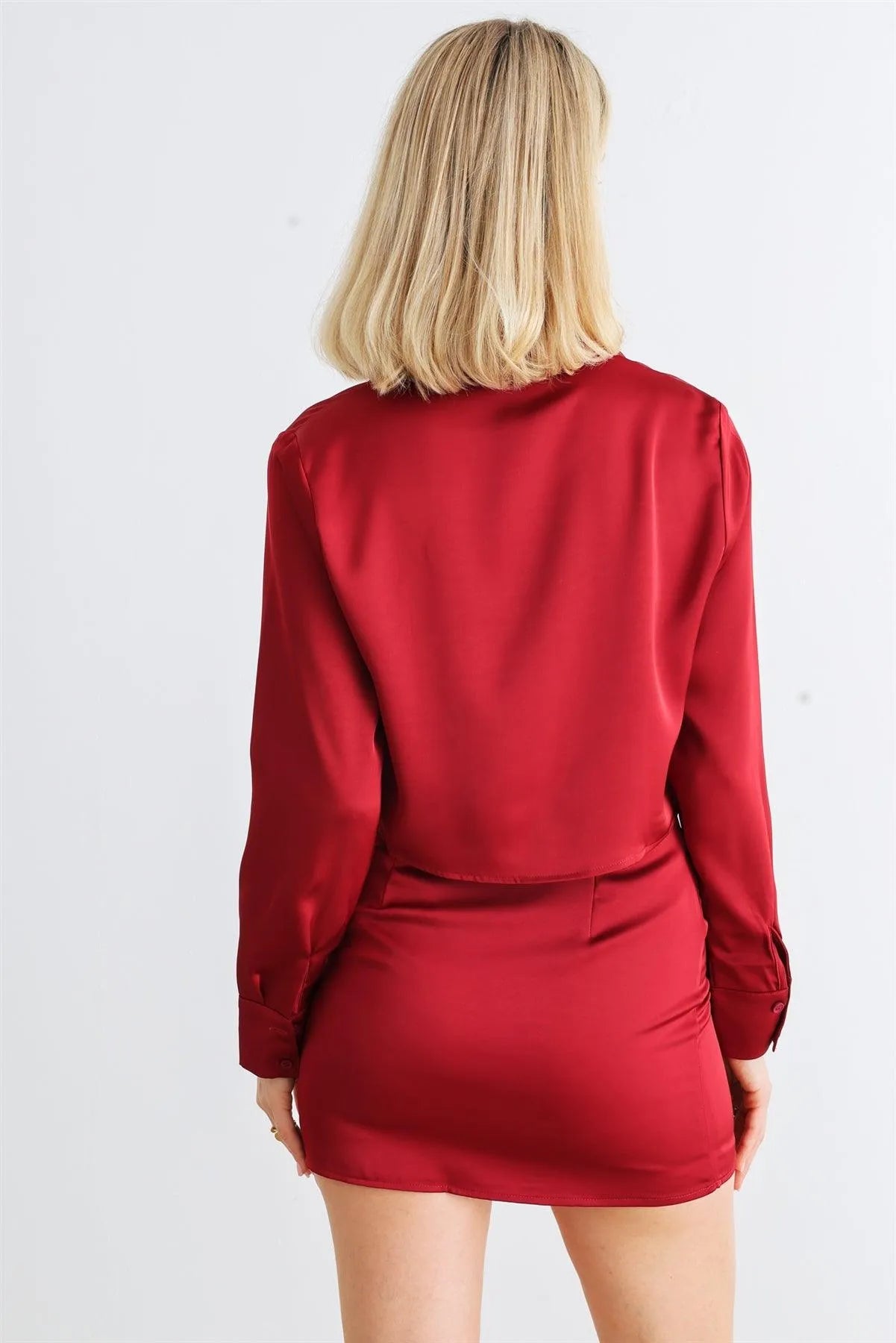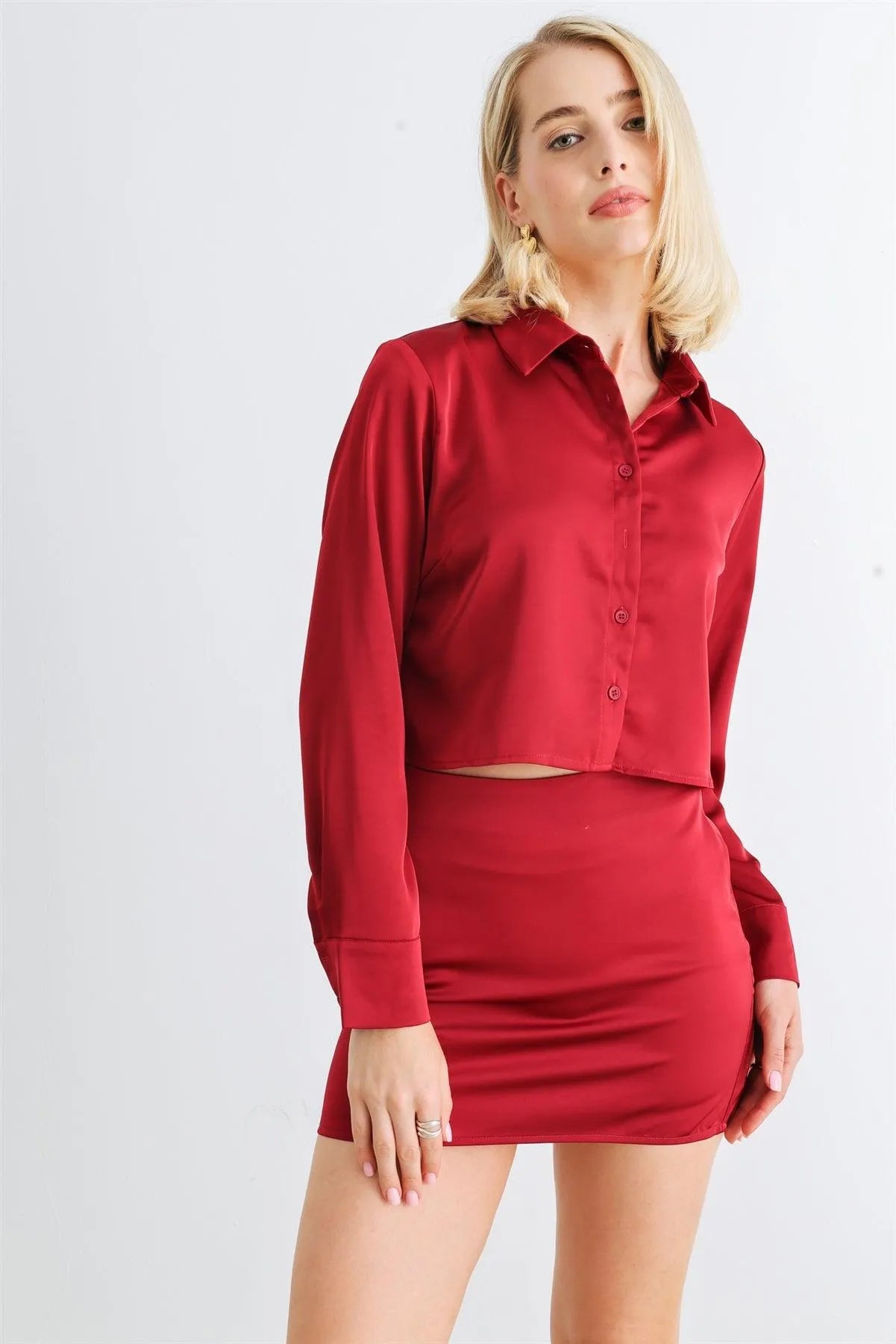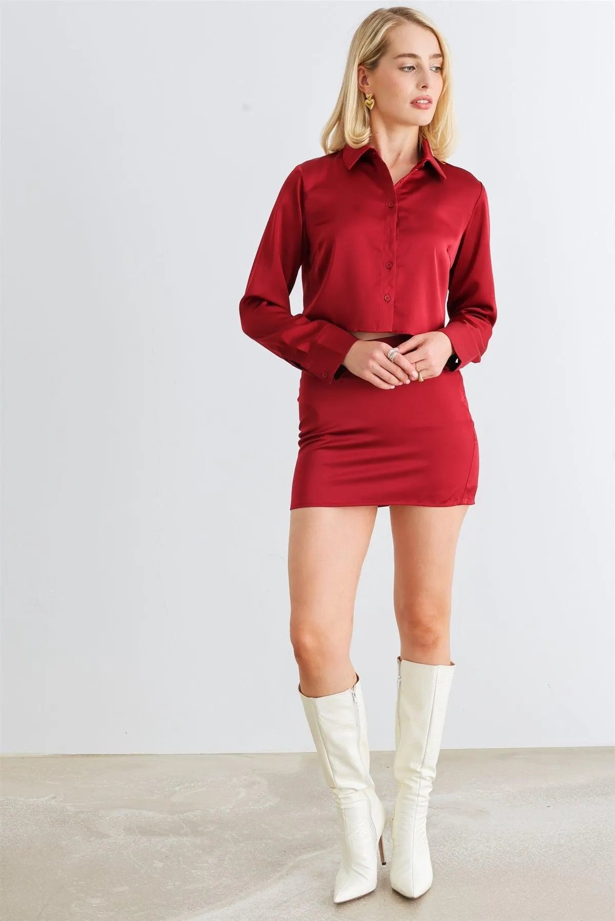 Crimson Satin Button-Up Collared Neck Long Sleeve Crop Top & High Waist Mini Skirt Set /1-2-2-1