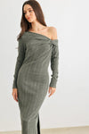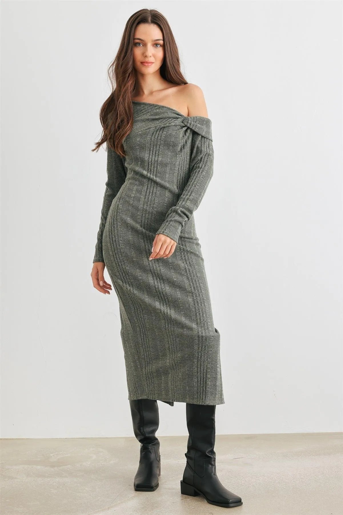 Dark Olive Ribbed Knit One Shoulder Long Sleeve Twist Detail Midi Dress /2-2-4