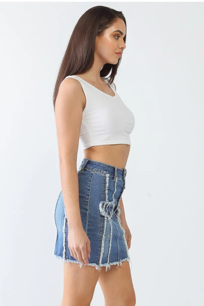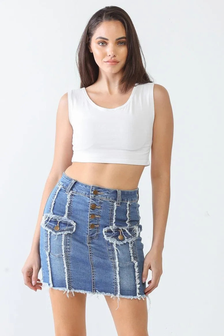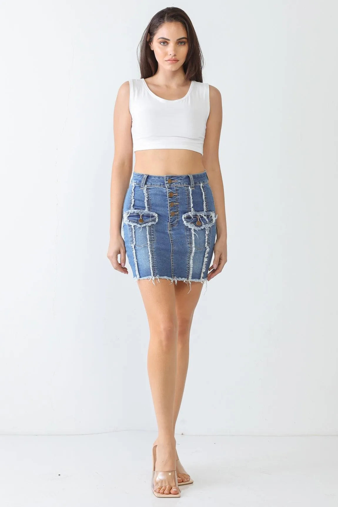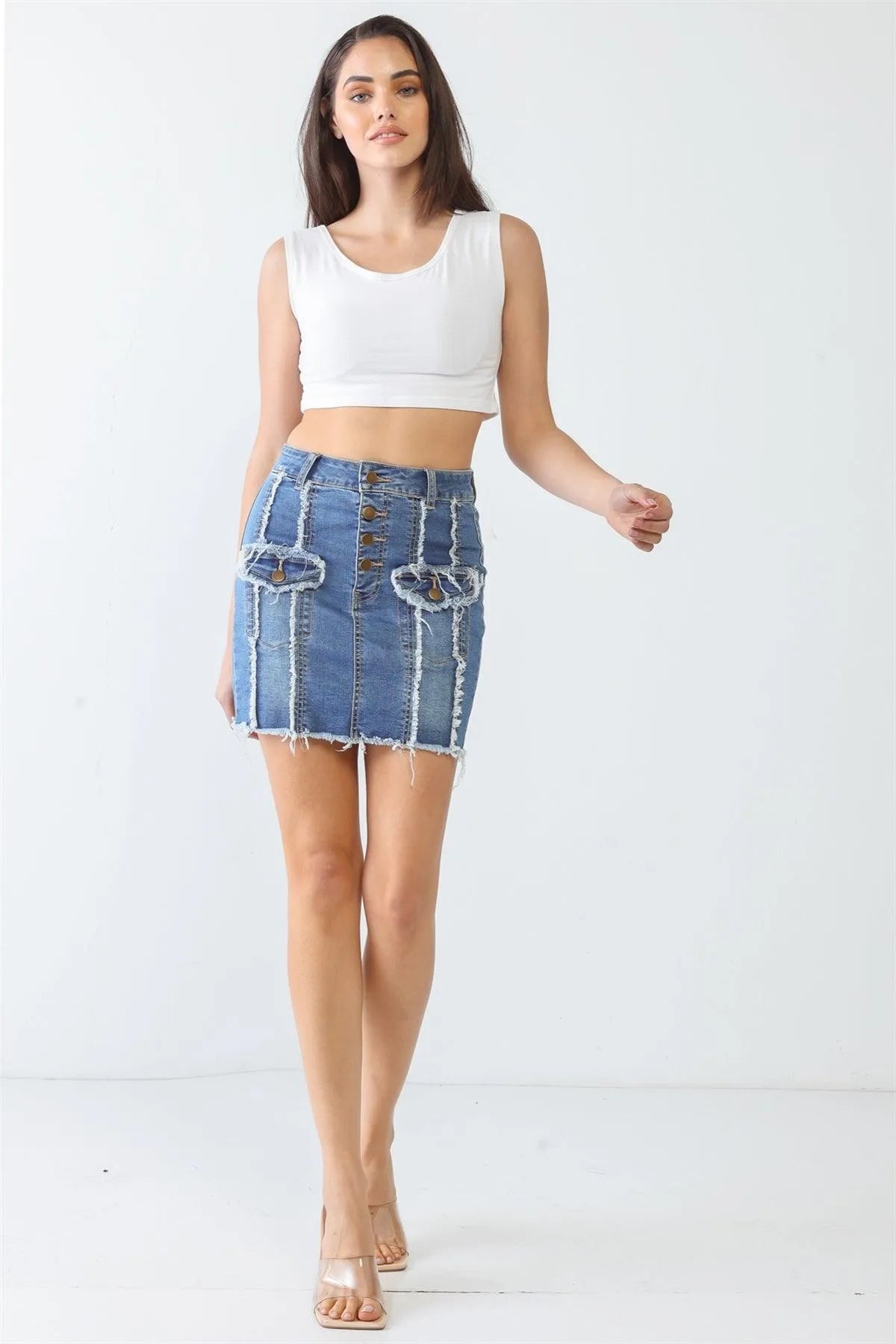 Denim Cotton Button Two Pocket Trim High Waist Mini Skirt /3-2-1