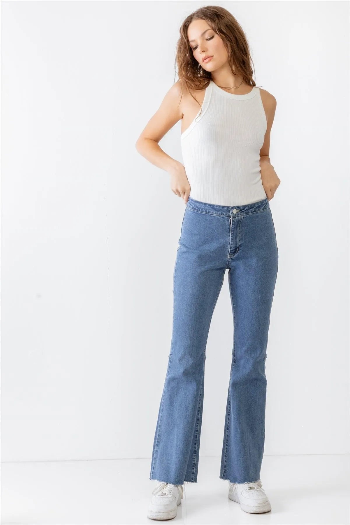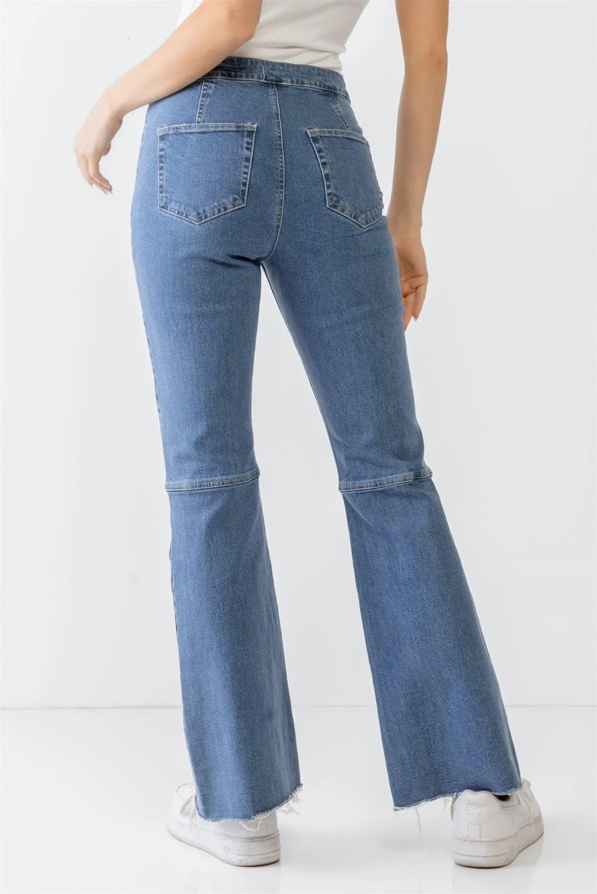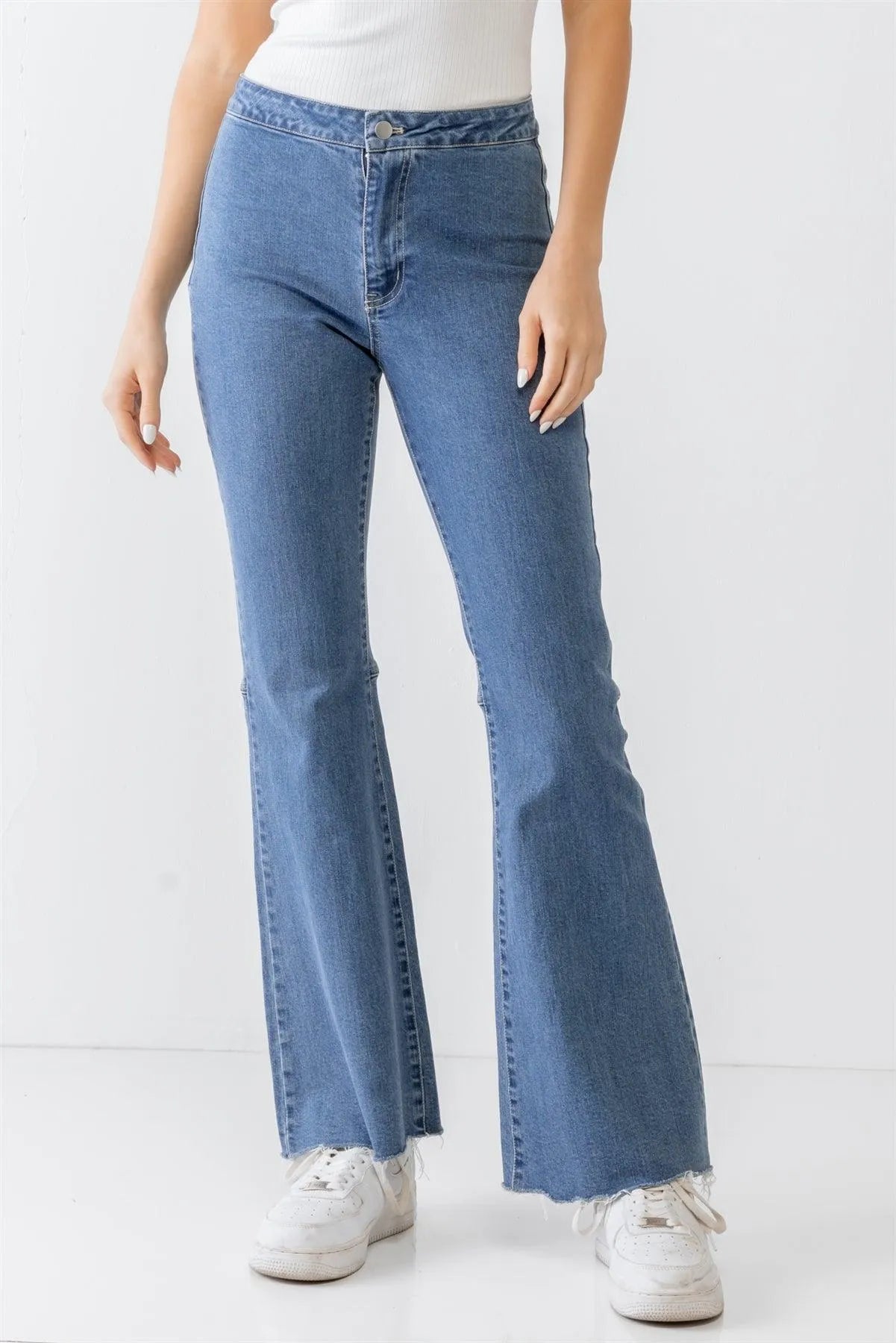 🖤 Item Features: Denim, cotton fabric, high waist fit, front zip-up and button closure, two back pockets, belt loops, raw flare hem, unlined, semi-stretchy, casual, denim look, comfy, cool