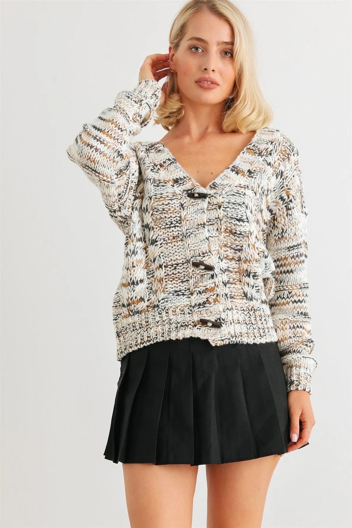 Denim Mix Crochet Knit Wooden Button-Up Soft To Touch Cardigan /2-2-2