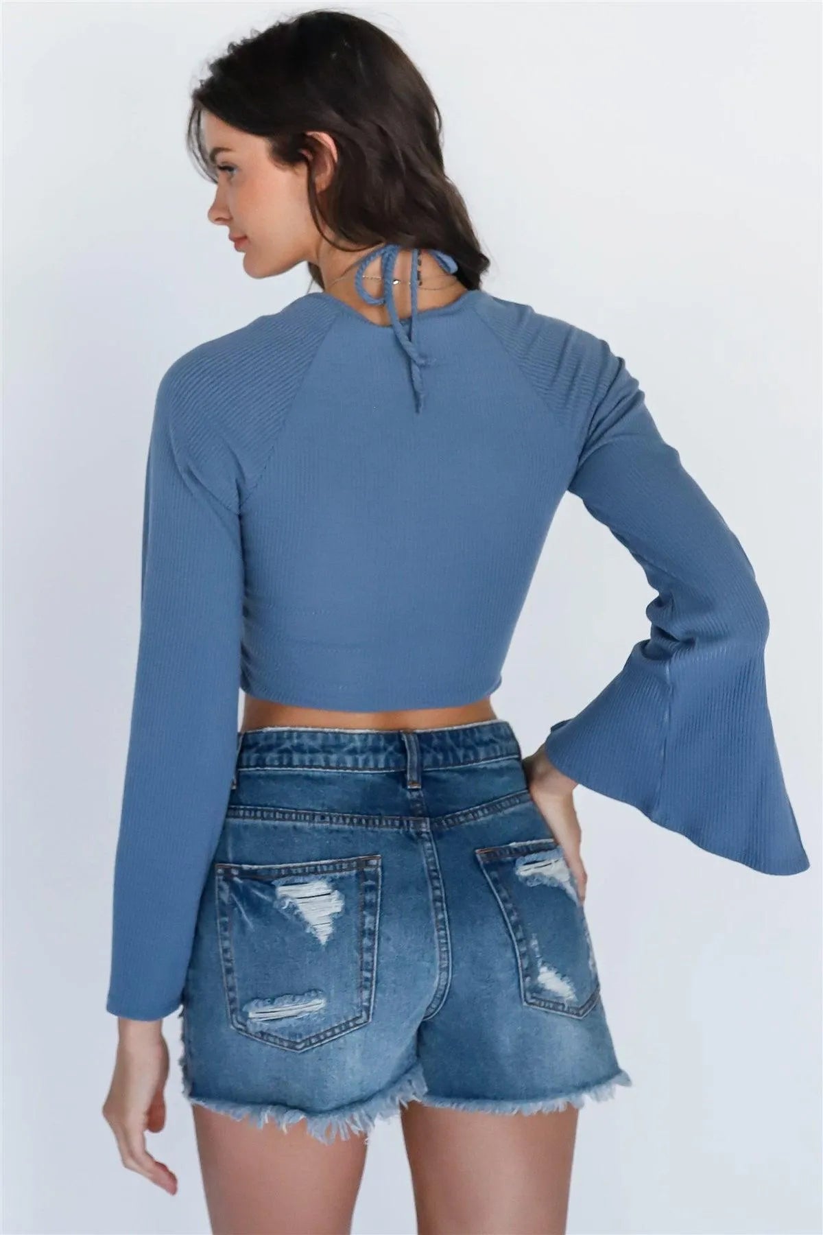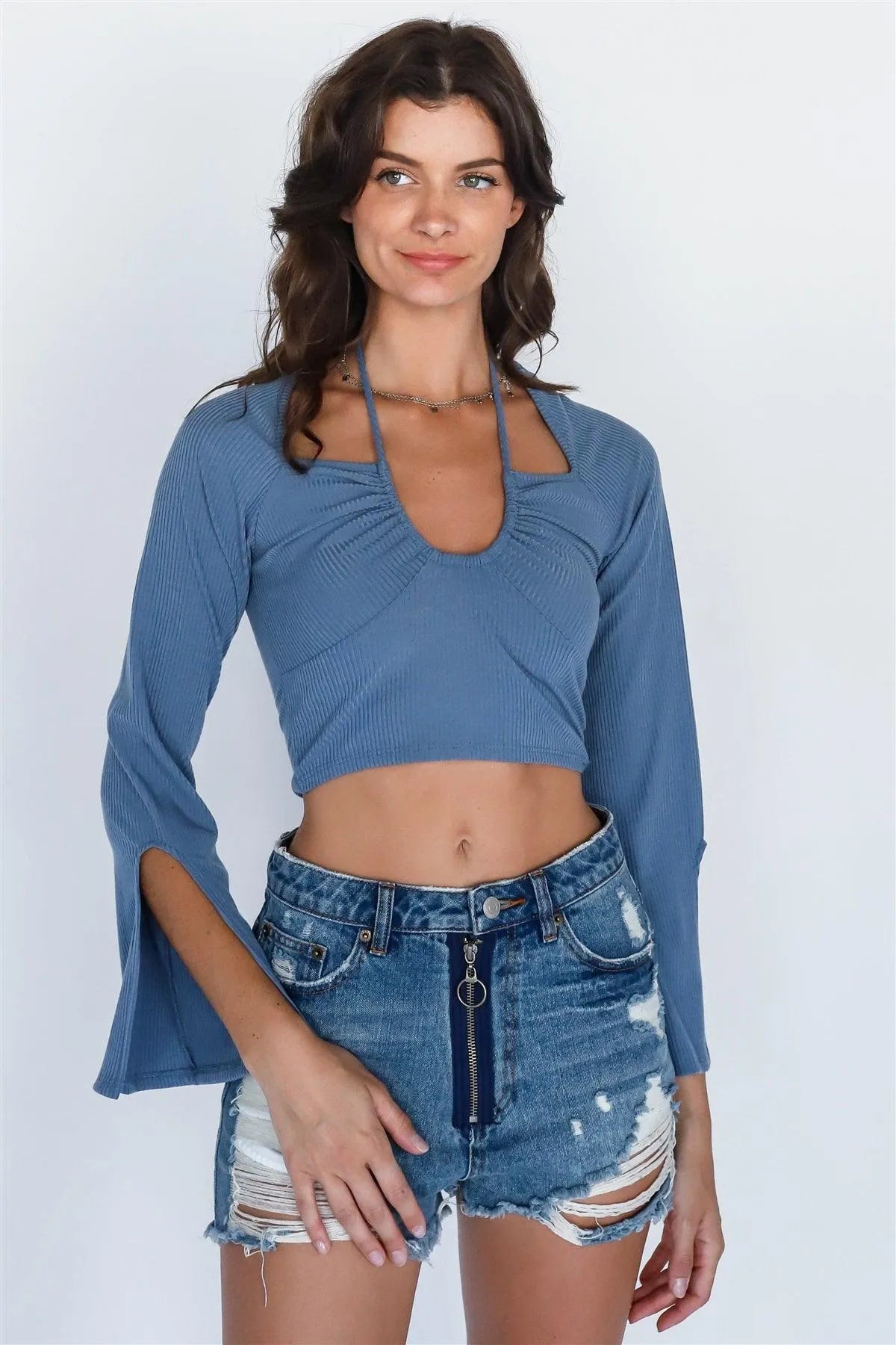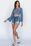 Denim Ribbed Ruched Long Sleeve Crop Top /3-2-1