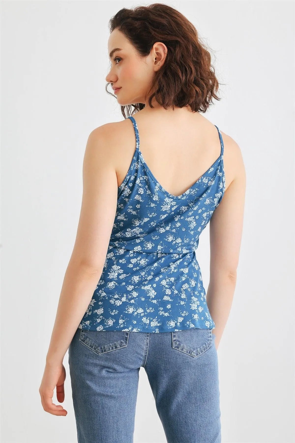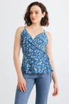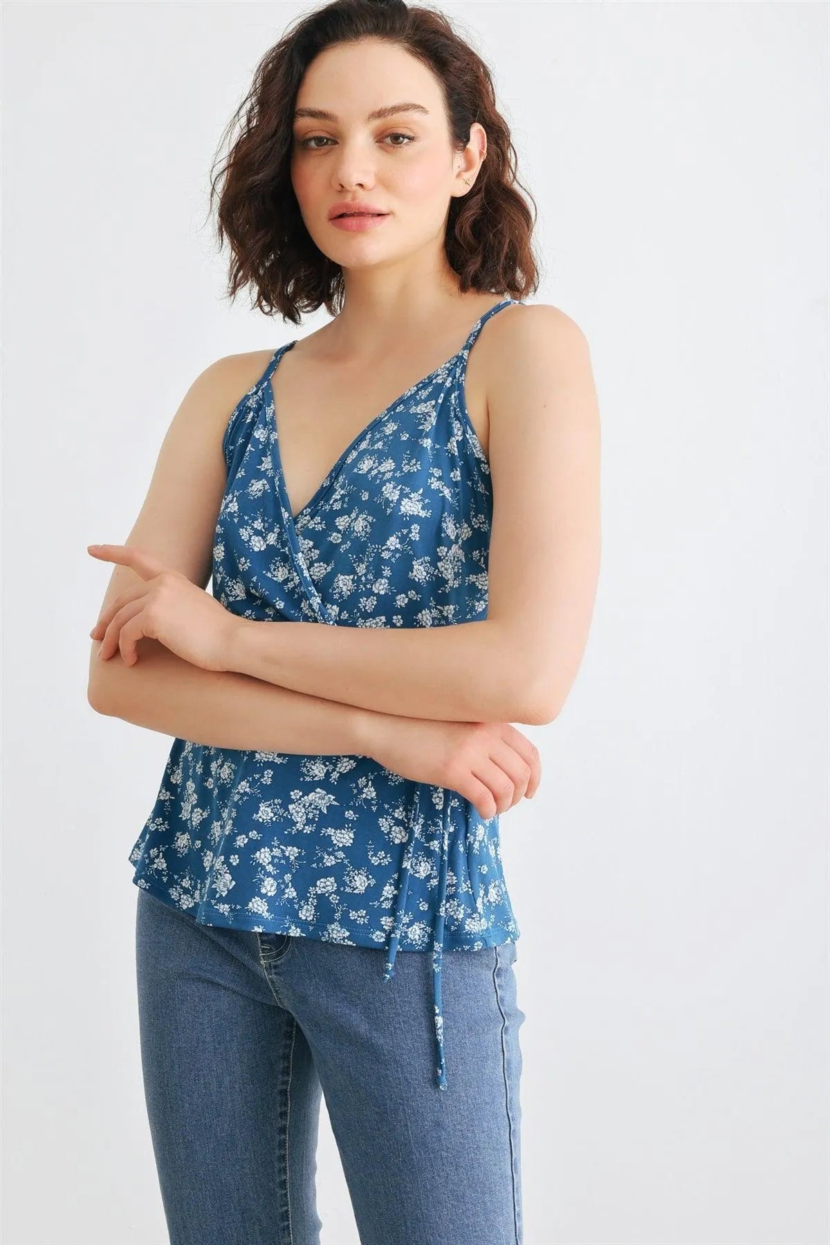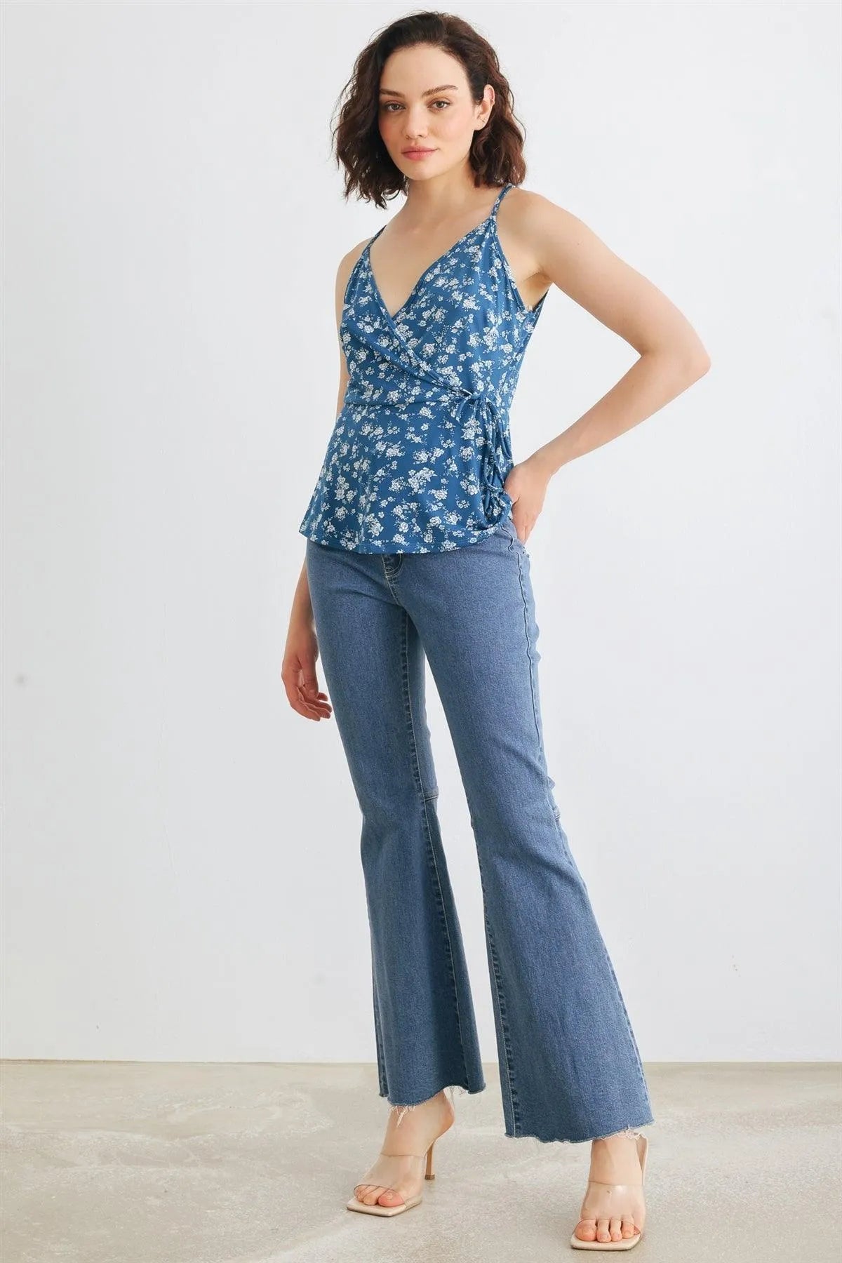 Denim & White Floral Sleeveless Wrap Tie Neck Top /2-2-2