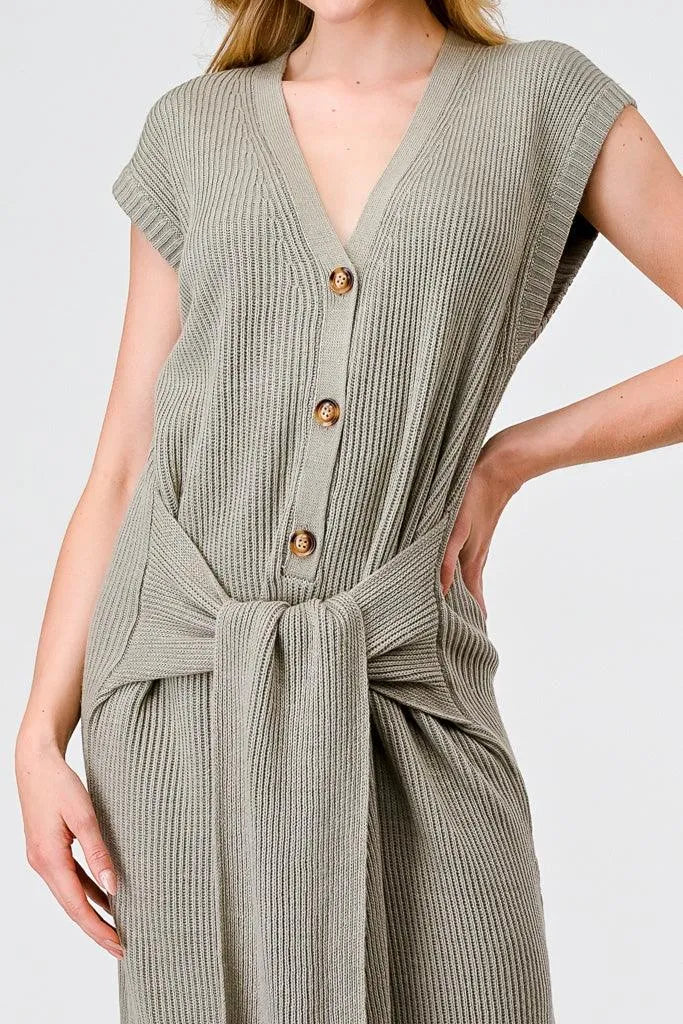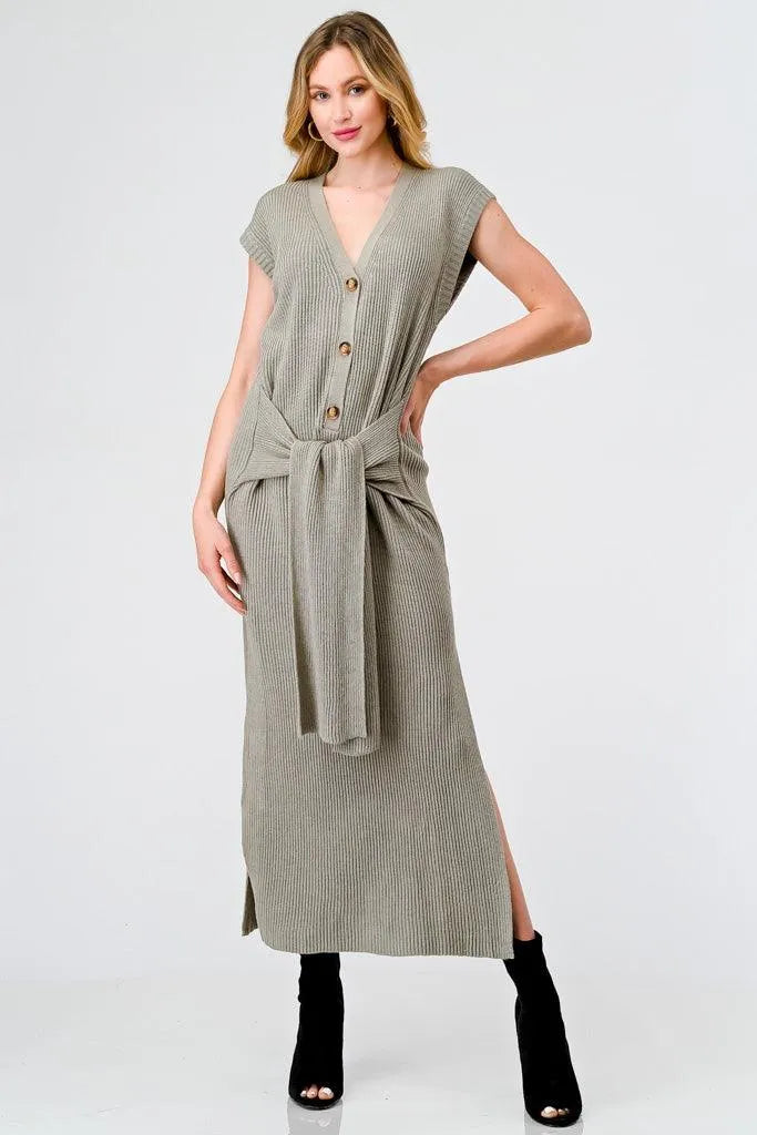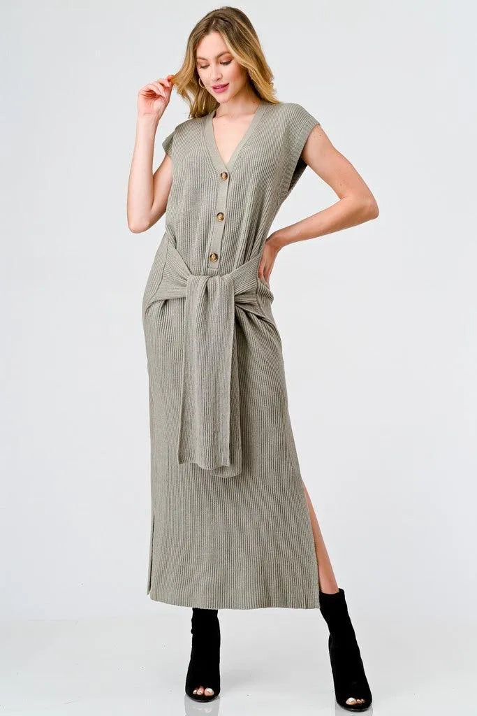 Dusty Olive Knit Button-Up Sleeveless Belted Midi Sweater Dress /3-2-1