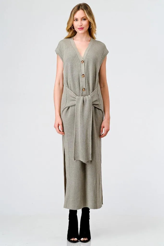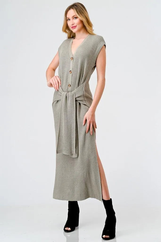 🖤 Item Features: Dusty olive, knit material, cotton blend, contrast button-up v-neckline, sleeveless, belted, side slits, midi length, semi-stretchy, unlined, casual, cute, warm, cozy, stylish, cool, must-have