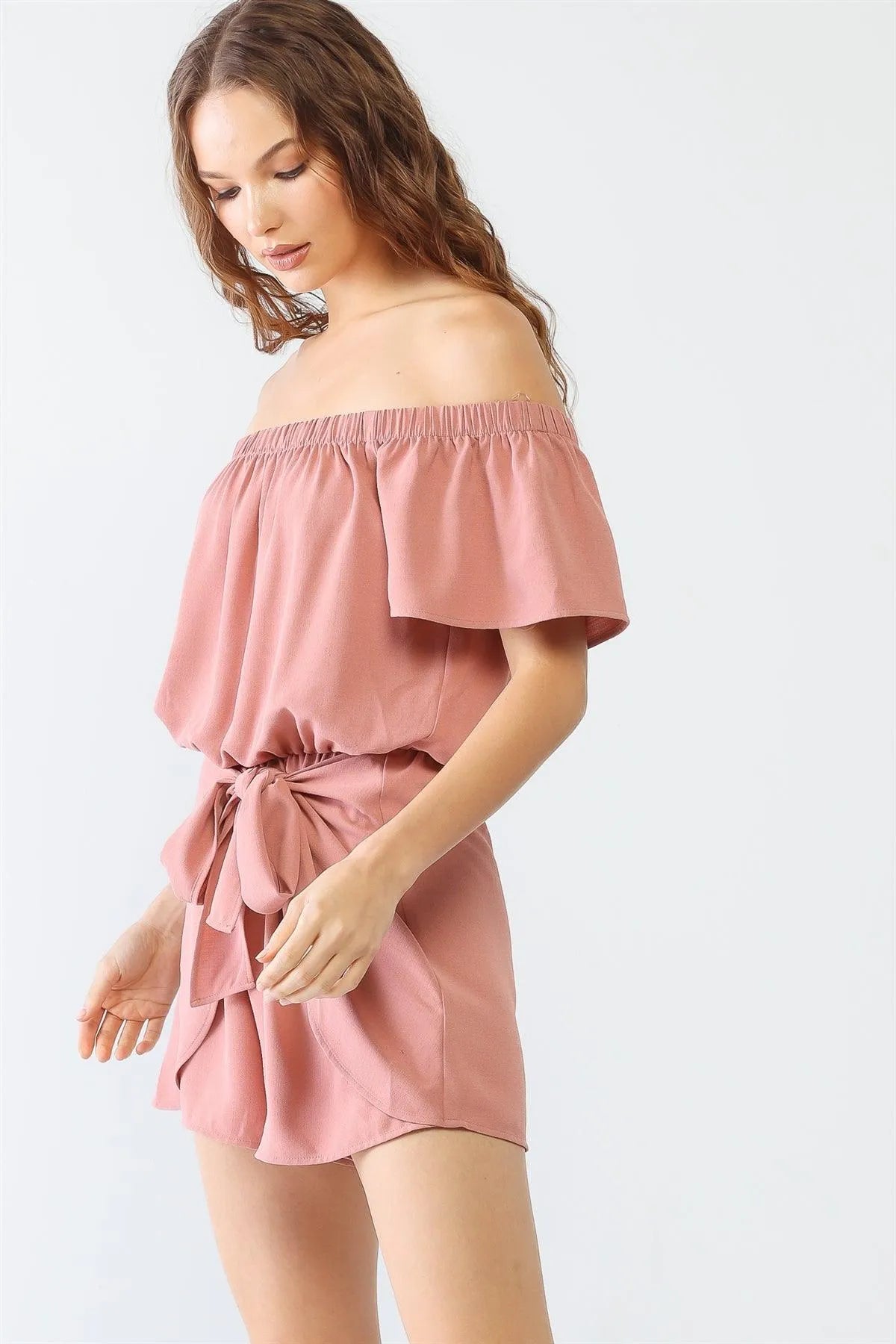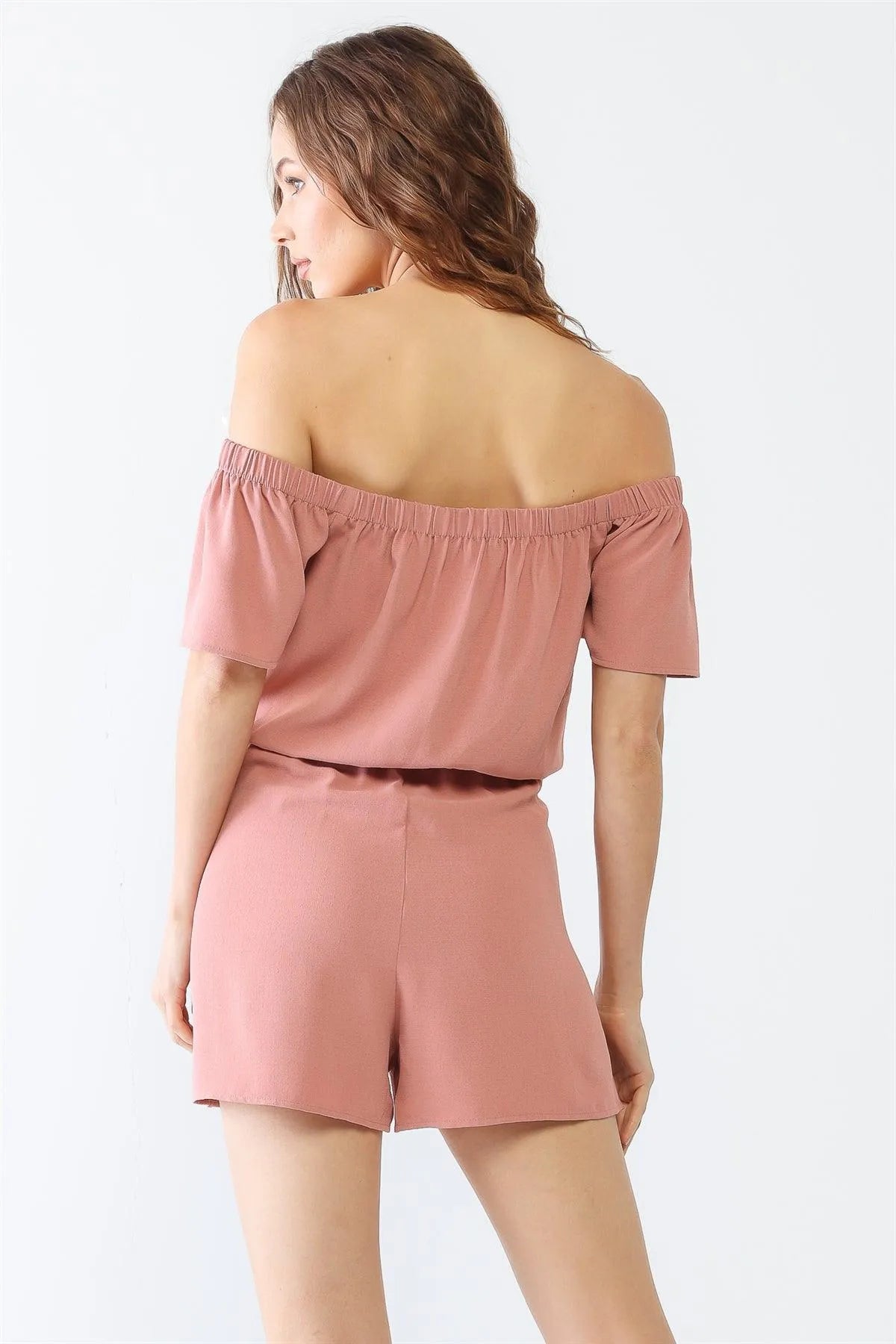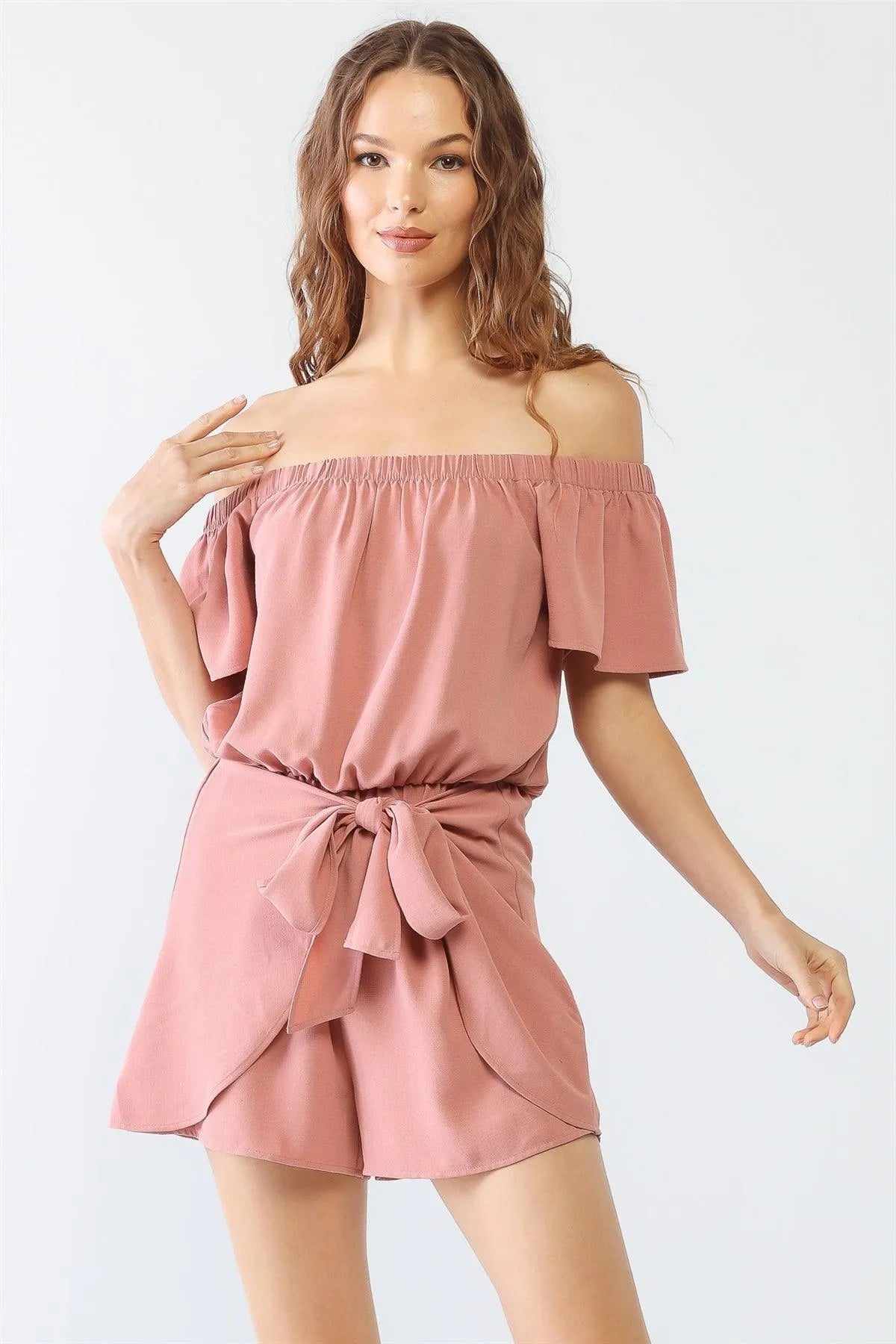 Dusty Peach Off-The-Shoulder Short Sleeve Front Bow Romper /3-1