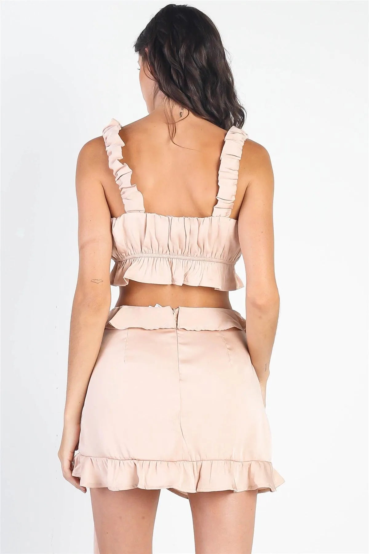 Dusty Peach Satin Effect Ruched Bust Top & Wrap Mini Skirt Set /3-2-1