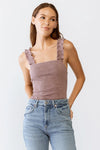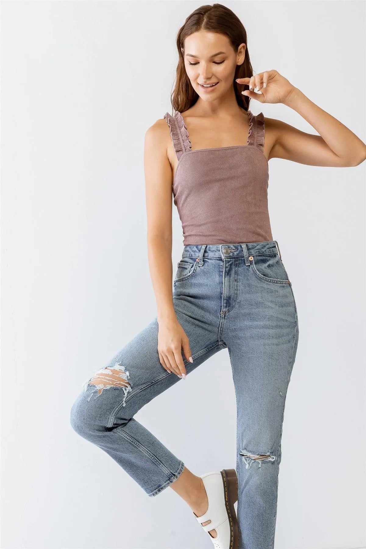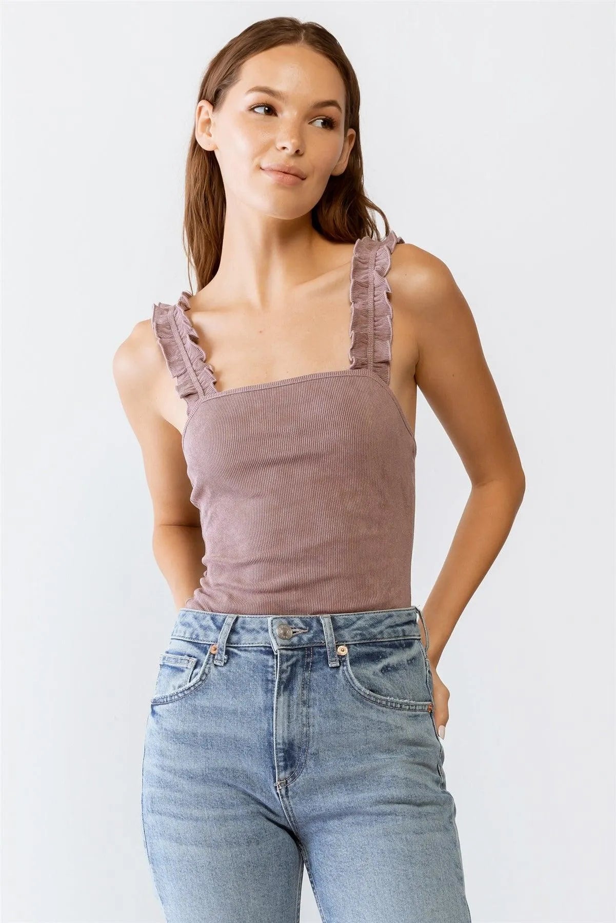 🖤 Item Features: Dusty purple, ribbed, ruffle, sleeveless, thong double snap closure, fitted, semi-stretchy, non-sheer, unlined, casual, basic, cute, everyday look, lifestyle, soft to touch