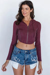 Eggplant Flannel Zip-Up Hooded Crop Top /3-2-1