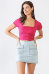 Fuchsia Ruched Short Sleeve Square Neck Crop Top /3-1-1
