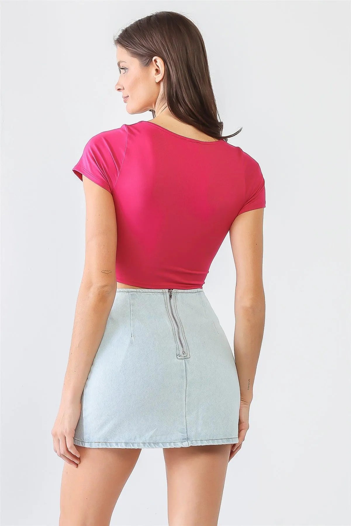 🖤 Item Features: Fuchsia, solid color, ruched, short sleeves, square neckline, cropped length, semi-stretchy, unlined, non-sheer, casual, cute, lifestyle