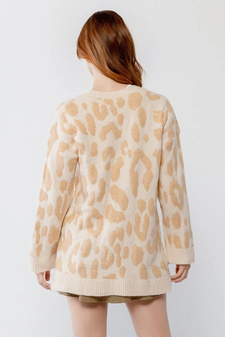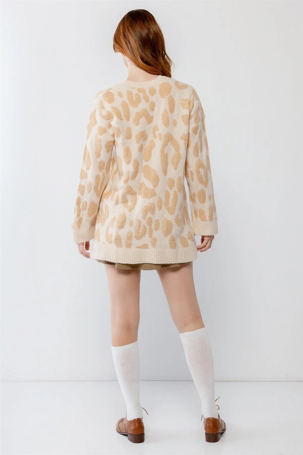 Cream Giraffe Print Front Button-Up Two Pocket Long Sleeve Sweater Cardigan /2-2-2