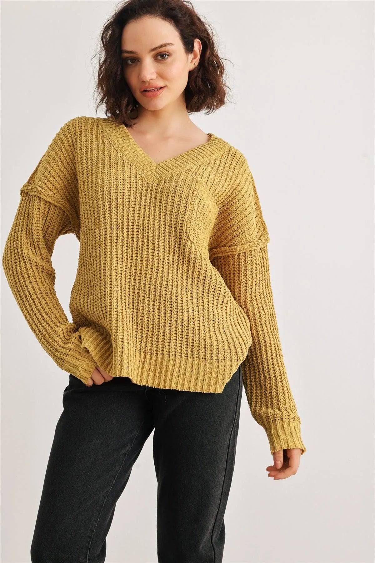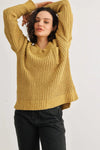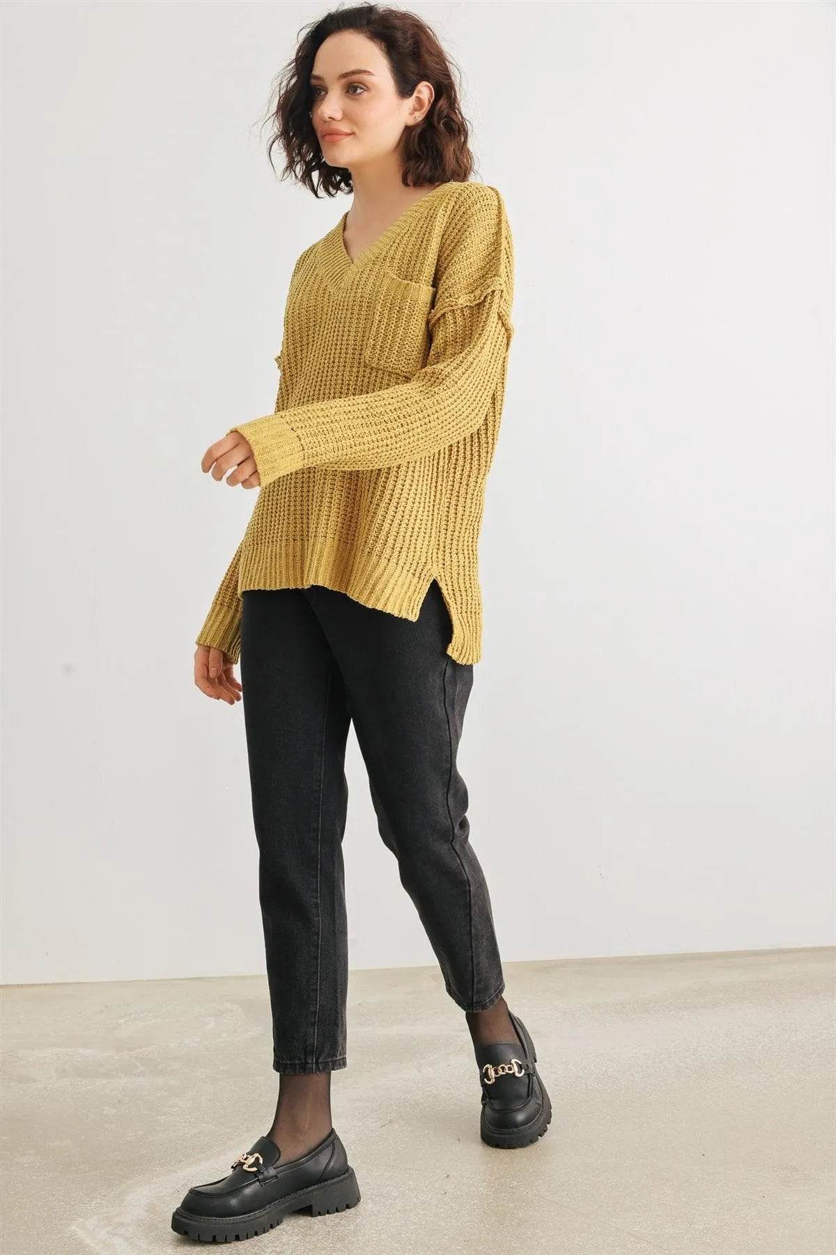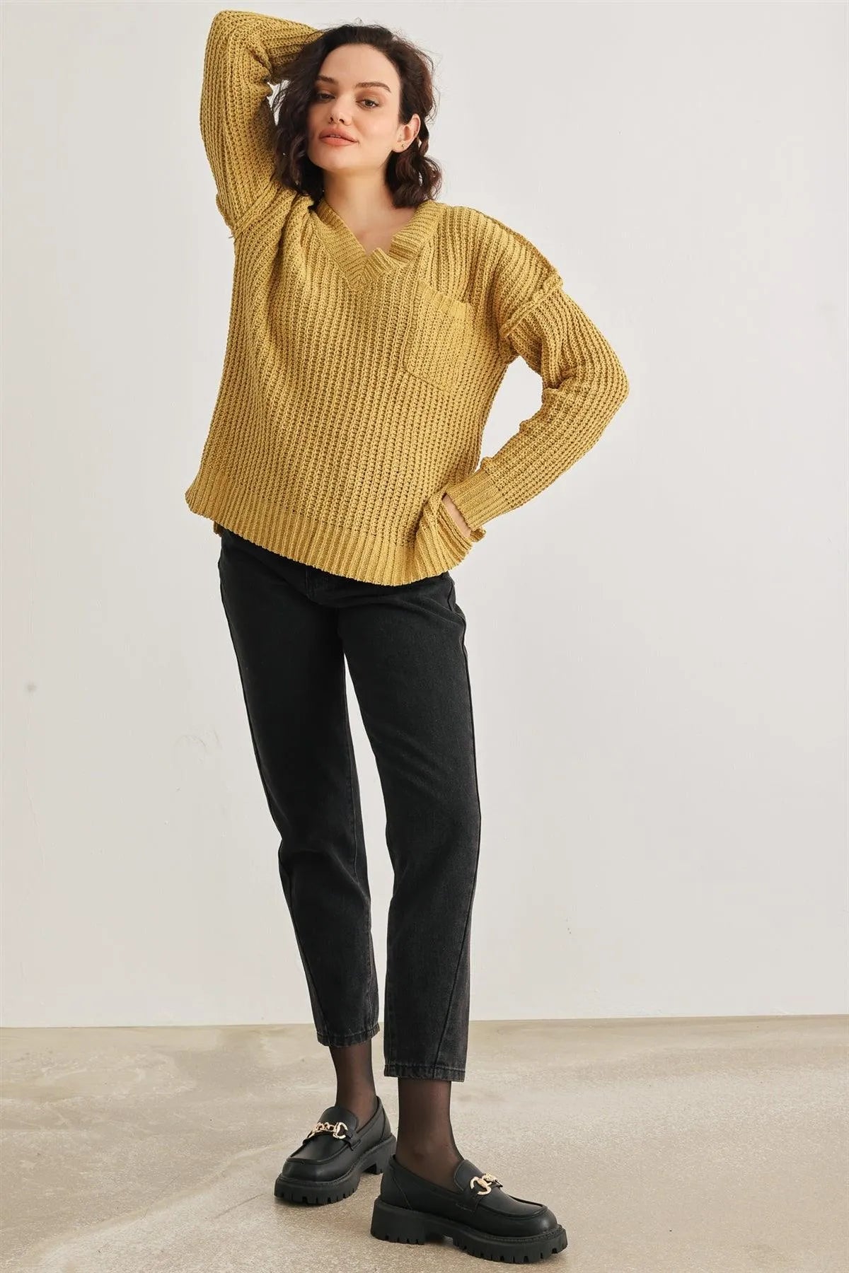 Gold Knit One Pocket Long Sleeve V-Neck Sweater /1-2-2