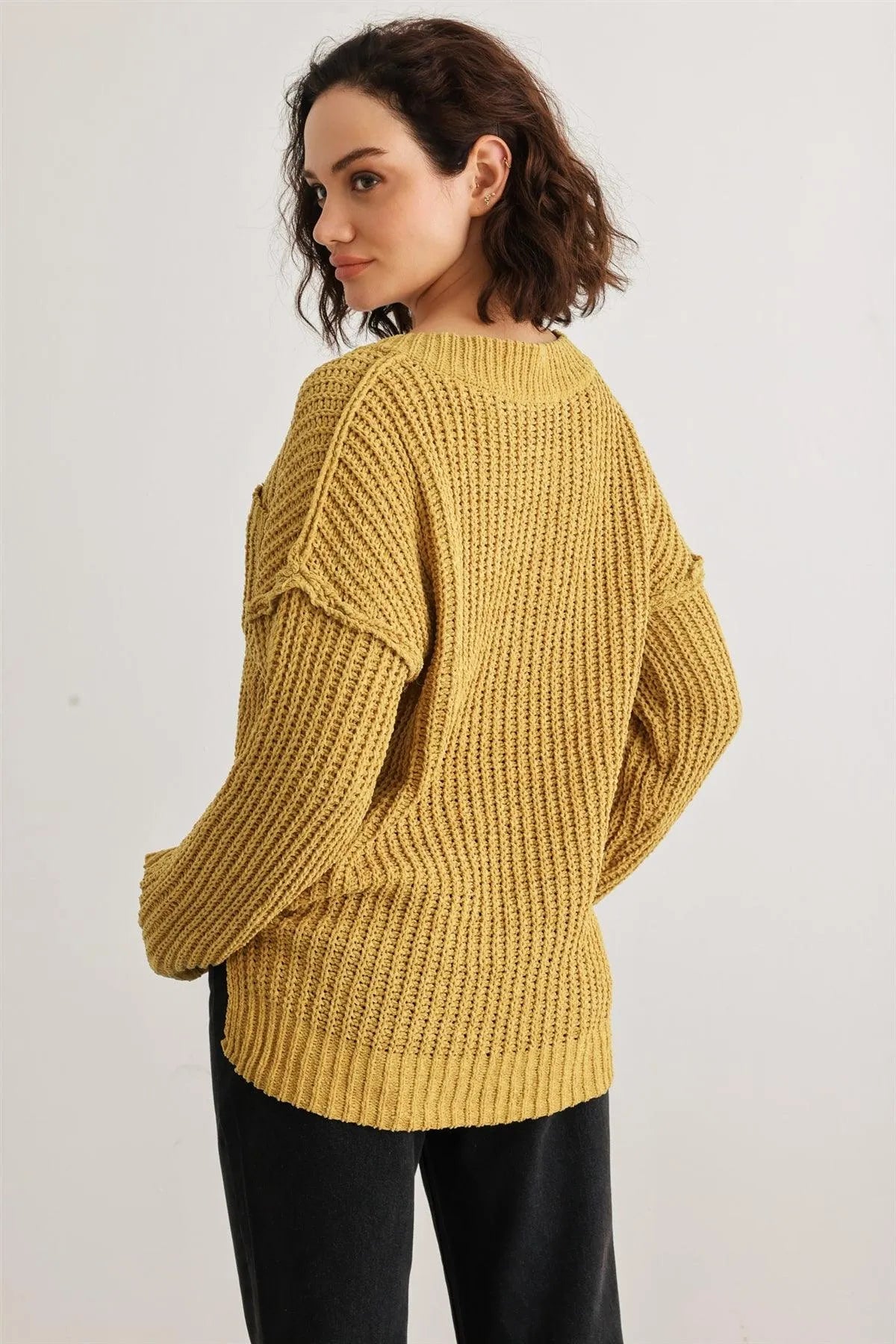🖤 Item Features: Gold, solid color, knit material, long sleeves, dropped shoulders, v-neckline, one pocket front, side slits, semi-stretchy, unlined, casual, cute, warm, cozy
