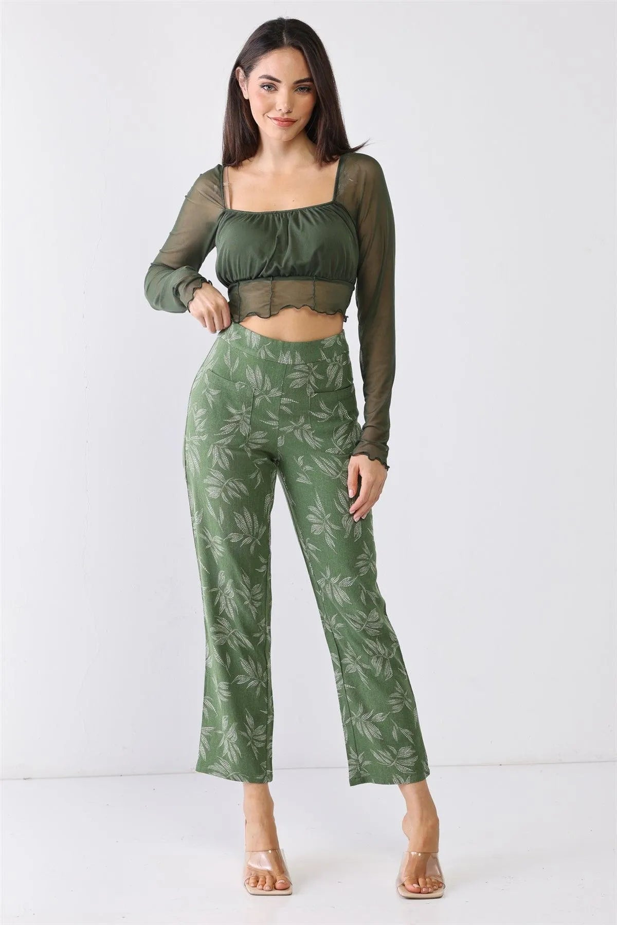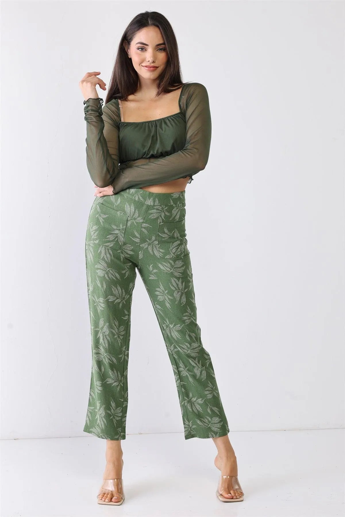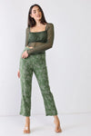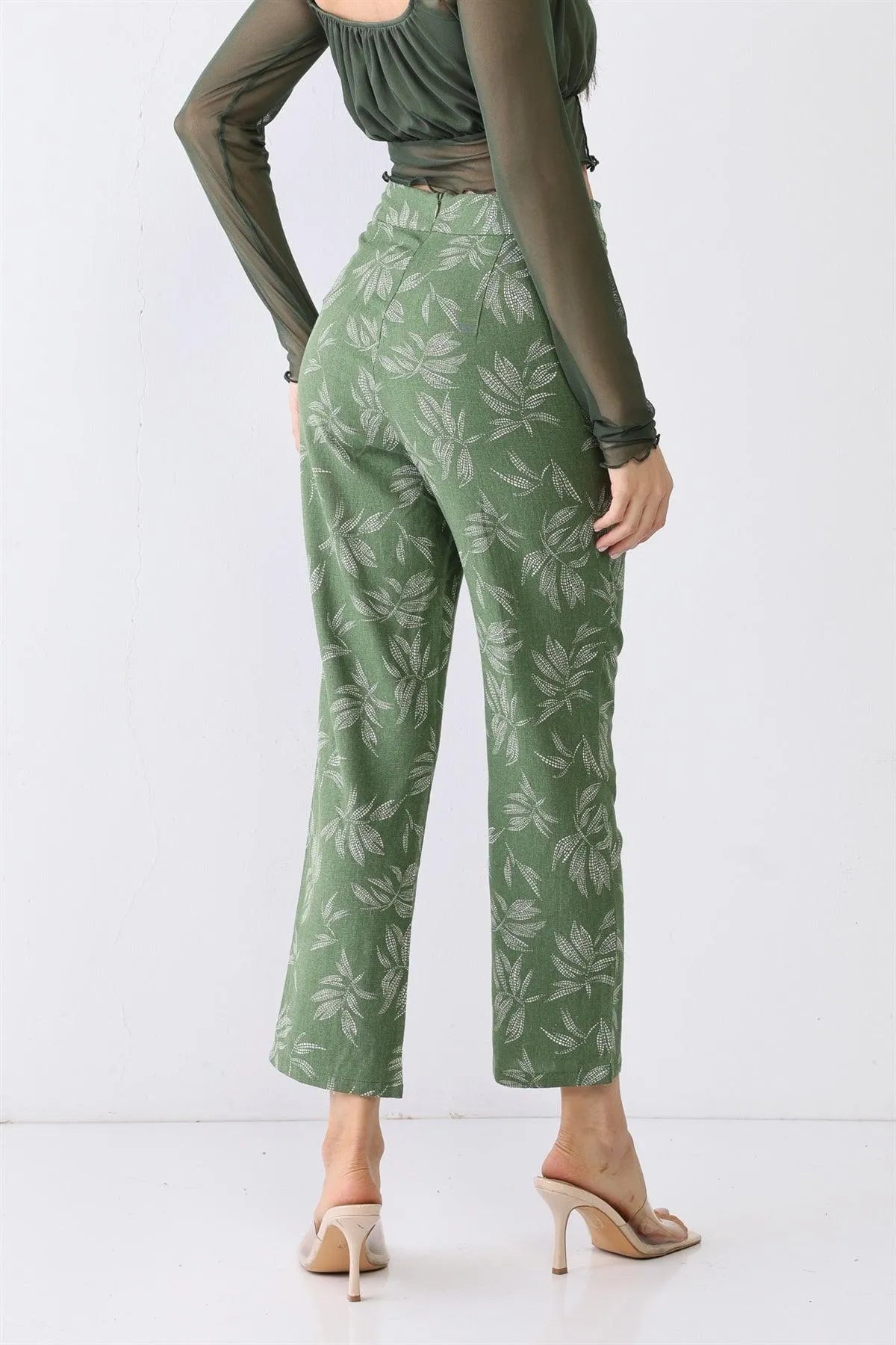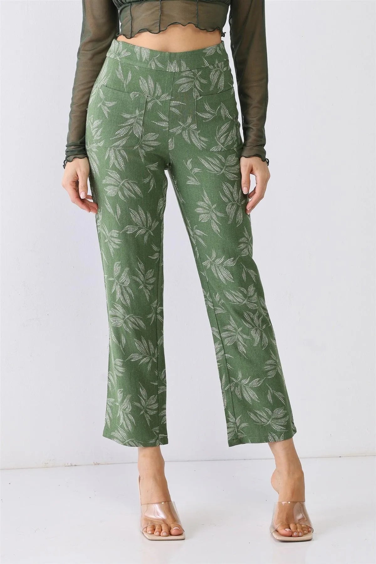 Green Floral Print High Waist Two Pocket Pants /3-2-1