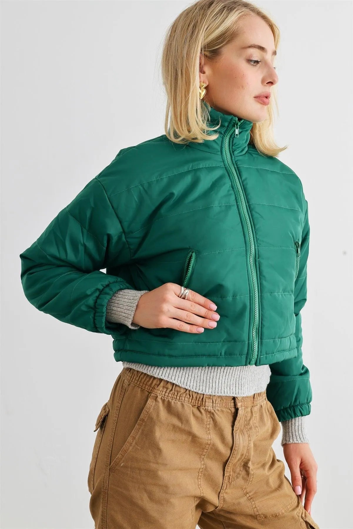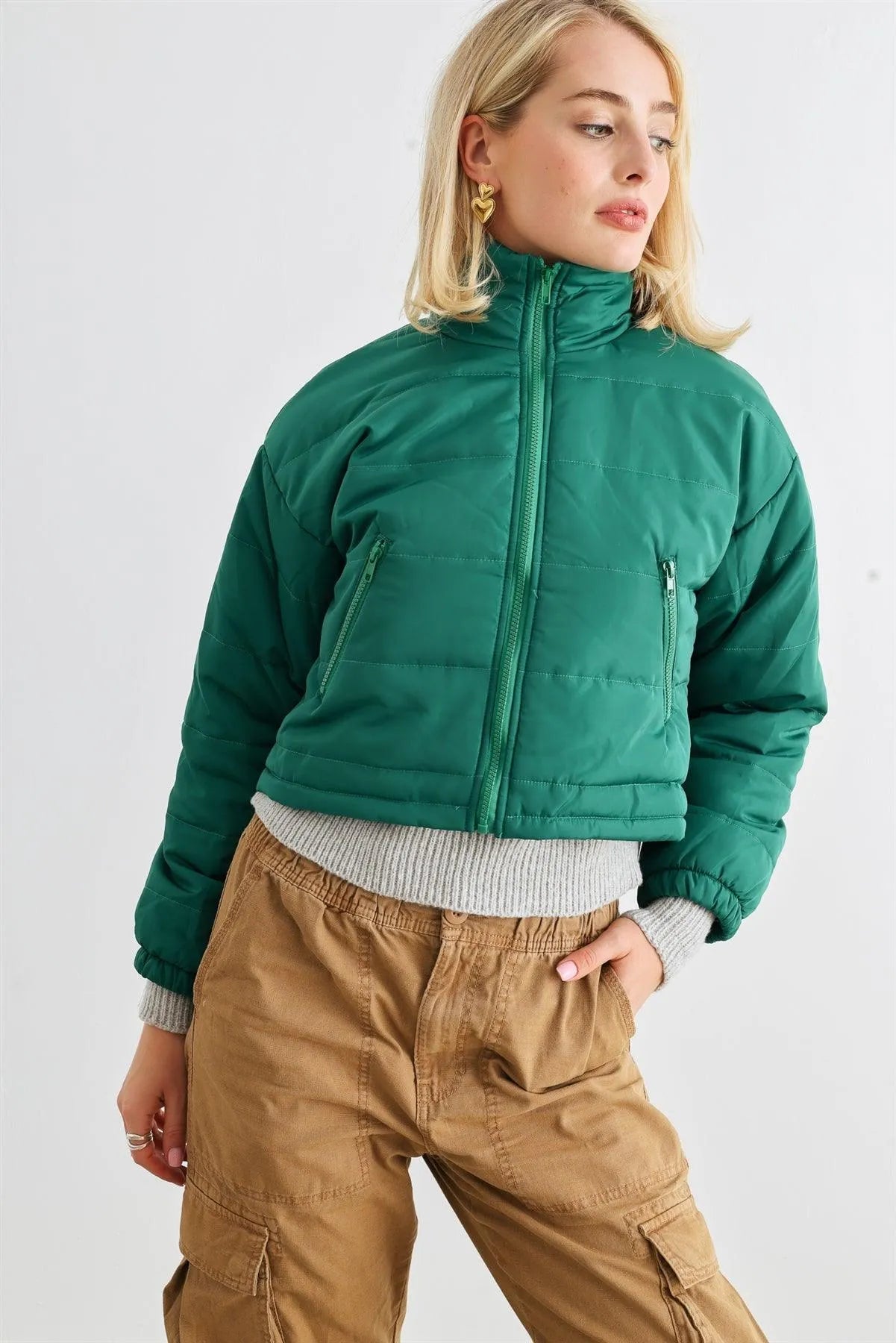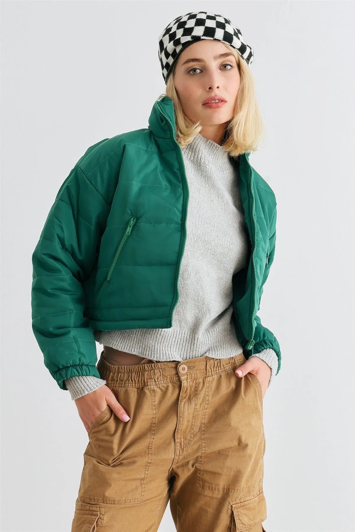 Green Puffer Zip-Up Two Pocket Cropped Jacket /1-2-2-1