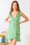 Green Satin Sleeveless V-Neck Criss-Cross Back Wrap Ruffle Hem Mini Dress /3-2-1
