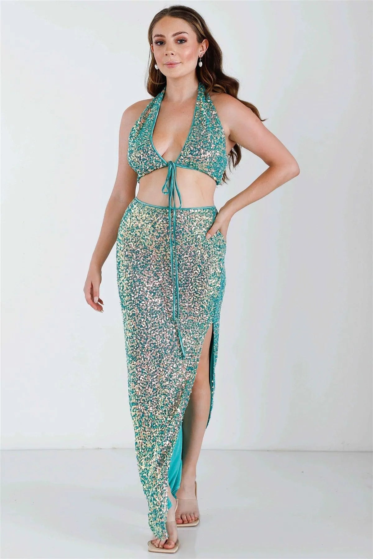 Green Sequin V-Neck Sleeveless Crop Top & High Waist Maxi Skirt Set /3-2-1