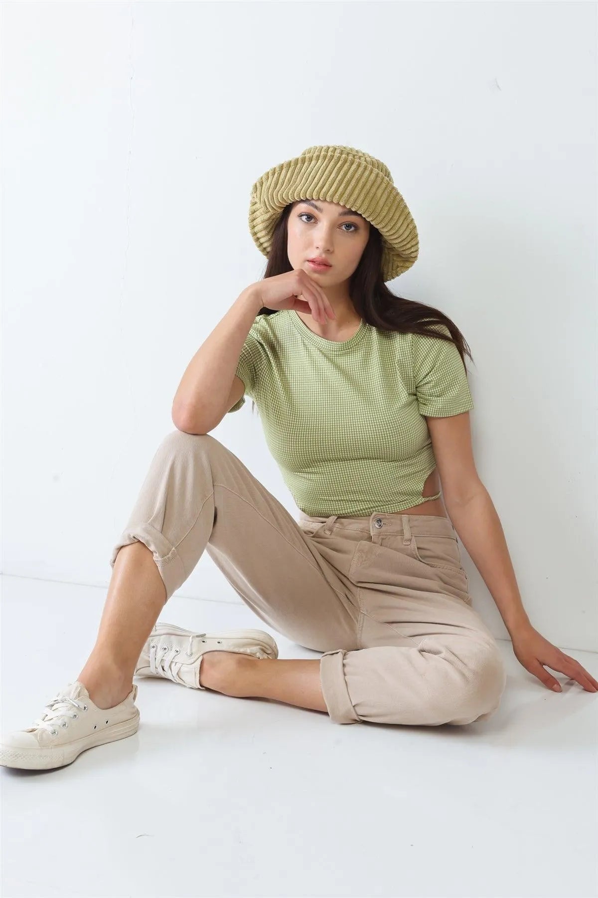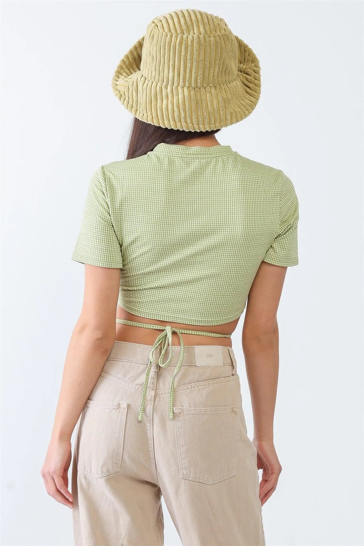 Green & White Plaid Cut-Out Drawstring Hem Crop Top /3-2-1